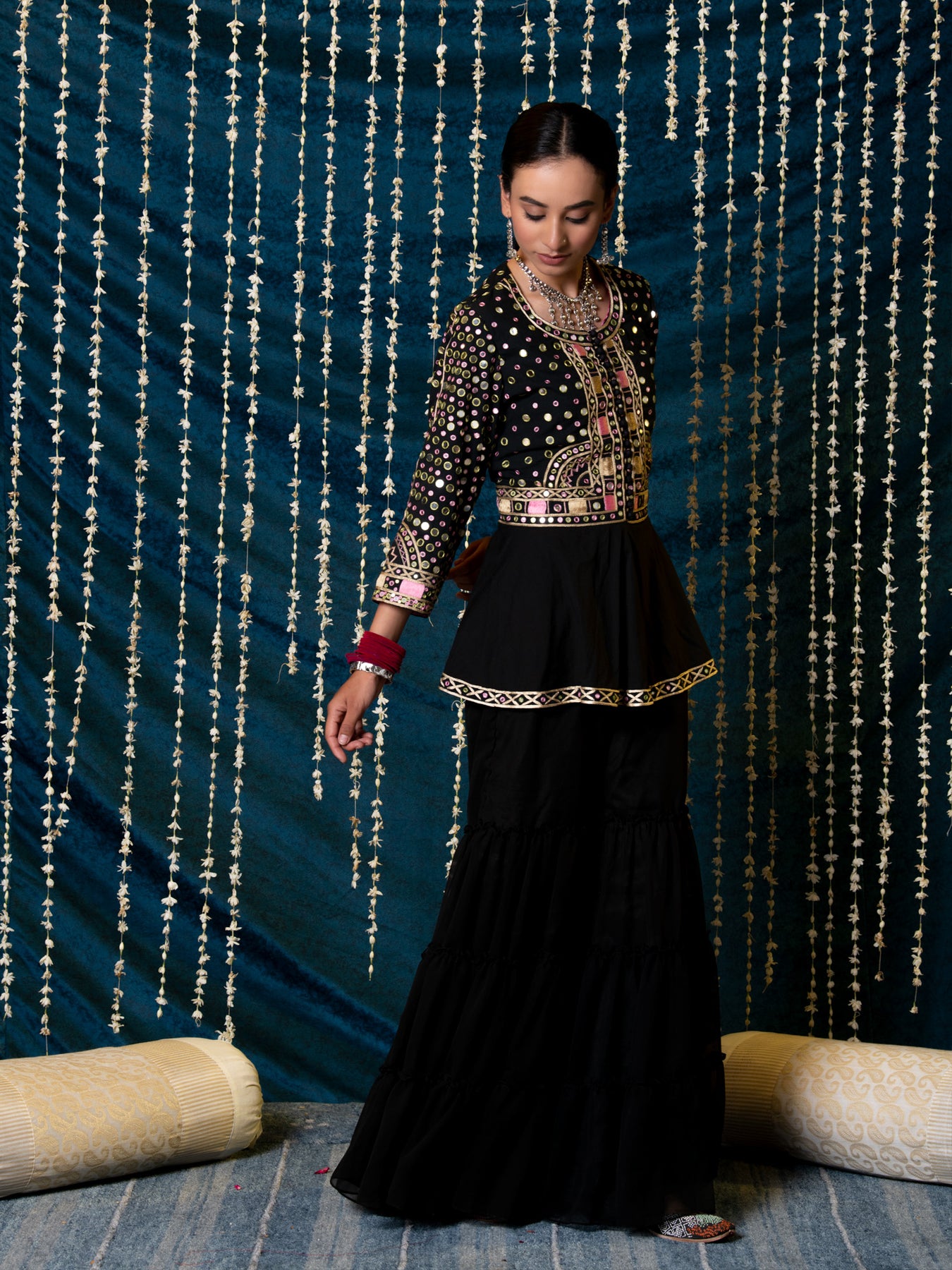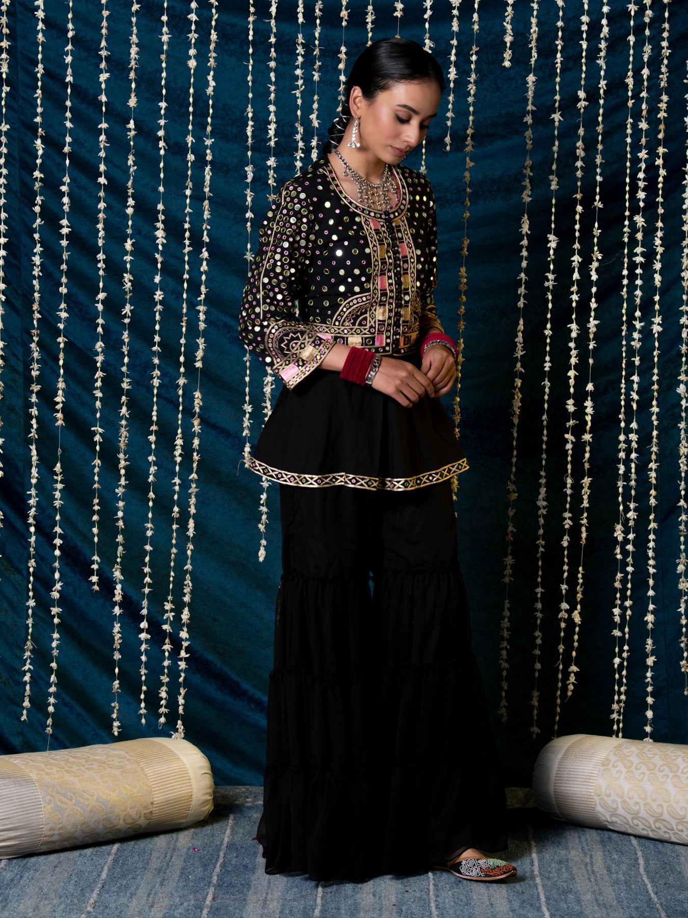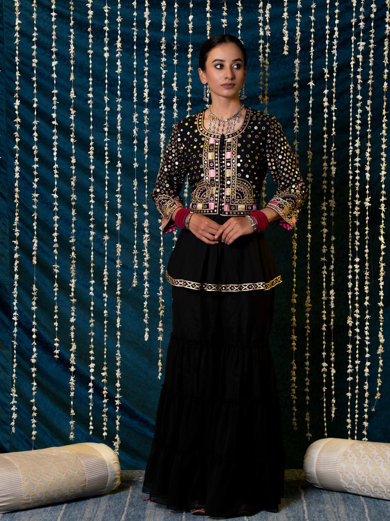TOP: This peplum style black cotton jacket is enhanced with heavy mirror work.. This show stopper piece is a must have in all wardrobes.