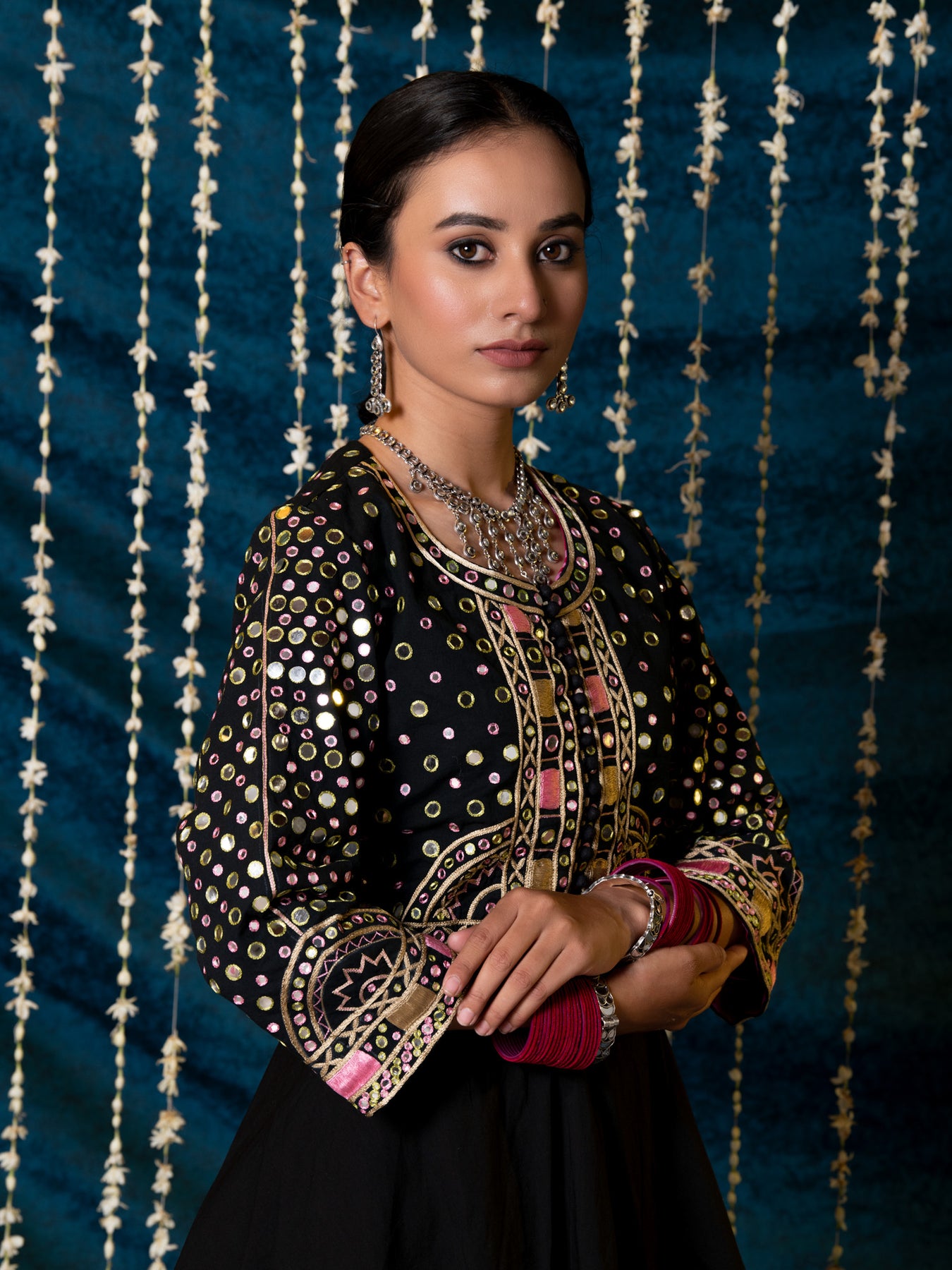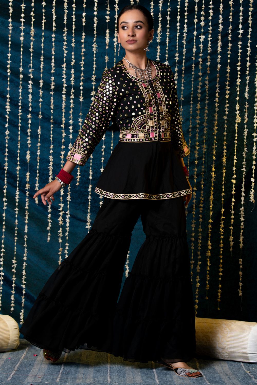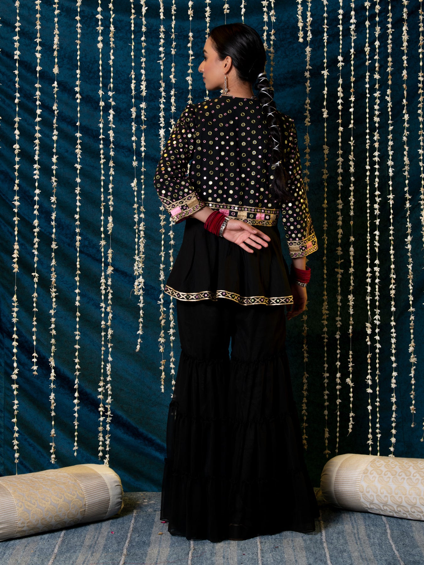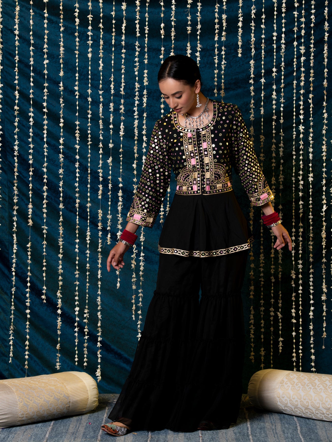TOP: This peplum style black cotton jacket is enhanced with heavy mirror work.. This show stopper piece is a must have in all wardrobes.