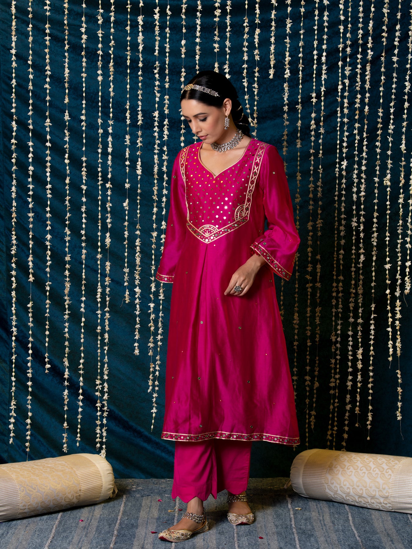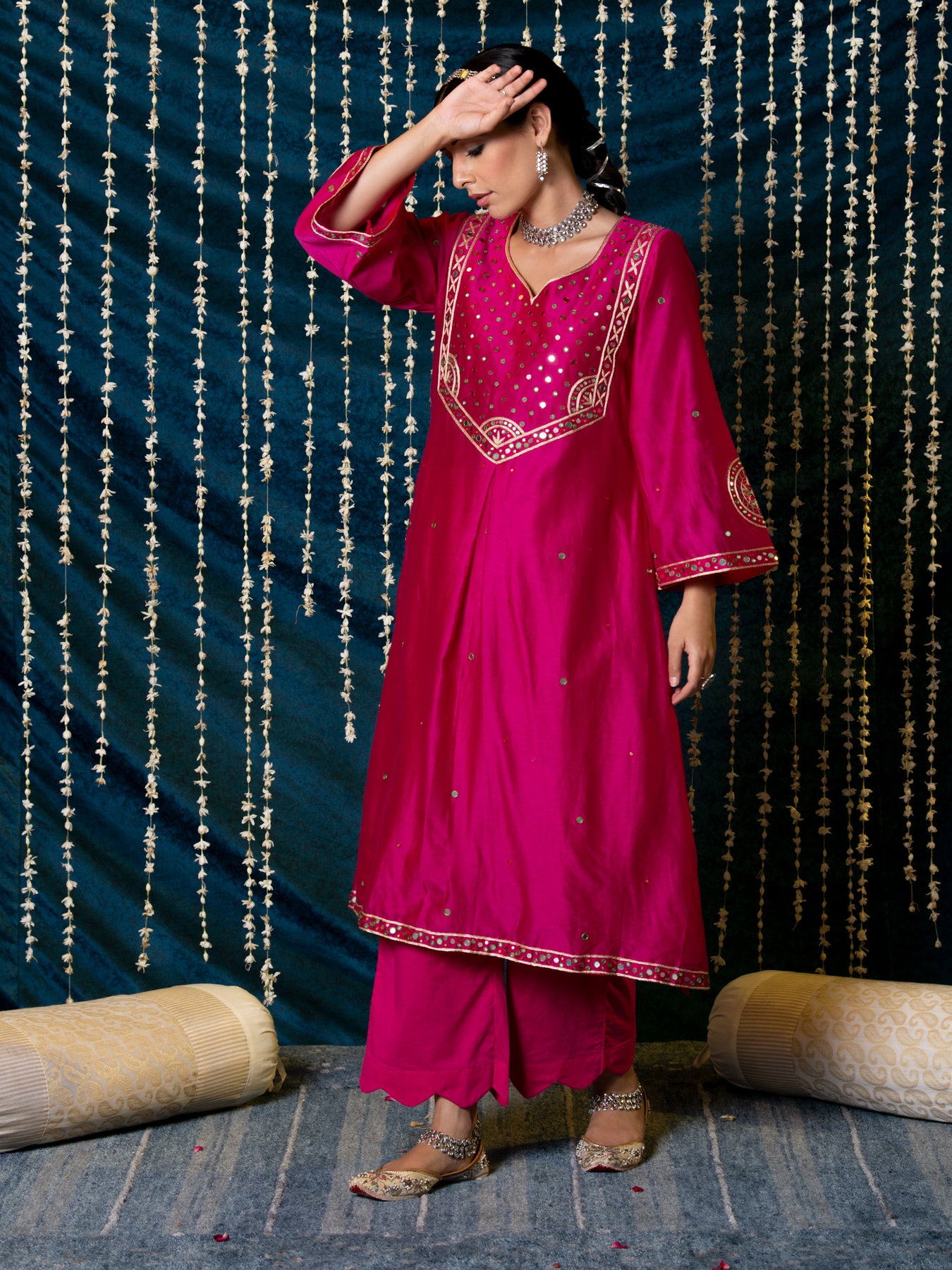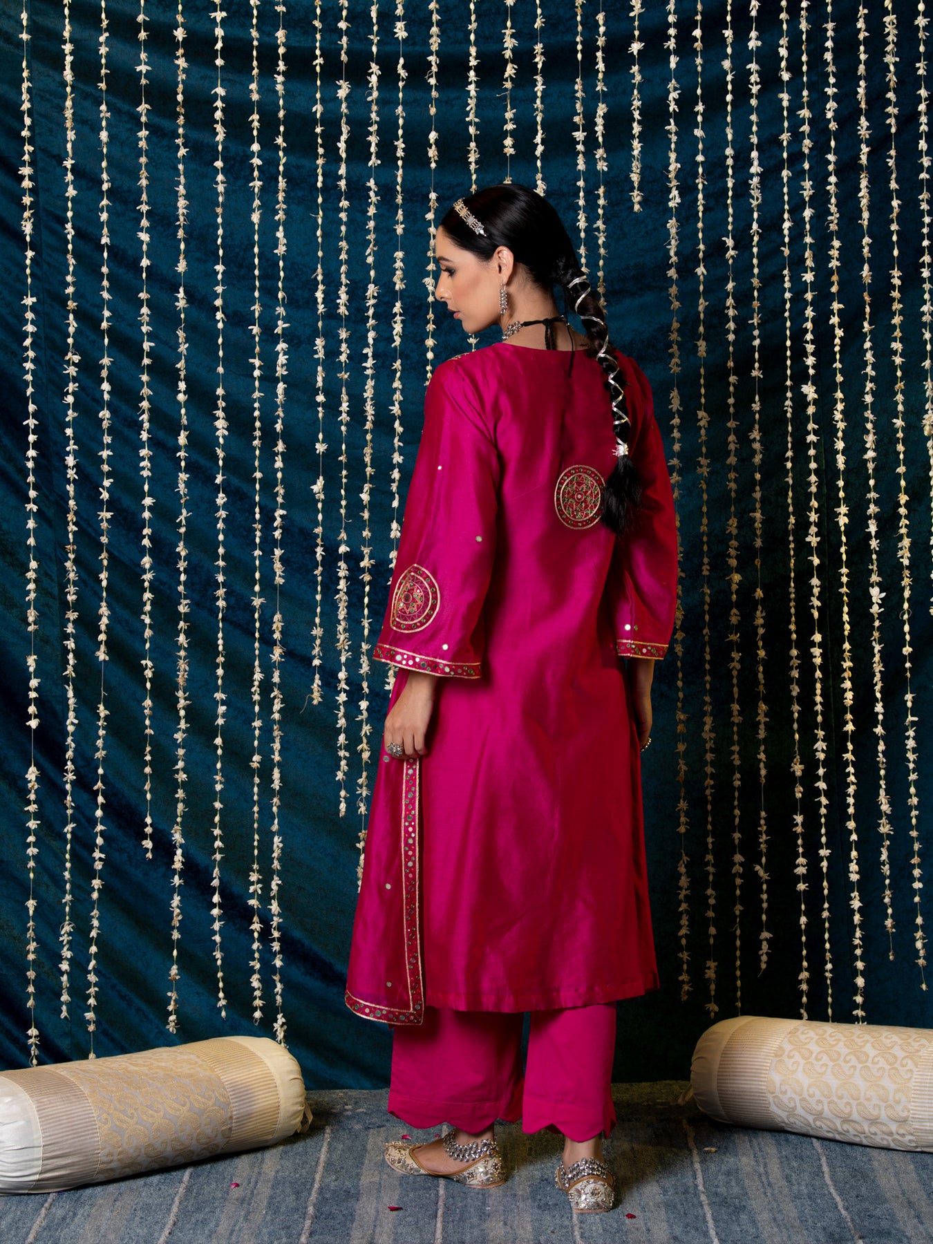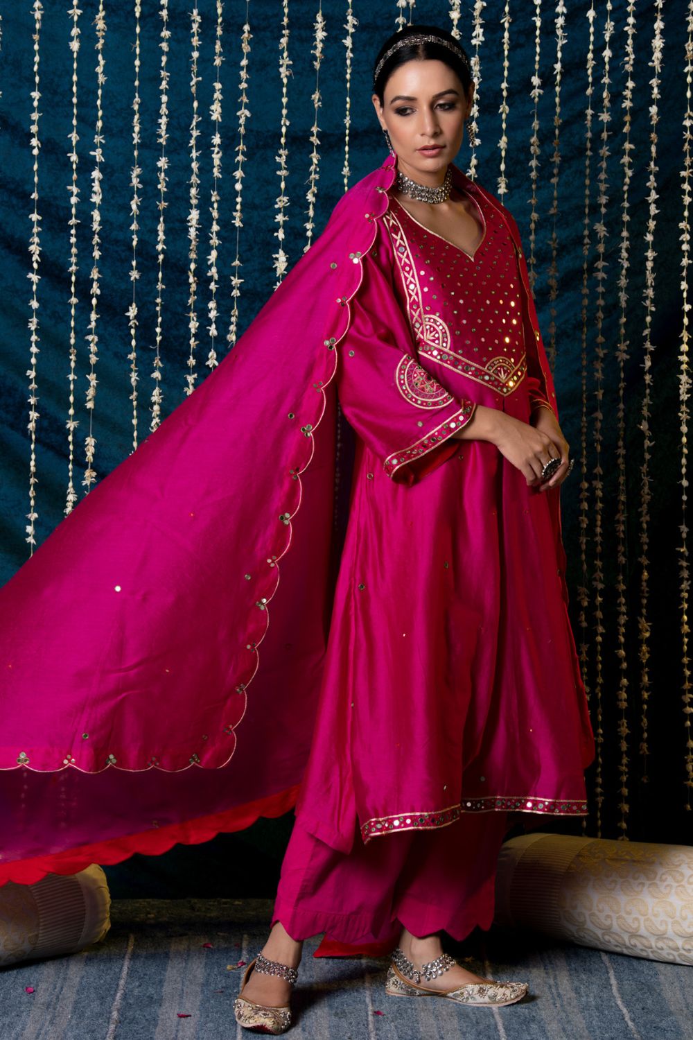 "Jashn-E-Ulfat" - a collection of ensembles that evoke a sense of majestic opulence and modern royalty. Suffused with deep rich hues set on plush cotton silk enhanced with remarkable craftsmanship like Marodi, Mirror and Zardozi embroidery, each ensemble has a romantic and feminine charm of its own collection. This set of 3 consists of a Kurta, Farshi Pajama and Dupatta. KURTA: Thisrich pink chanderi silk kurta is enhanced with delicate thread and mirror work embroidery and styled with flared sleeves detailed with motifs. BOTTOMS: This kurta is paired with farshi pants made in soft modal cotton, detailed with scalloped edges . DUPATTA: The set is finished with a chanderi silk dupatta with scalloped edges and detailed with mirror embroidery.