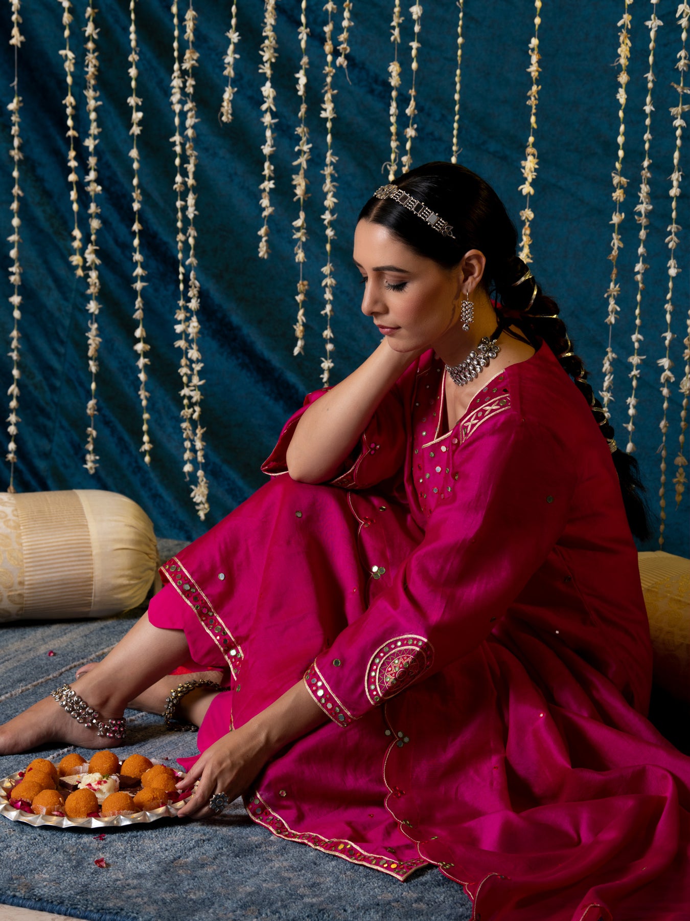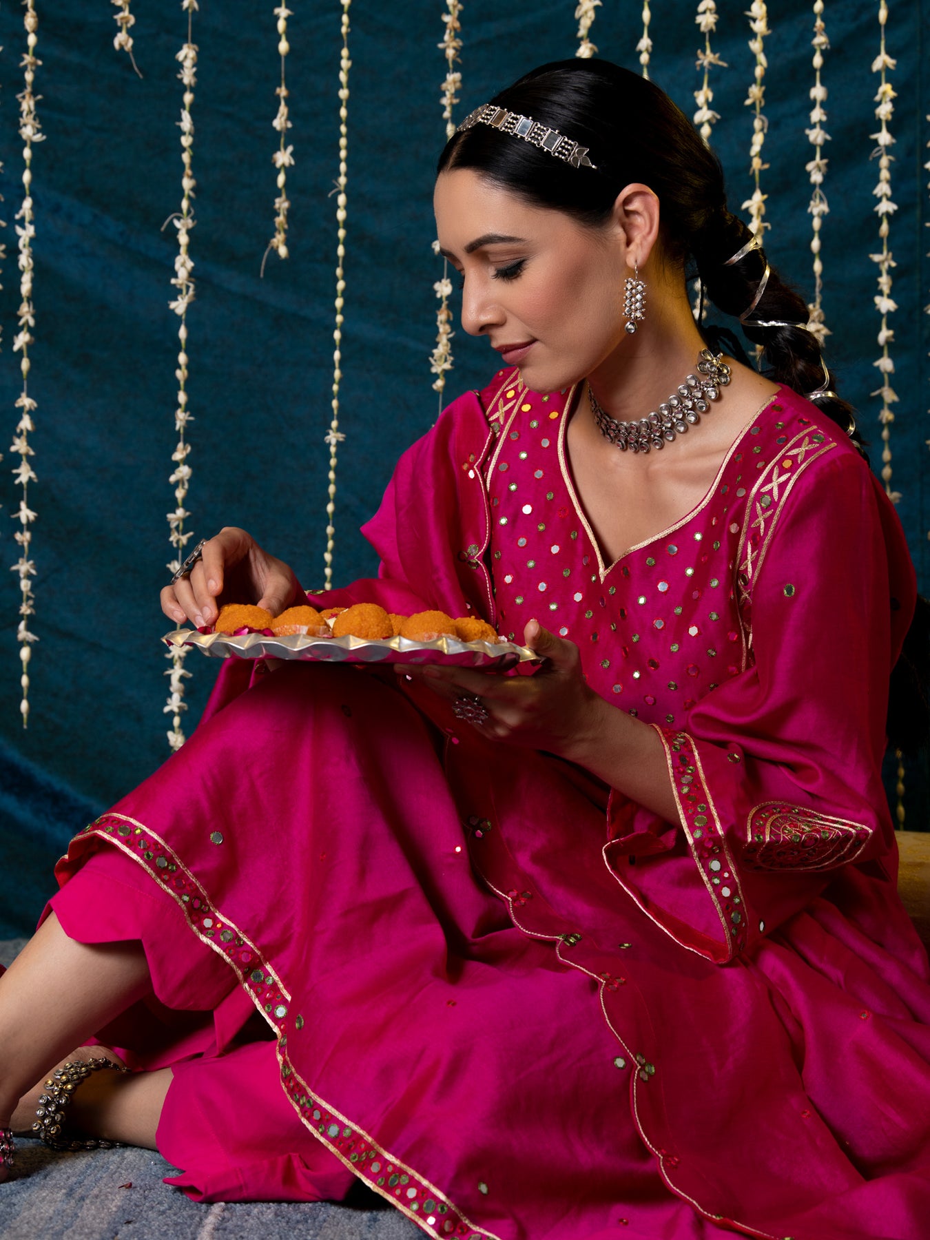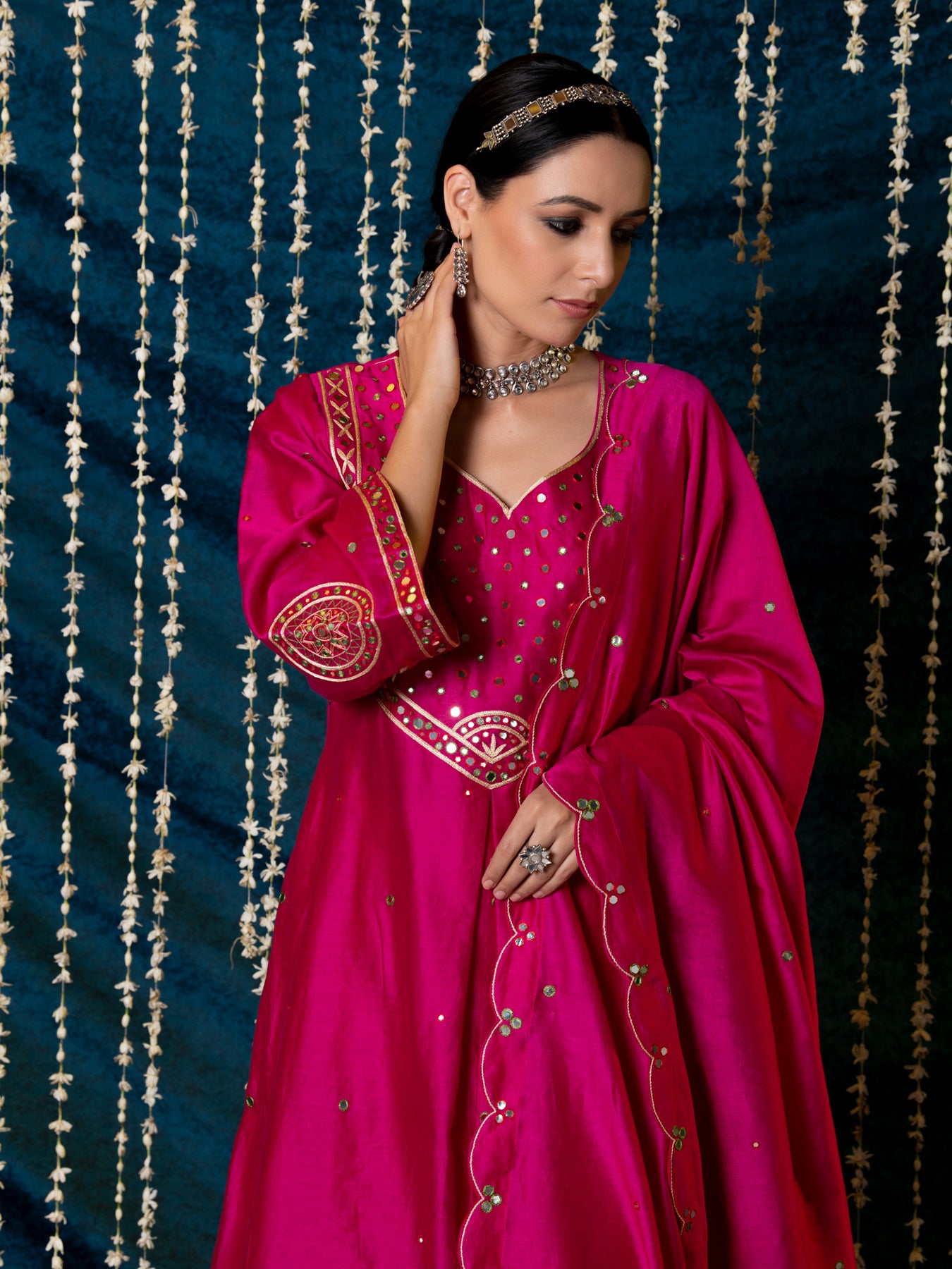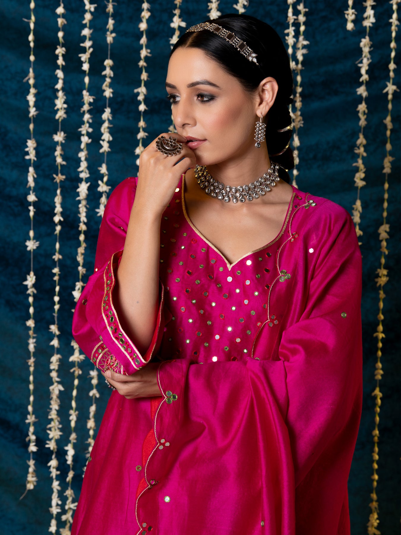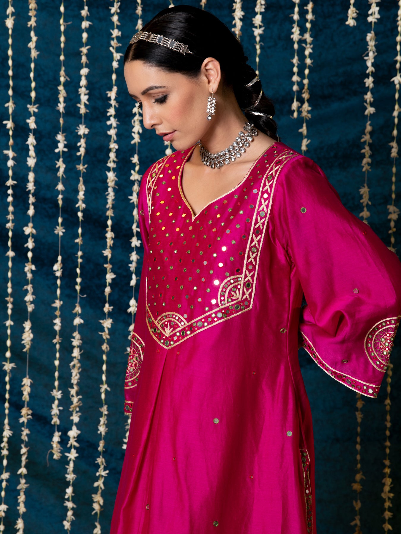 "Jashn-E-Ulfat" - a collection of ensembles that evoke a sense of majestic opulence and modern royalty. Suffused with deep rich hues set on plush cotton silk enhanced with remarkable craftsmanship like Marodi, Mirror and Zardozi embroidery, each ensemble has a romantic and feminine charm of its own collection. This set of 3 consists of a Kurta, Farshi Pajama and Dupatta. KURTA: Thisrich pink chanderi silk kurta is enhanced with delicate thread and mirror work embroidery and styled with flared sleeves detailed with motifs. BOTTOMS: This kurta is paired with farshi pants made in soft modal cotton, detailed with scalloped edges . DUPATTA: The set is finished with a chanderi silk dupatta with scalloped edges and detailed with mirror embroidery.