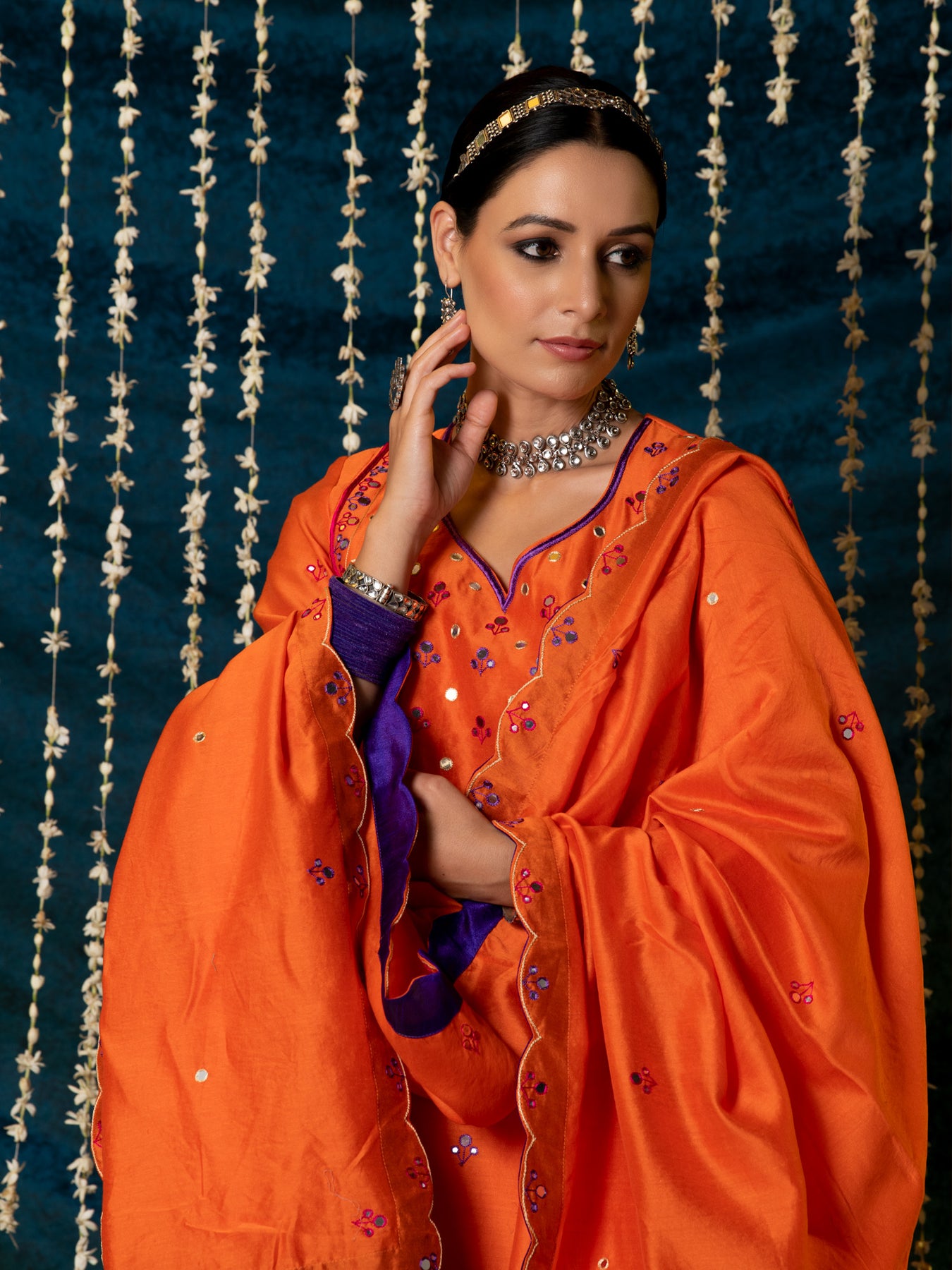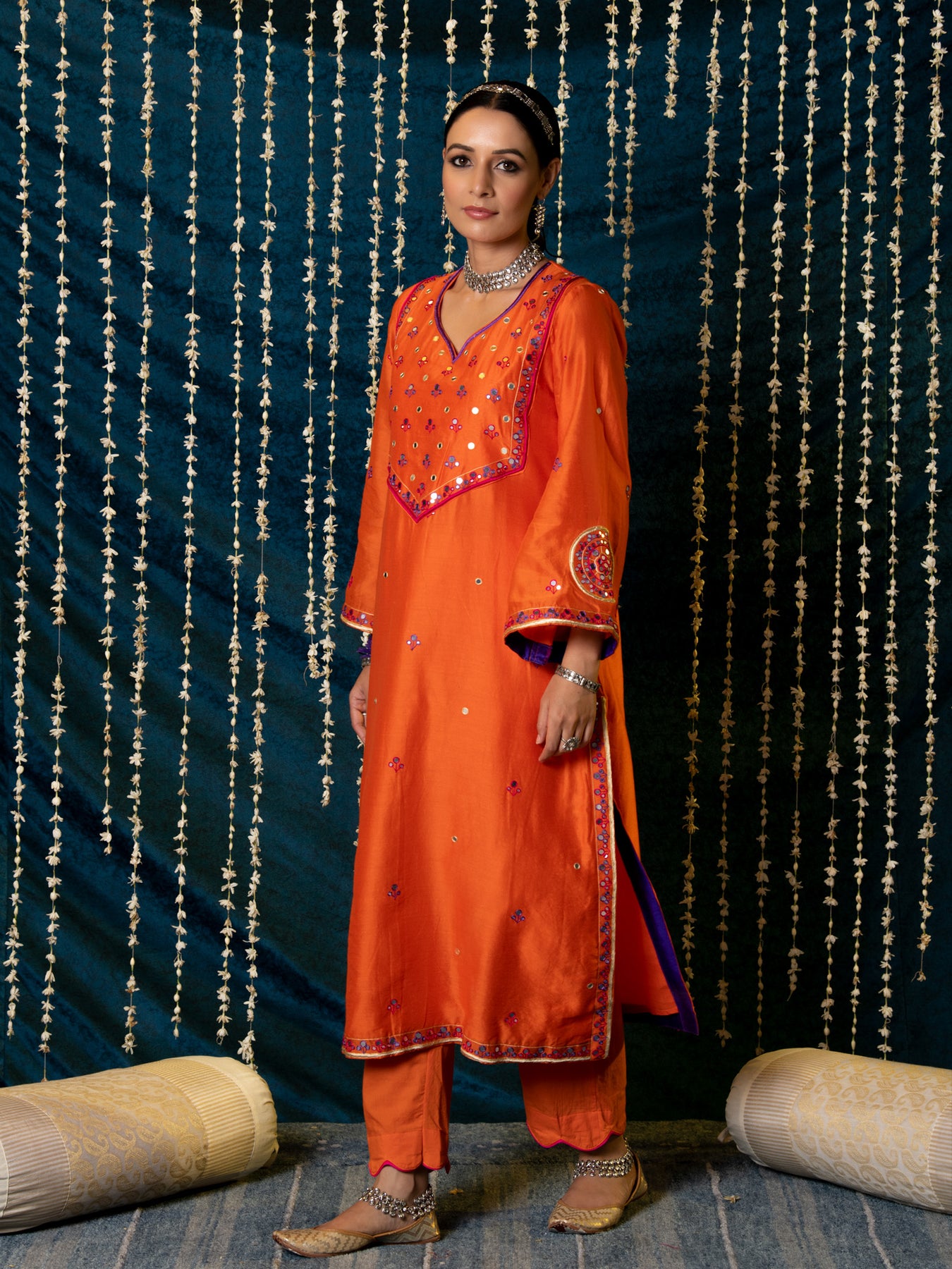 KURTA: This bright orange chanderi silk kurta is enhanced with delicate thread and mirror work embroidery and styled with flared sleeves detailed with motifs.