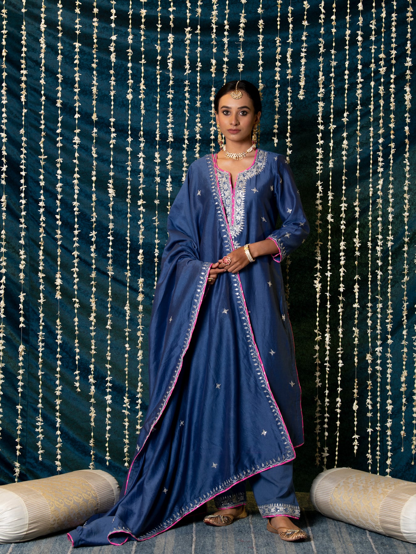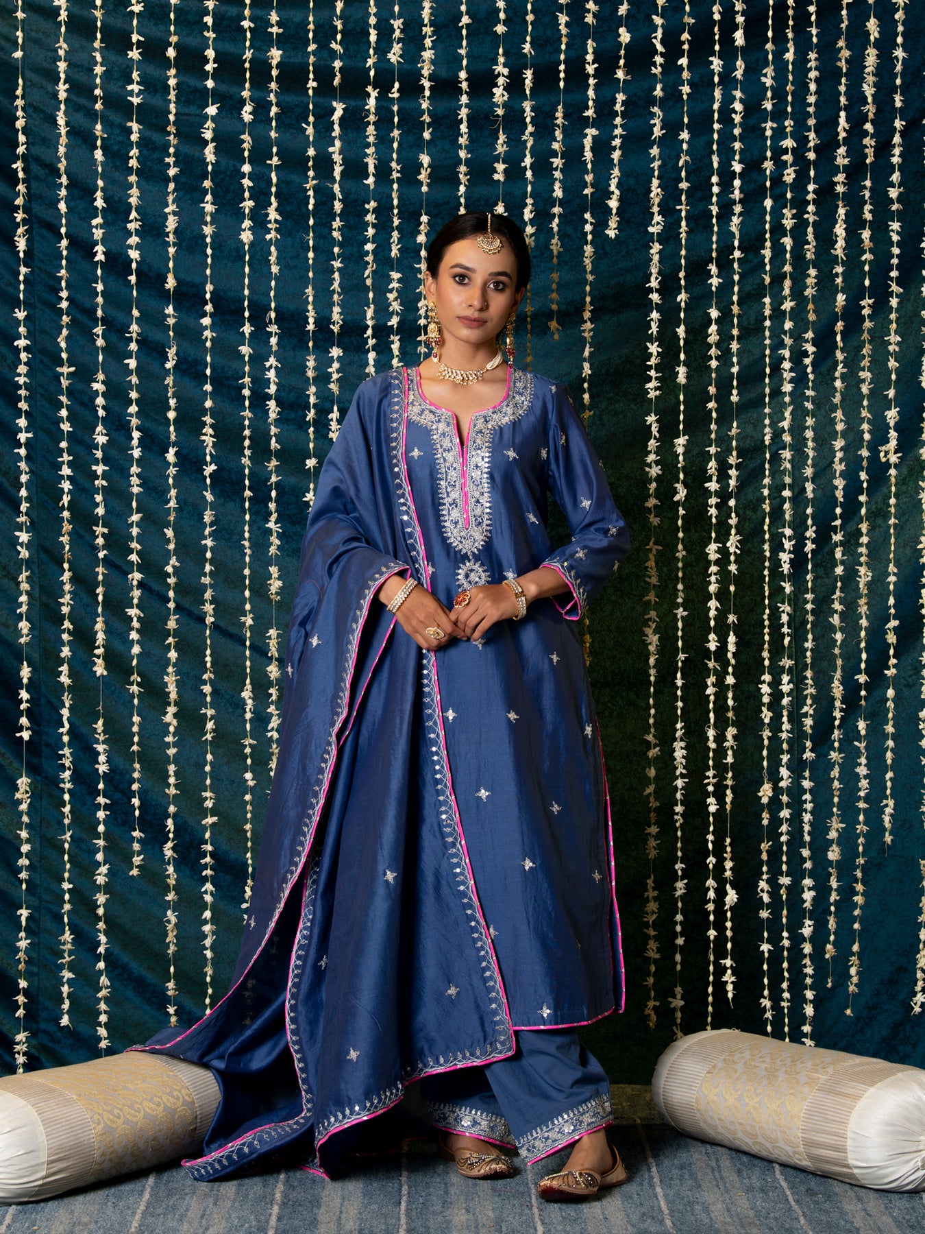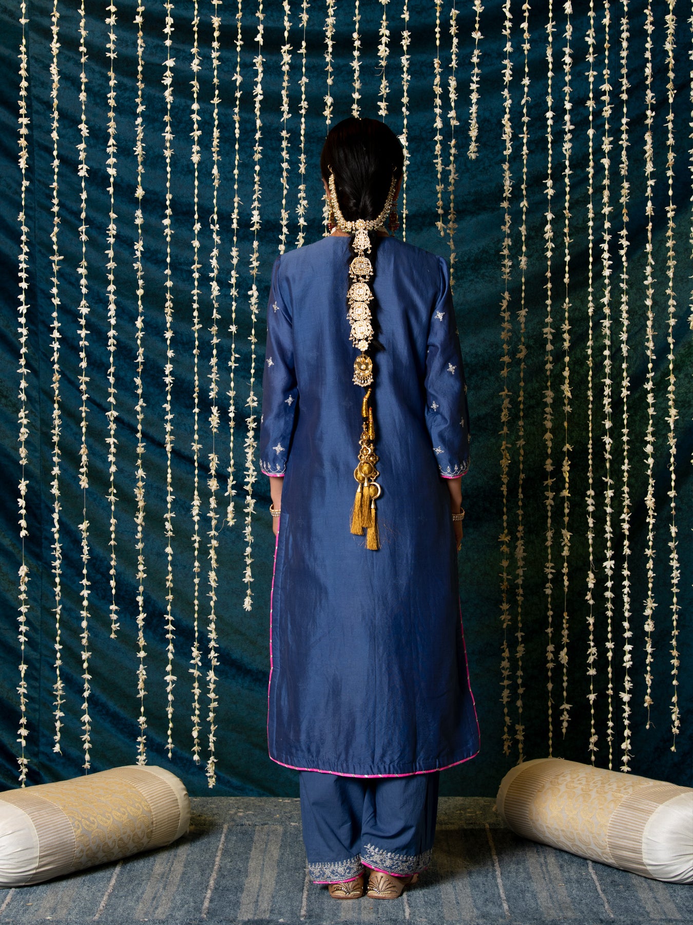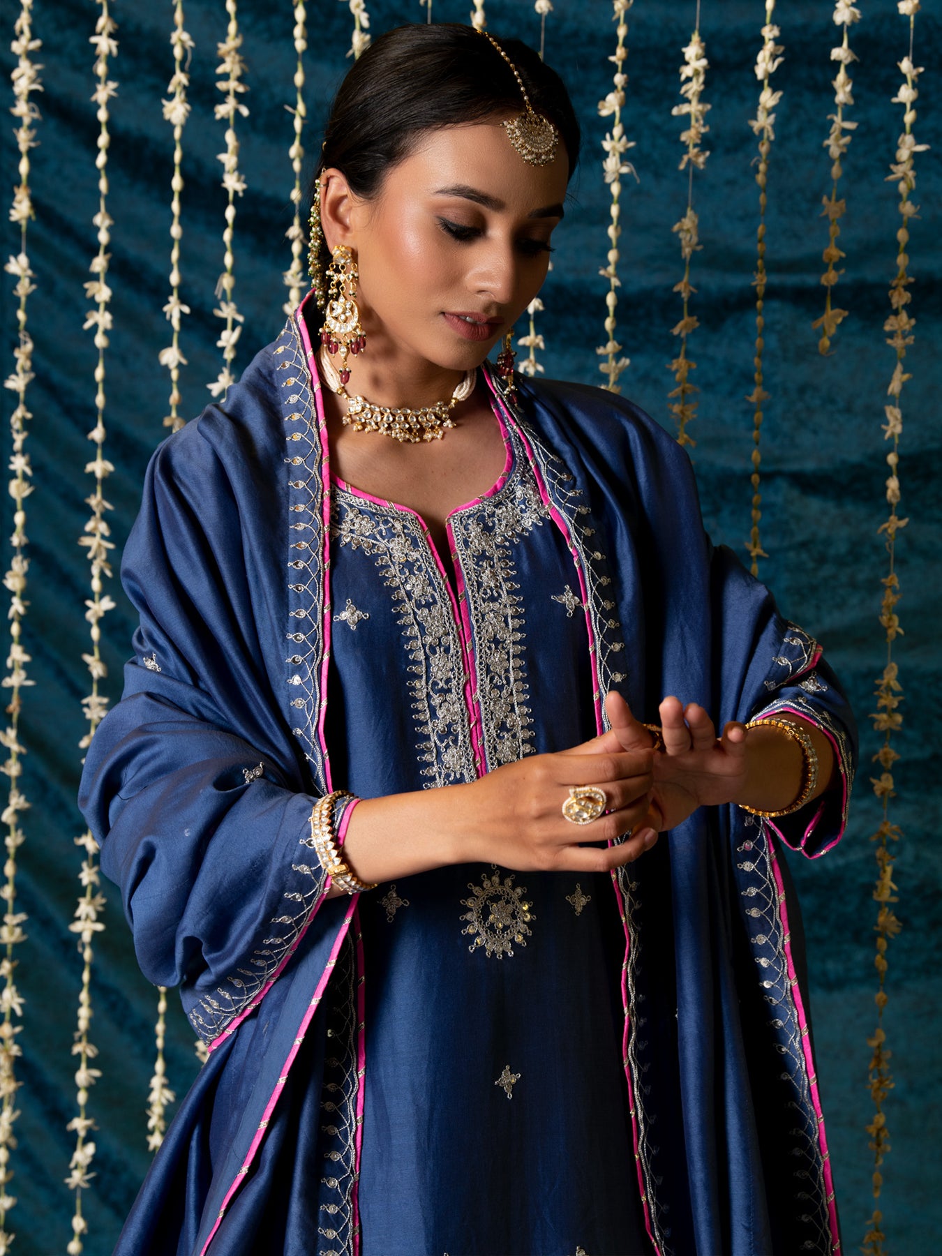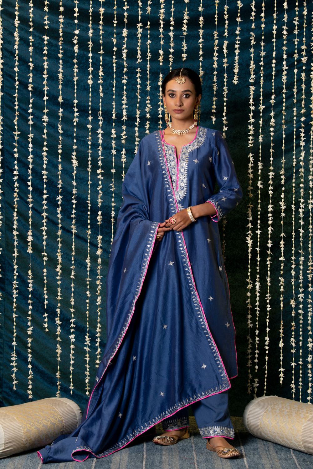 KURTA: This elegant blue chanderi silk kurta is enhaced with silver marodi work on the neck and sleeves and beautifully detailed with delicate silver buttas all over. The kurta has been finished with hand made magzi in a contrast pink color.