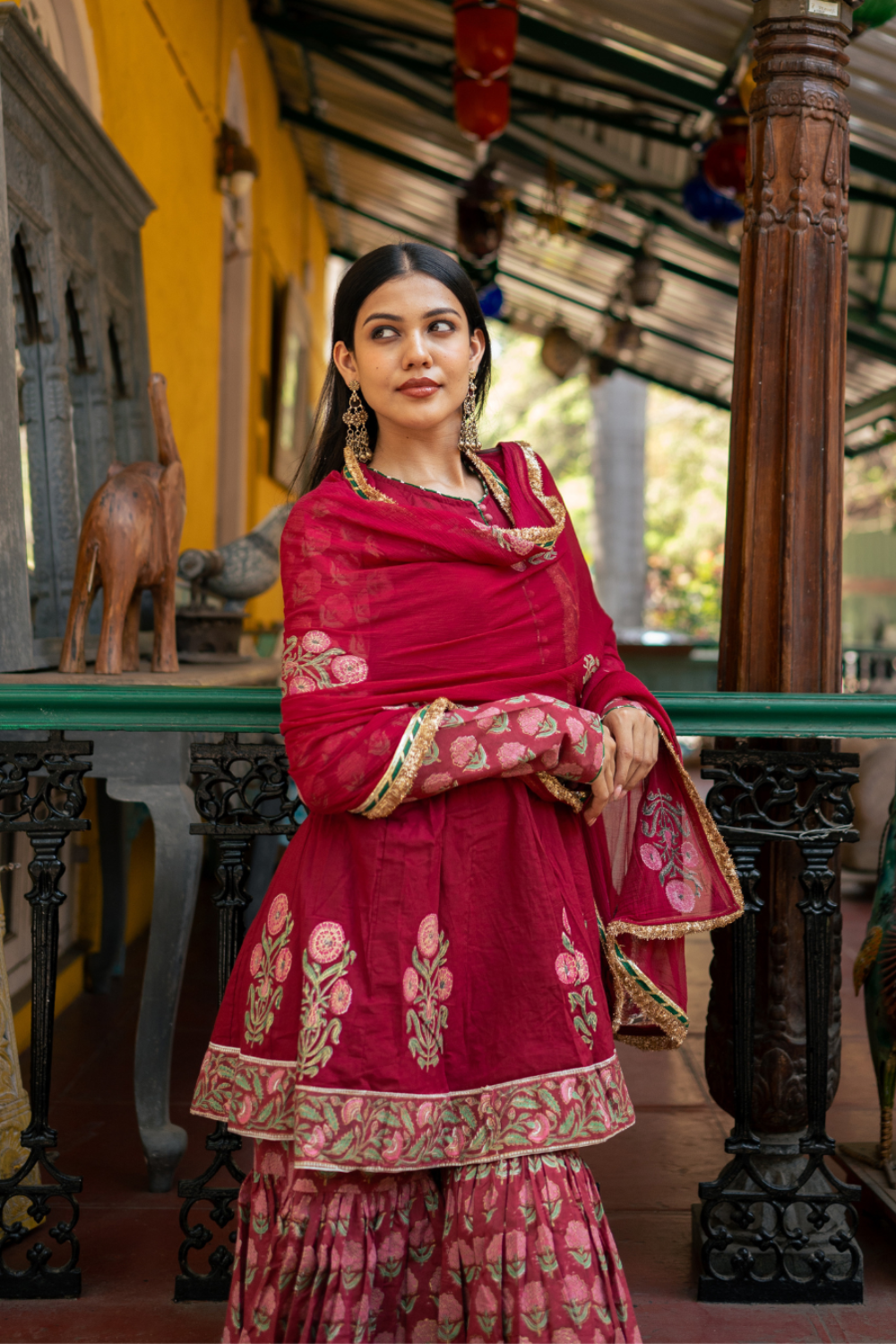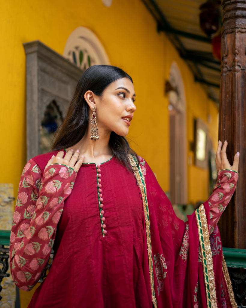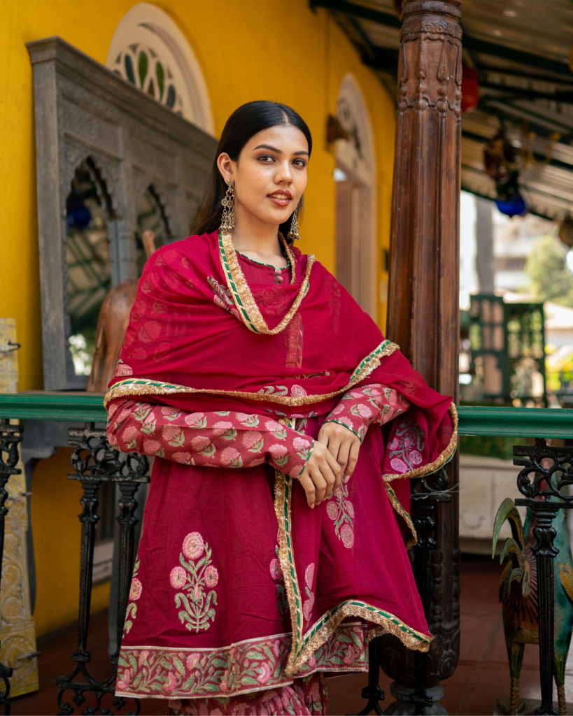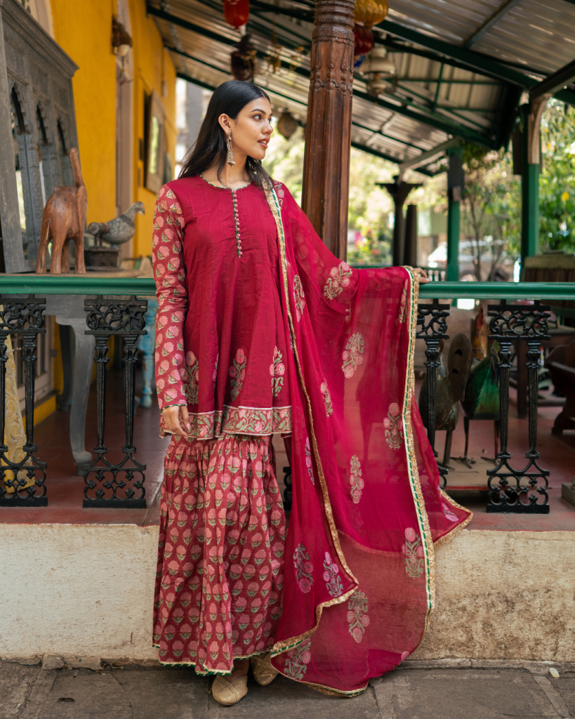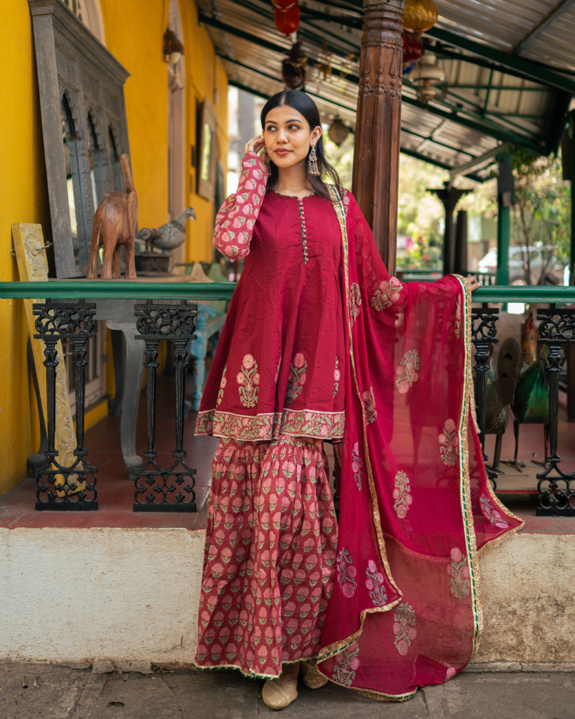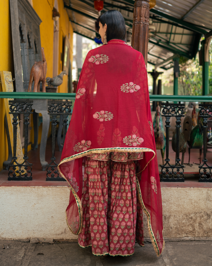 Introducing our Wine Block Printed Anarkali Set with a regal touch, complemented by a matching sharara, adorned with intricate patterns inspired by Indian heritage for a classic ethnic look.