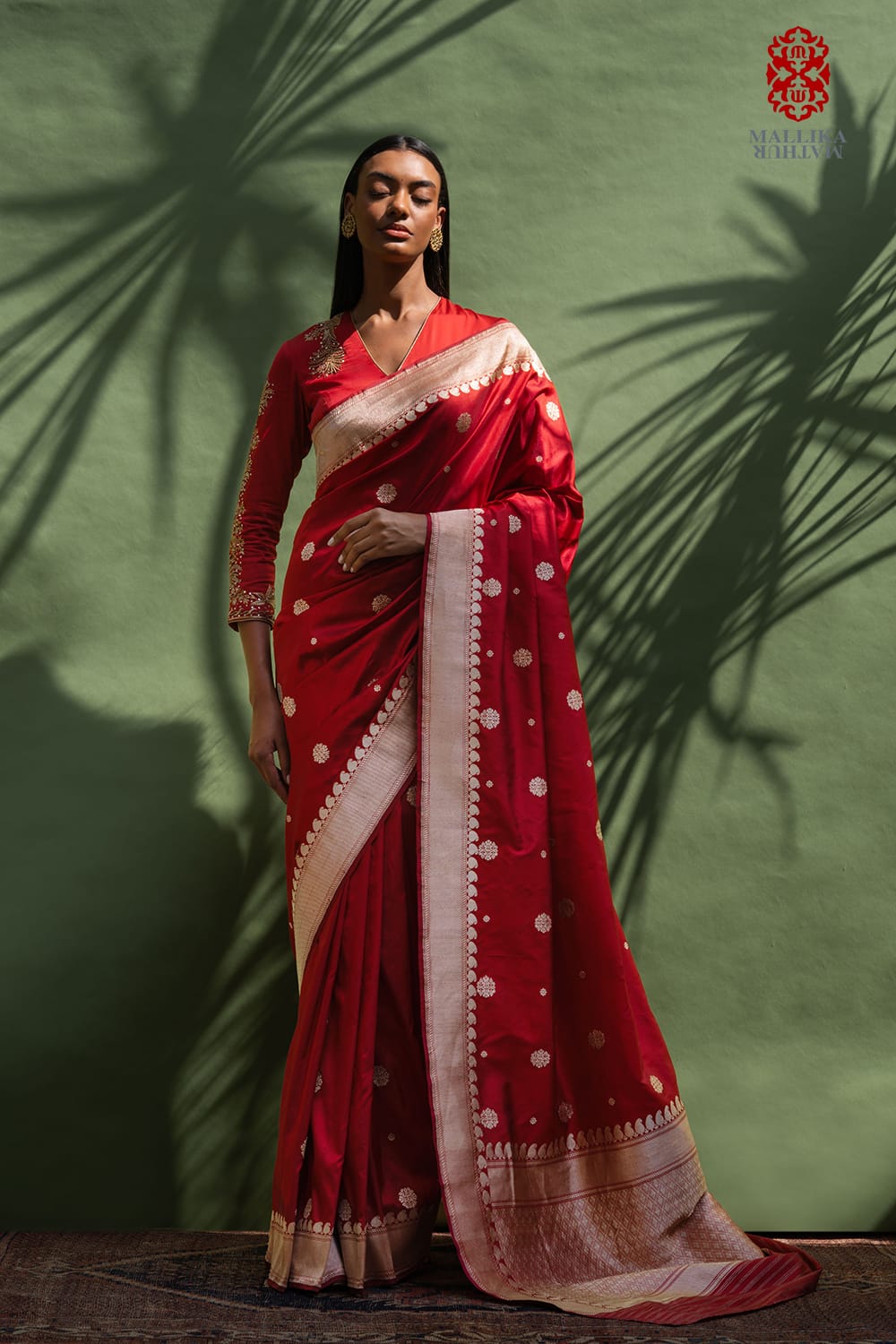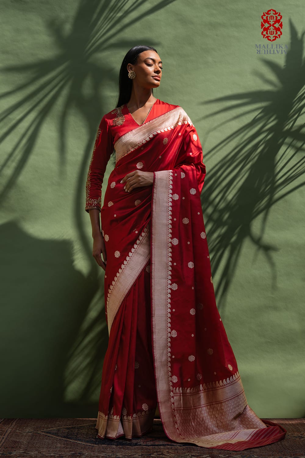 ‘Chunari buti’ katan silk Banarasi sari in a vermillion red handwoven in traditional silver zari motifs. The pallu and border is woven in gold zari borders spanning the sari. It is paired with a red satin 'Zinnia' blouse hand embroidered in antique gold zari bel design.