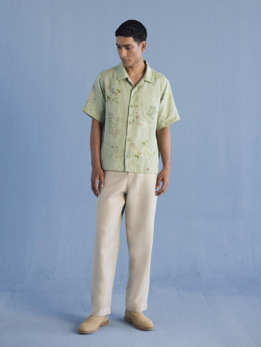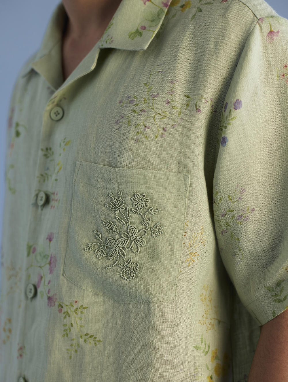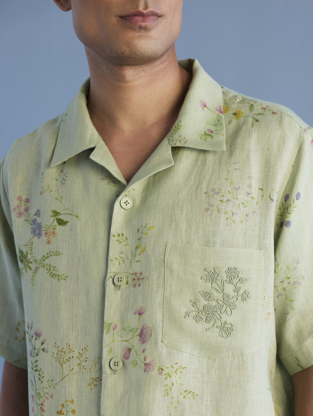 A modern short sleeve shirt with a one piece collar which can also be worn open, like a cuban collar, designed in a hand-painted floral print styled with a hand-embroidered floral motif on the pocket with tonal coloured beads. Our take on a fun and different summer shirt for men.
