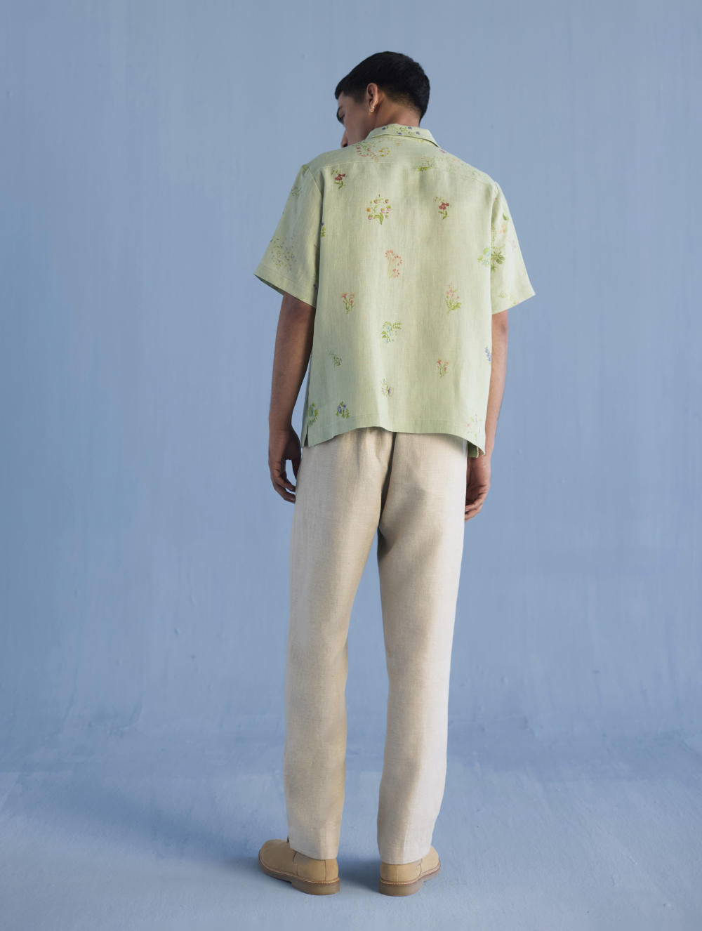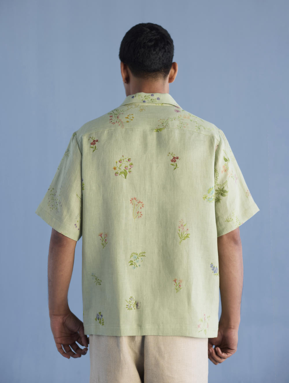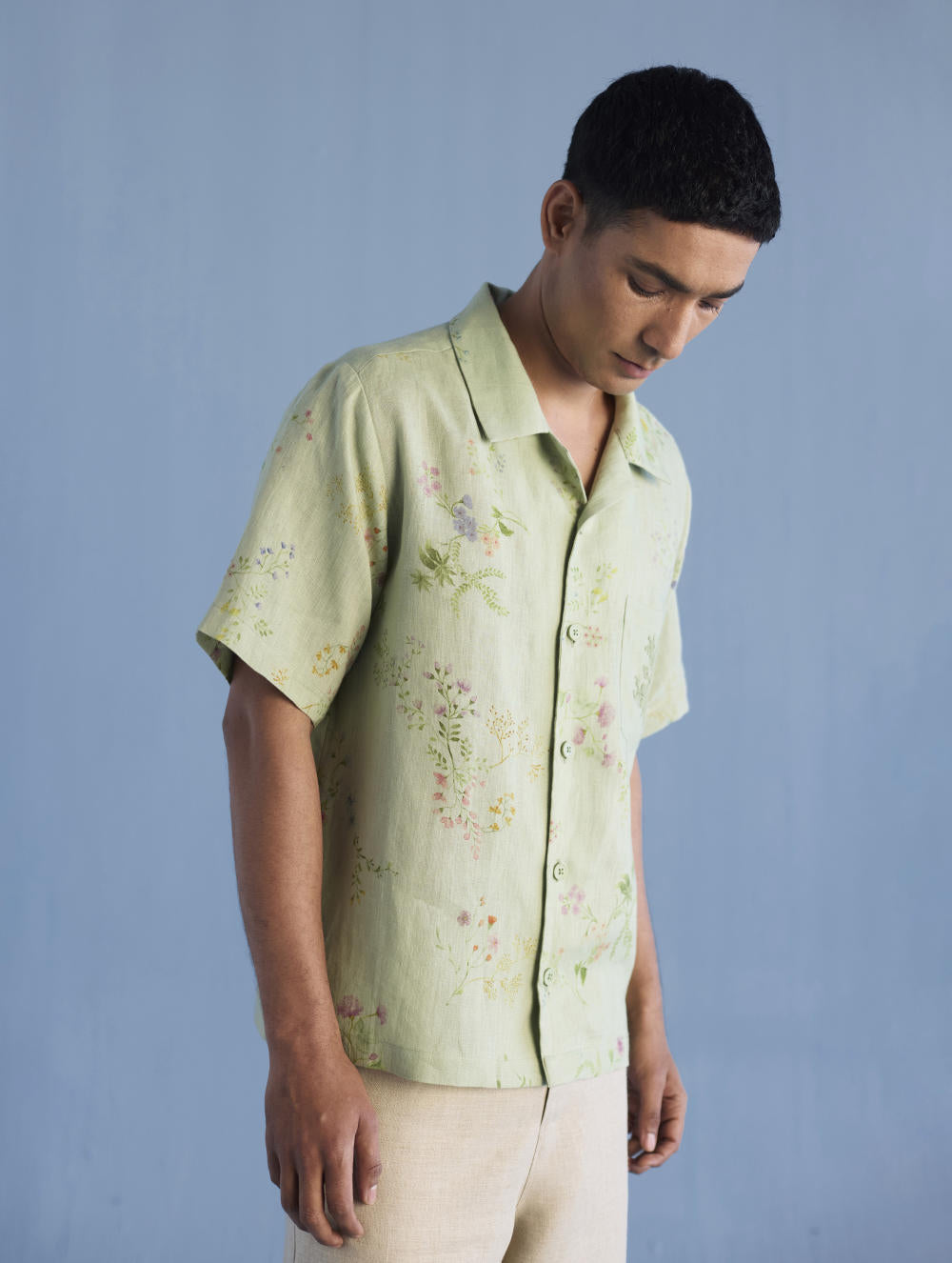 A modern short sleeve shirt with a one piece collar which can also be worn open, like a cuban collar, designed in a hand-painted floral print styled with a hand-embroidered floral motif on the pocket with tonal coloured beads. Our take on a fun and different summer shirt for men.