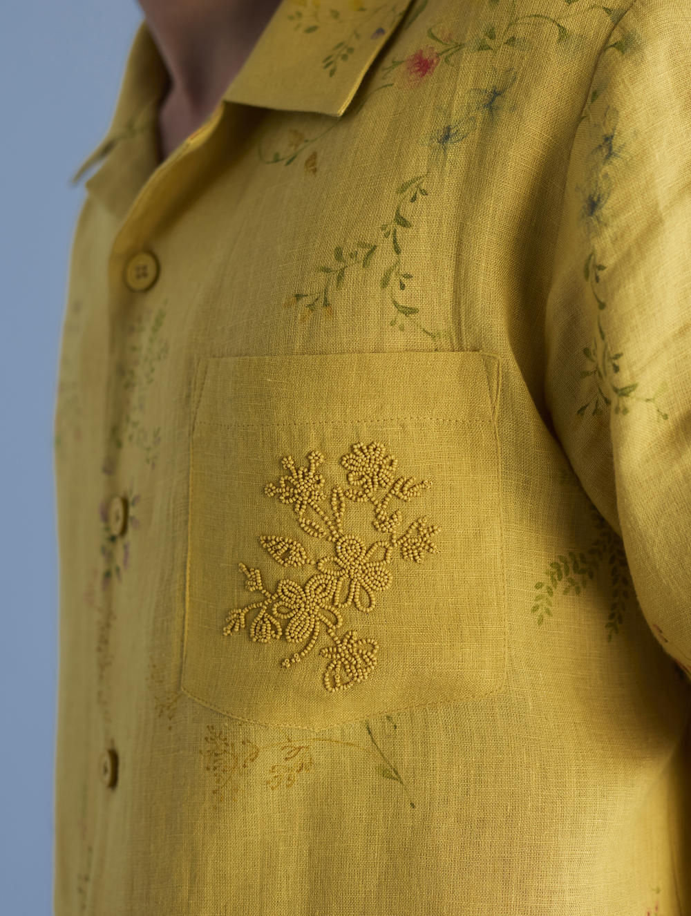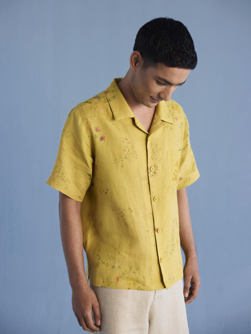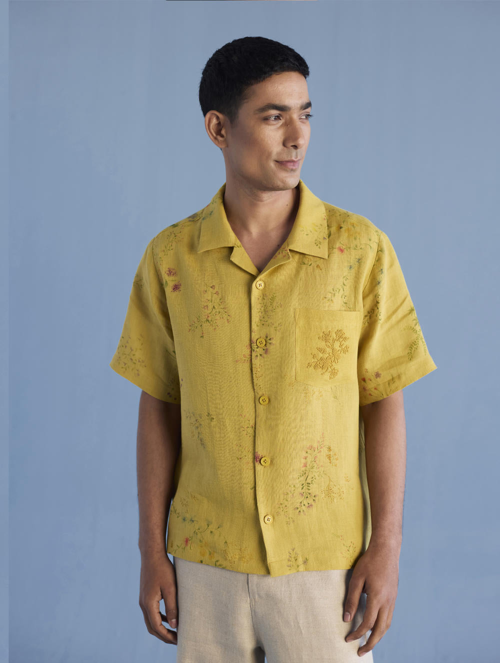 A modern short sleeve shirt with a one piece collar which can also be worn open, like a cuban collar, designed in a hand-painted floral print styled with a hand-embroidered floral motif on the pocket with tonal coloured beads. Our take on a fun and different summer shirt for men.