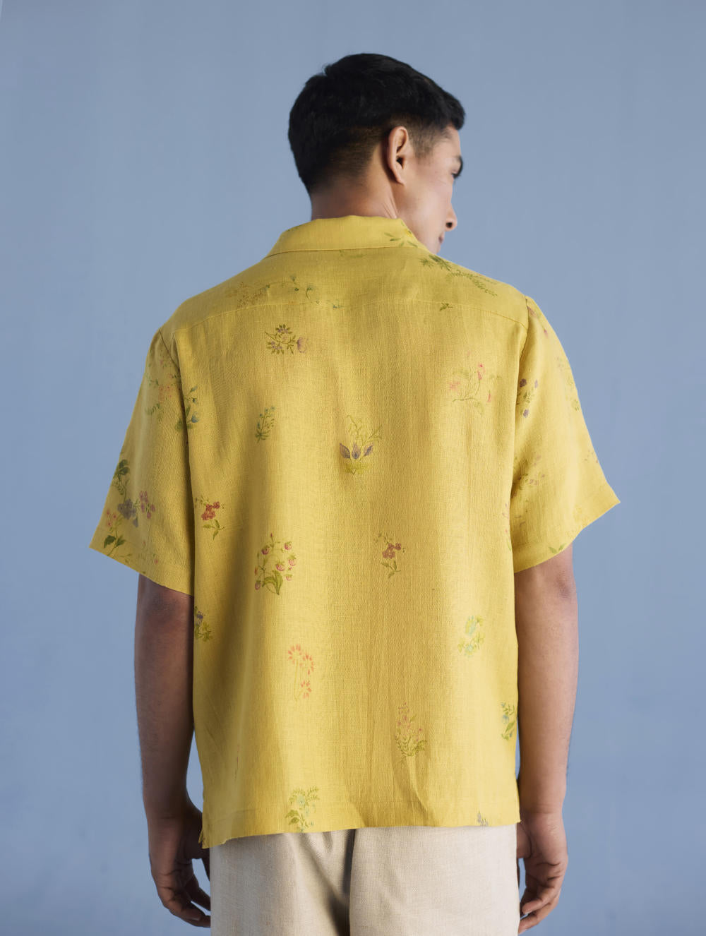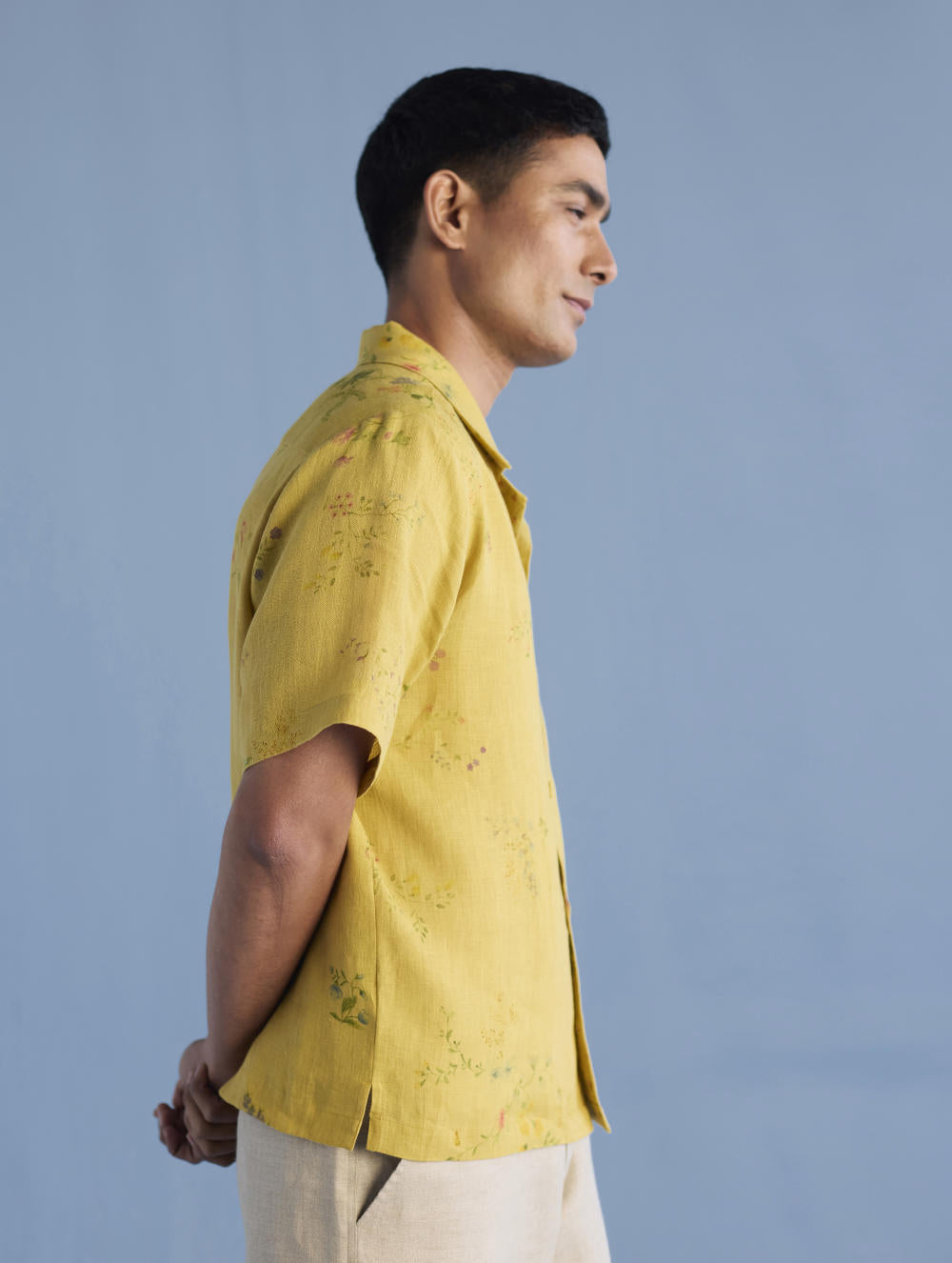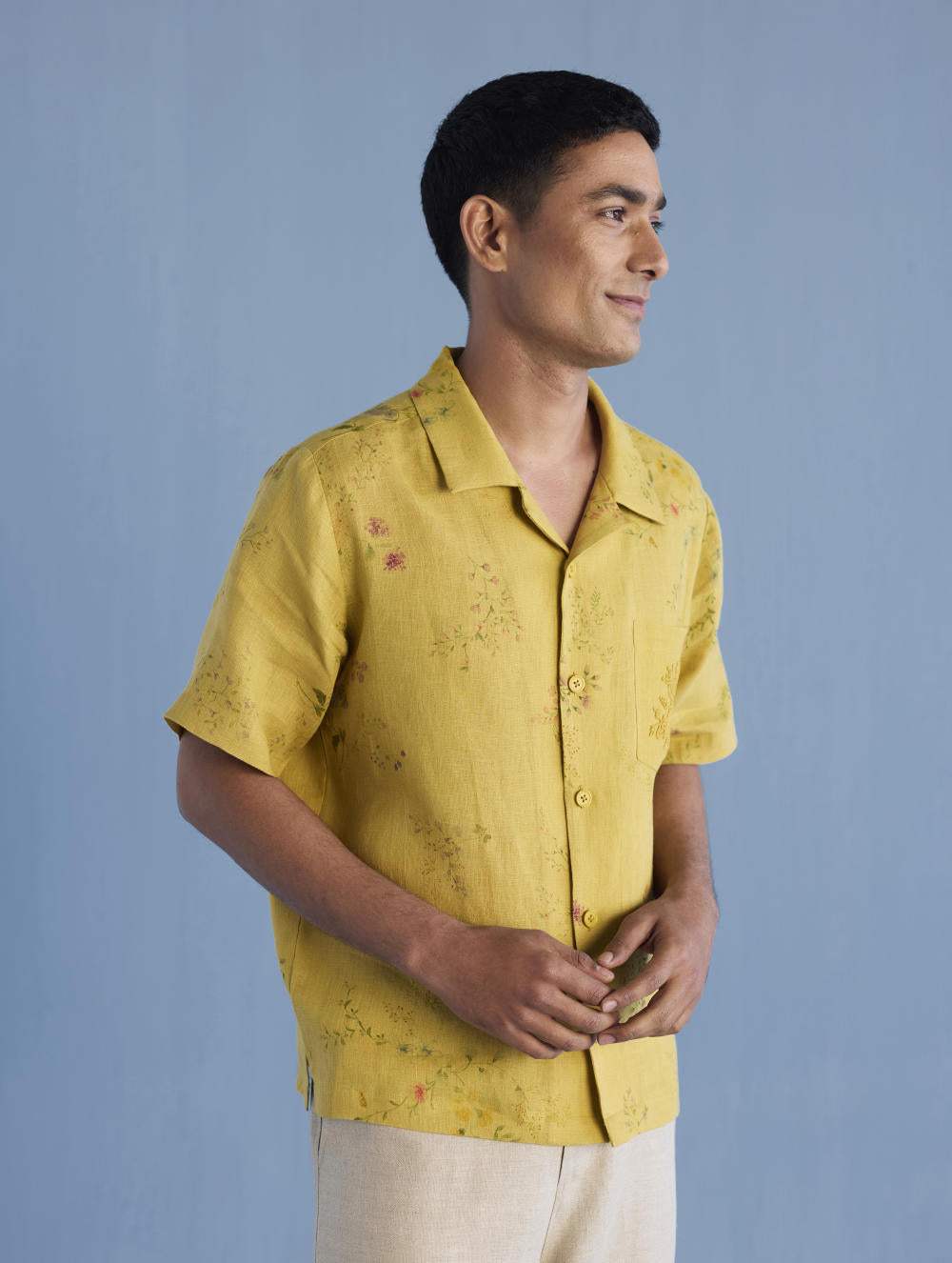 A modern short sleeve shirt with a one piece collar which can also be worn open, like a cuban collar, designed in a hand-painted floral print styled with a hand-embroidered floral motif on the pocket with tonal coloured beads. Our take on a fun and different summer shirt for men.