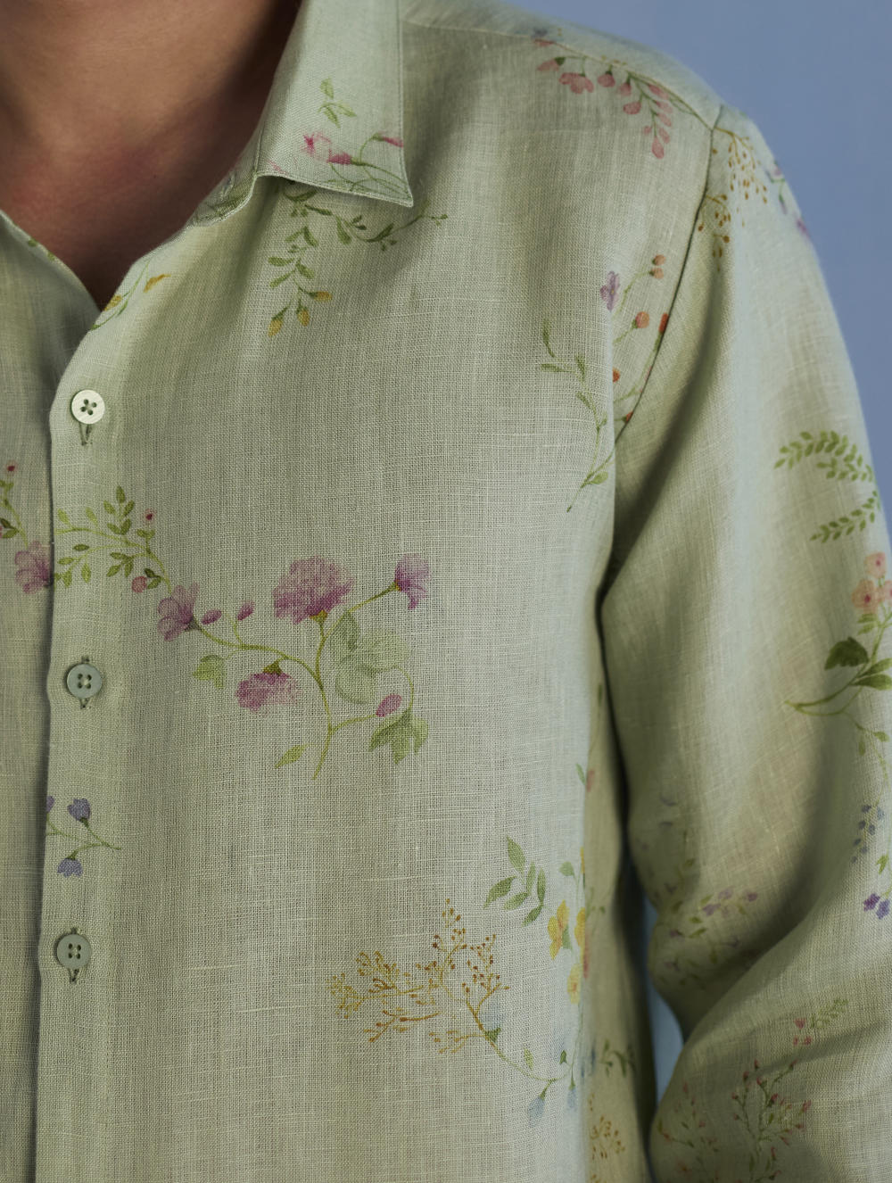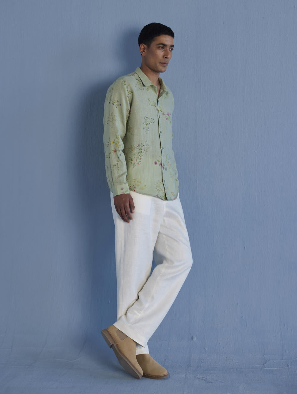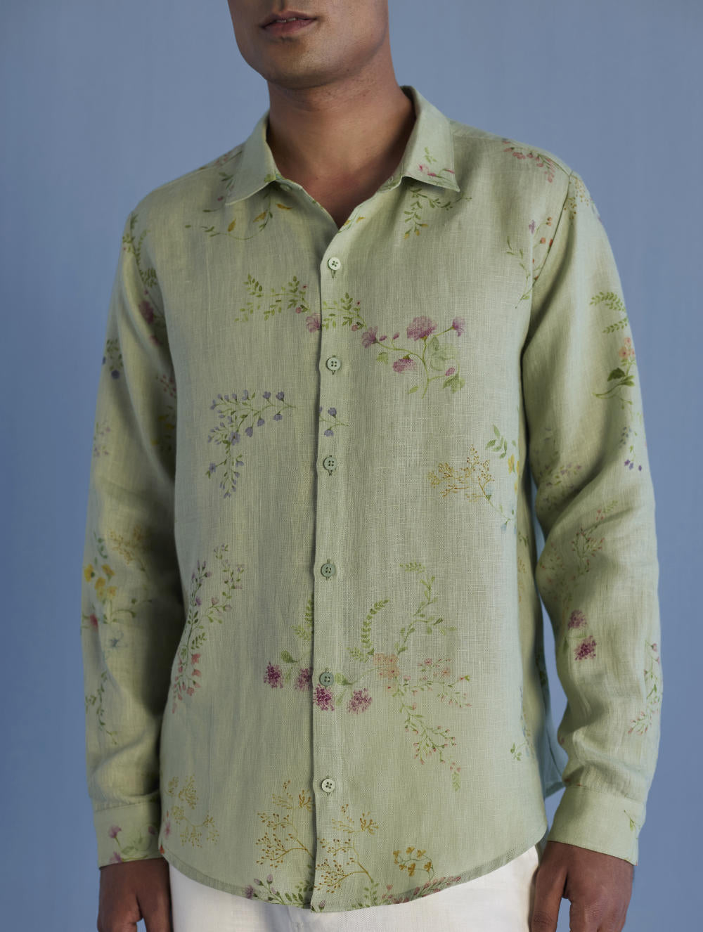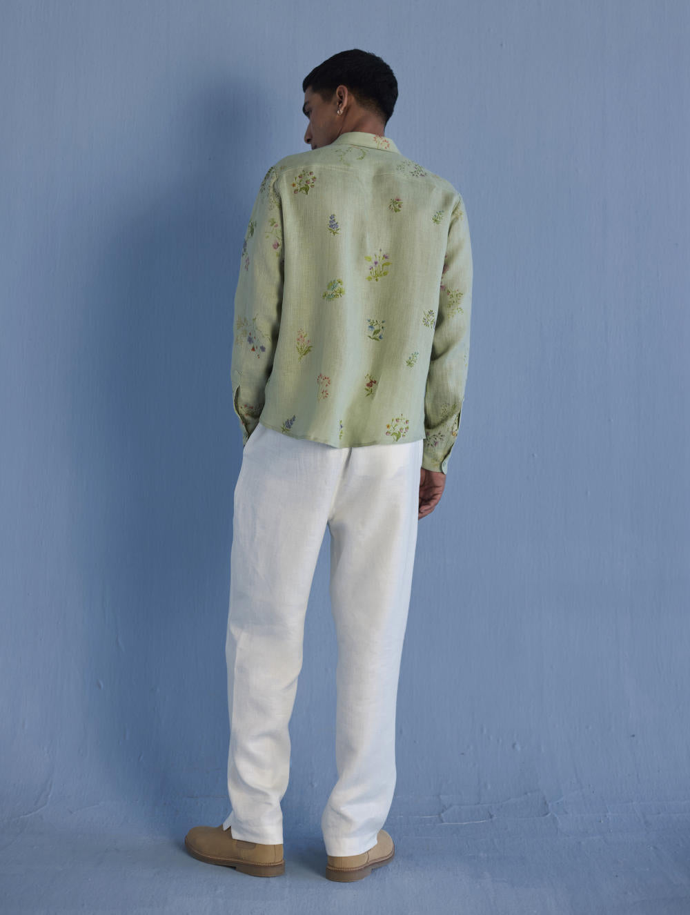 A classic collared full sleeve shirt in the softest pure yarn-dyed linen made dressy with subtle and intricate hand-embroidery - a beautiful floral border hand-embroidered with intricate thread embroidery and micro hand-embroidered beadwork running across across one side of the button placket, hemline, cuff finished with a motif on the collar. Perfect for a soft statement look.