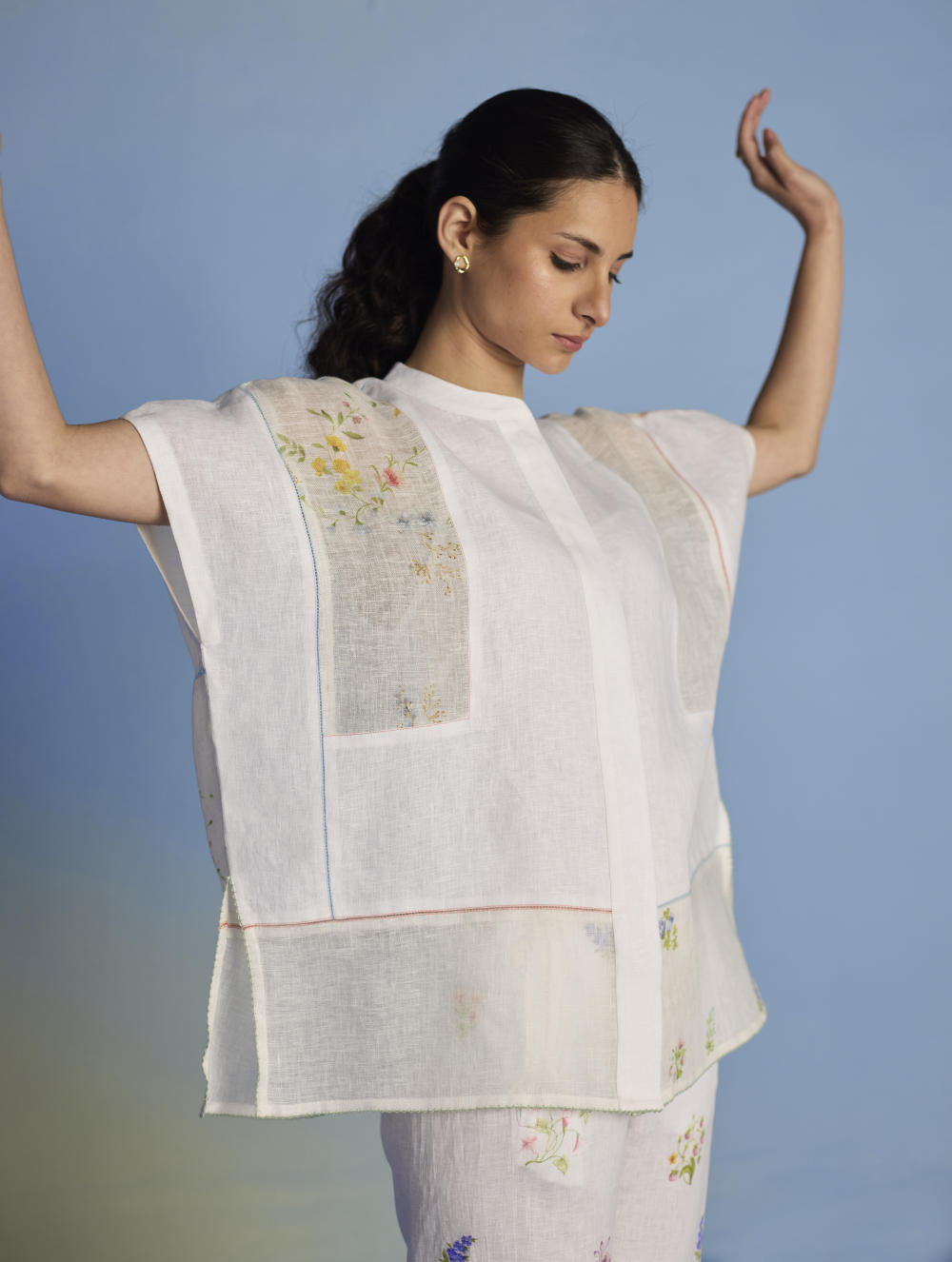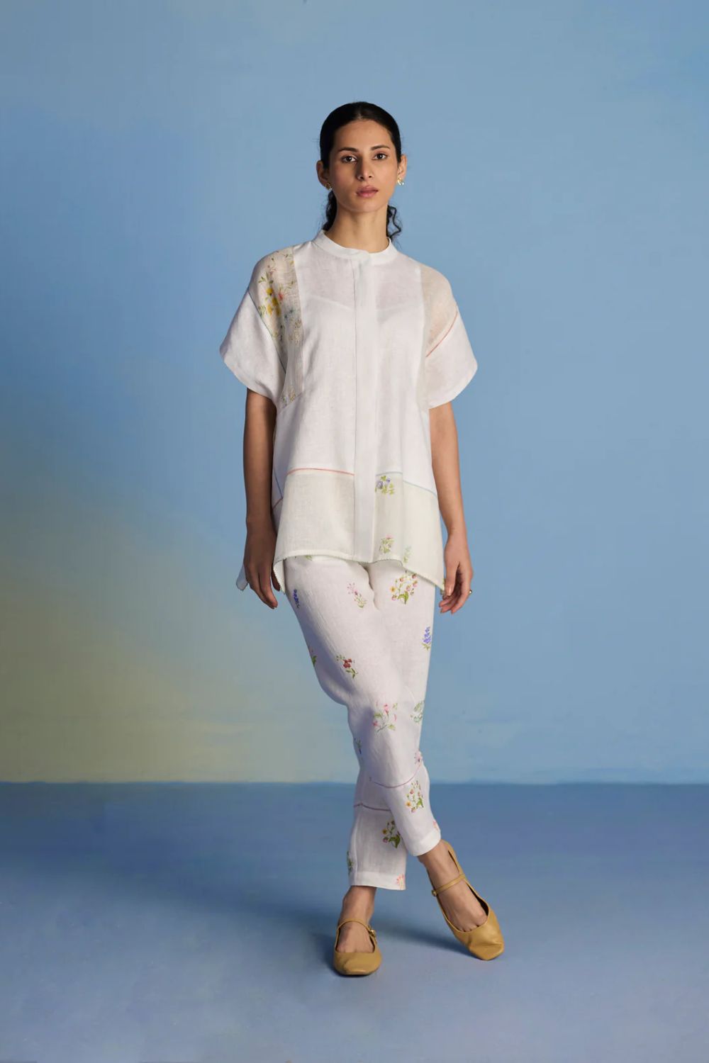 A flowing patchwork shirt crafted via patchwork of our signature soft yarn-dyed linen and sheer linen, featuring an intricate hand-painted floral print. Enhanced with multi-coloured fagotting stitch on adjoining patches, finished with colourful picoting at the hem.