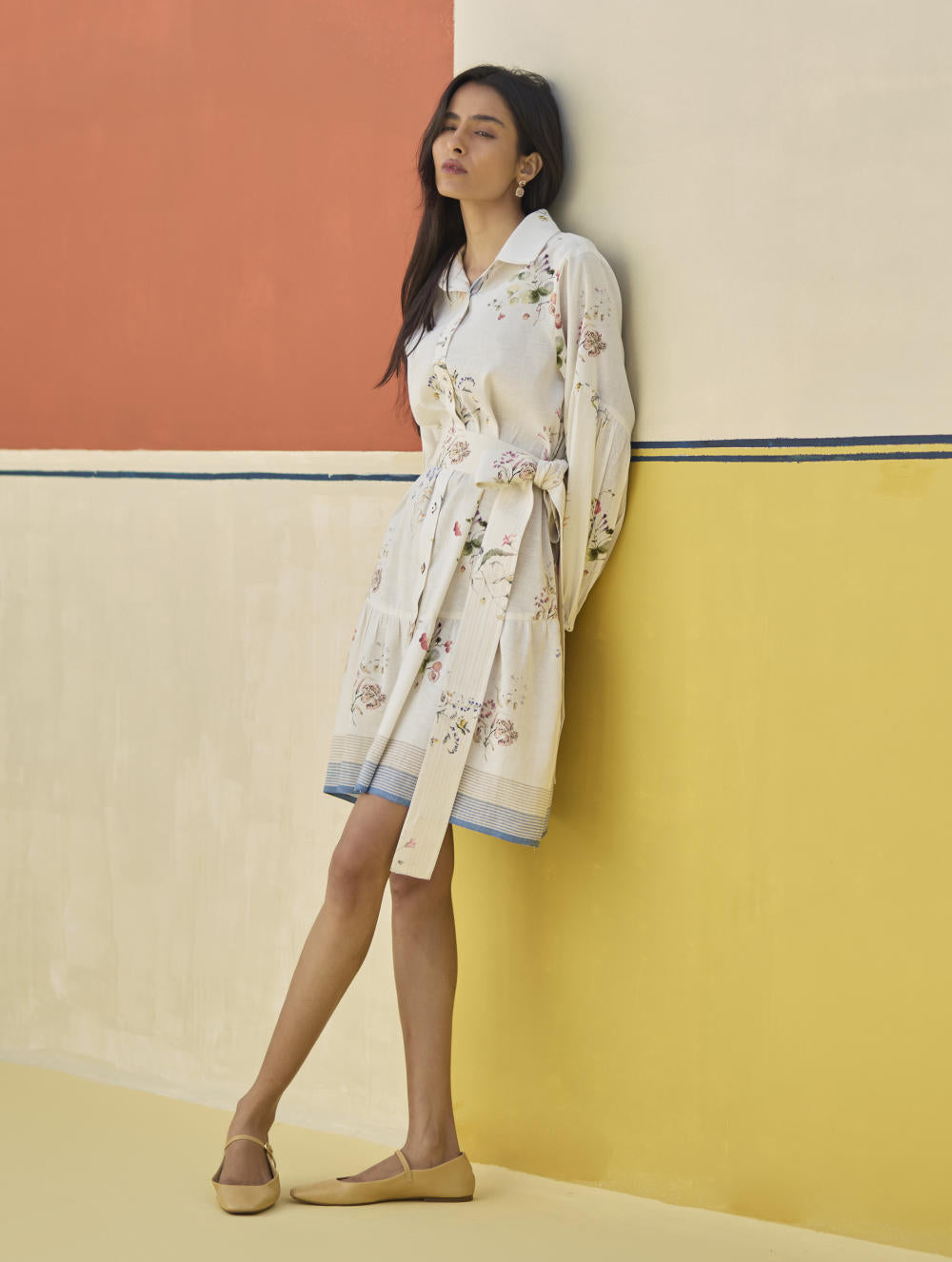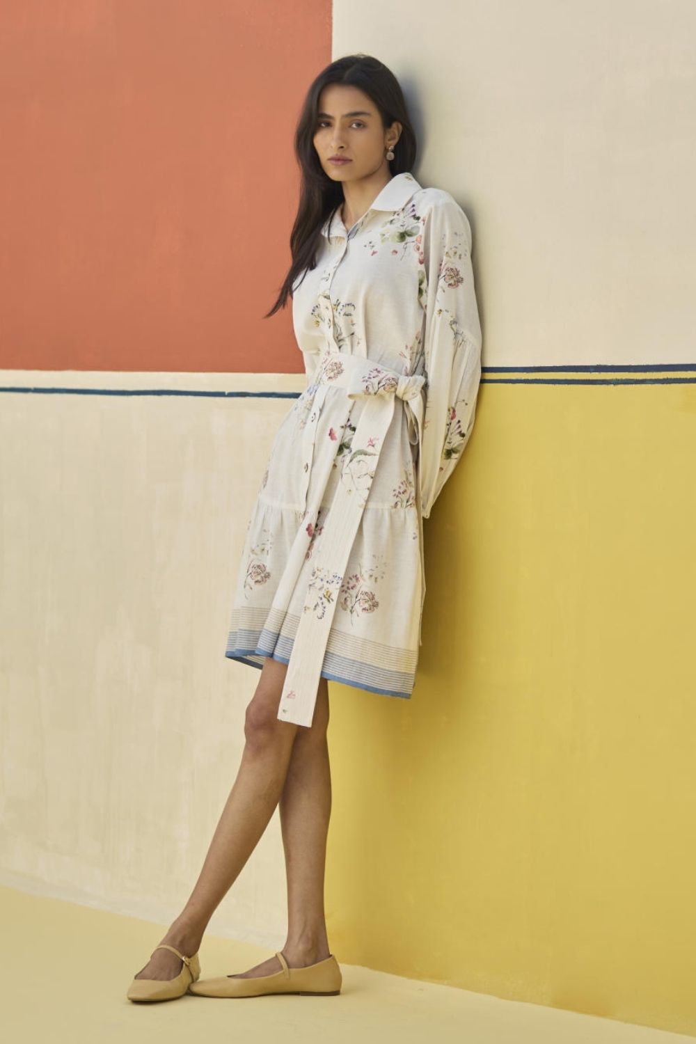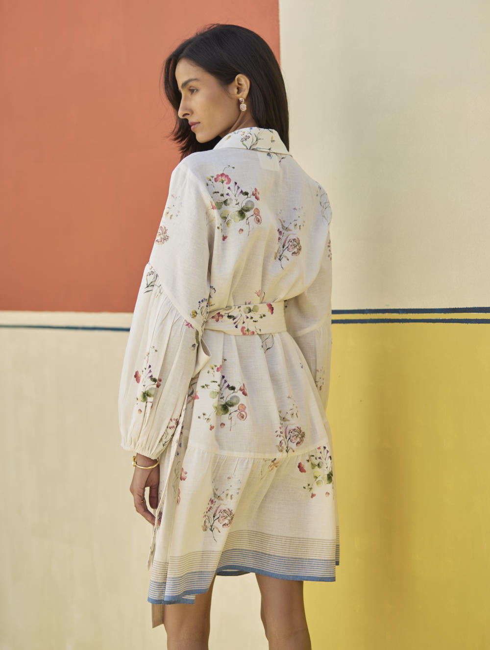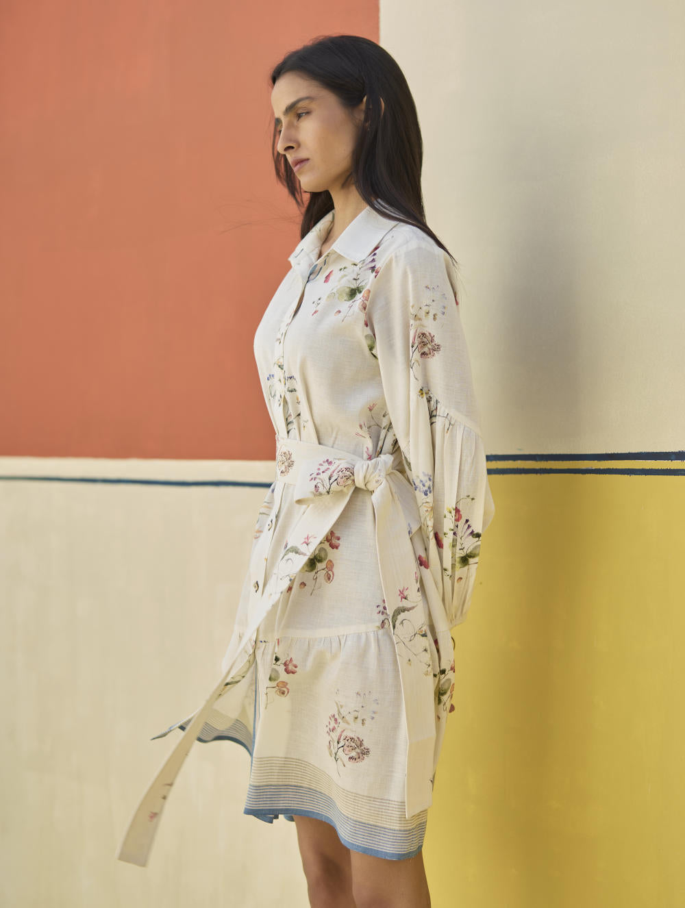 A button-down shirt dress with a broad gathered frill designed in our soft handloom linen cotton with a self-woven stripe border and coloured selvedge. The Alara is printed with hand-illustrated and hand-painted floral watercolor motifs and has mother of pearl buttons with a floral printed linen belt accented with parallel top-stitch lines.