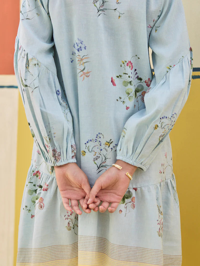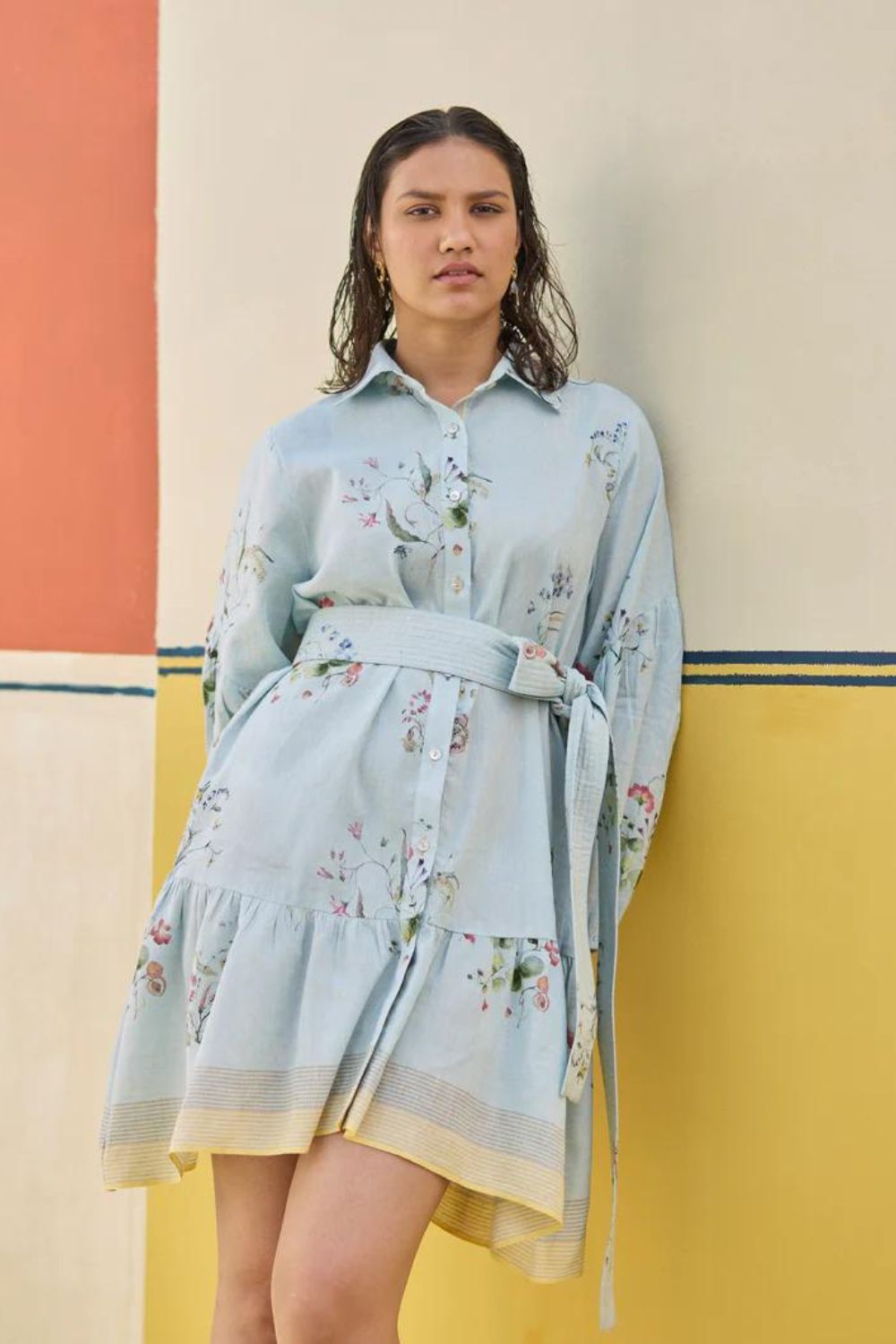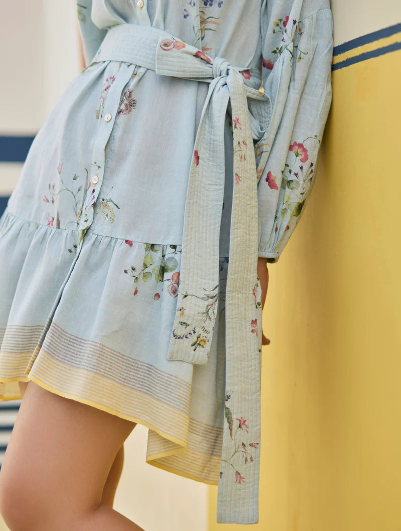 A button-down shirt dress with a broad gathered frill designed in our soft handloom linen cotton with a self-woven stripe border and coloured selvedge. The Alara is printed with hand-illustrated and hand-painted floral watercolor motifs and has mother of pearl buttons with a floral printed linen belt accented with parallel top-stitch lines.