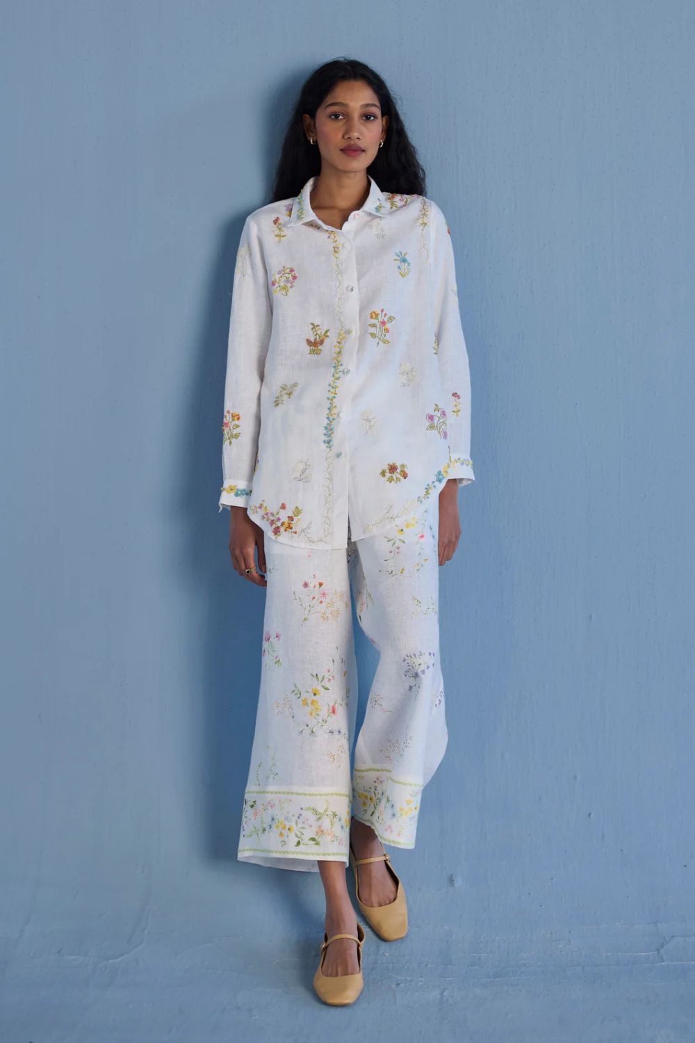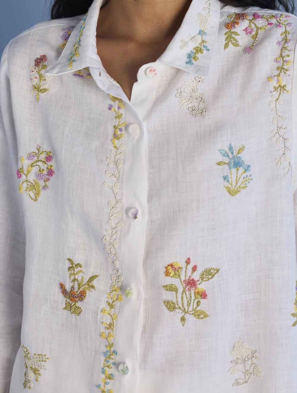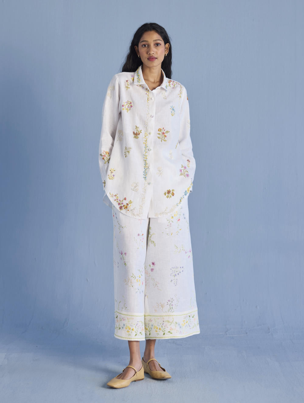 Top - Our favourite statement shirt crafted in our soft signature yarn-dyed linen is meticulously hand-embroidered with delicate, yet textural, floral motifs in mixed materials using multi-colour threads and beads. The shirt is finished with a long side slit detail and floral printed linen buttons.