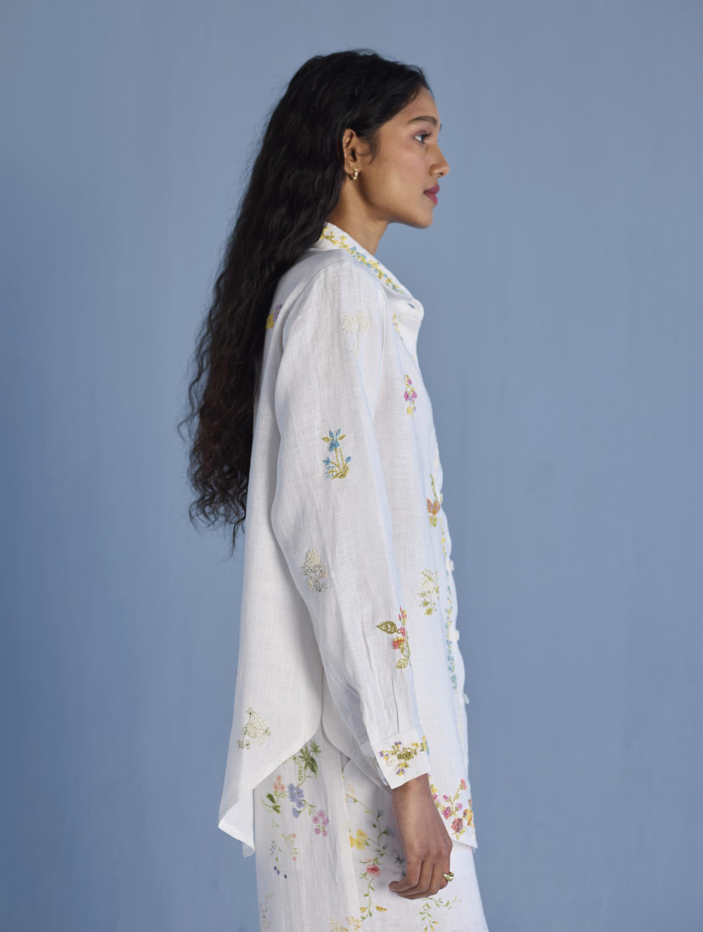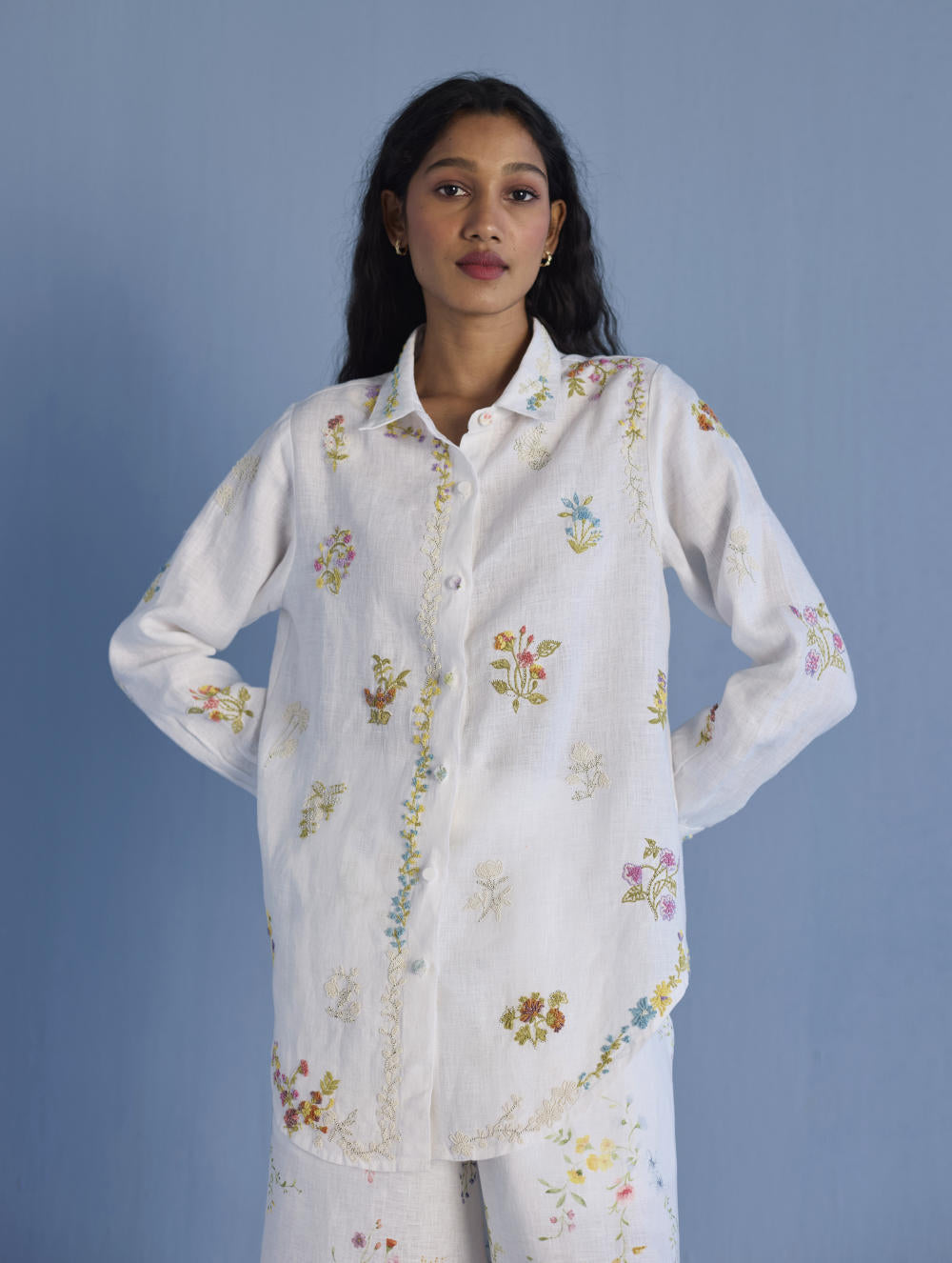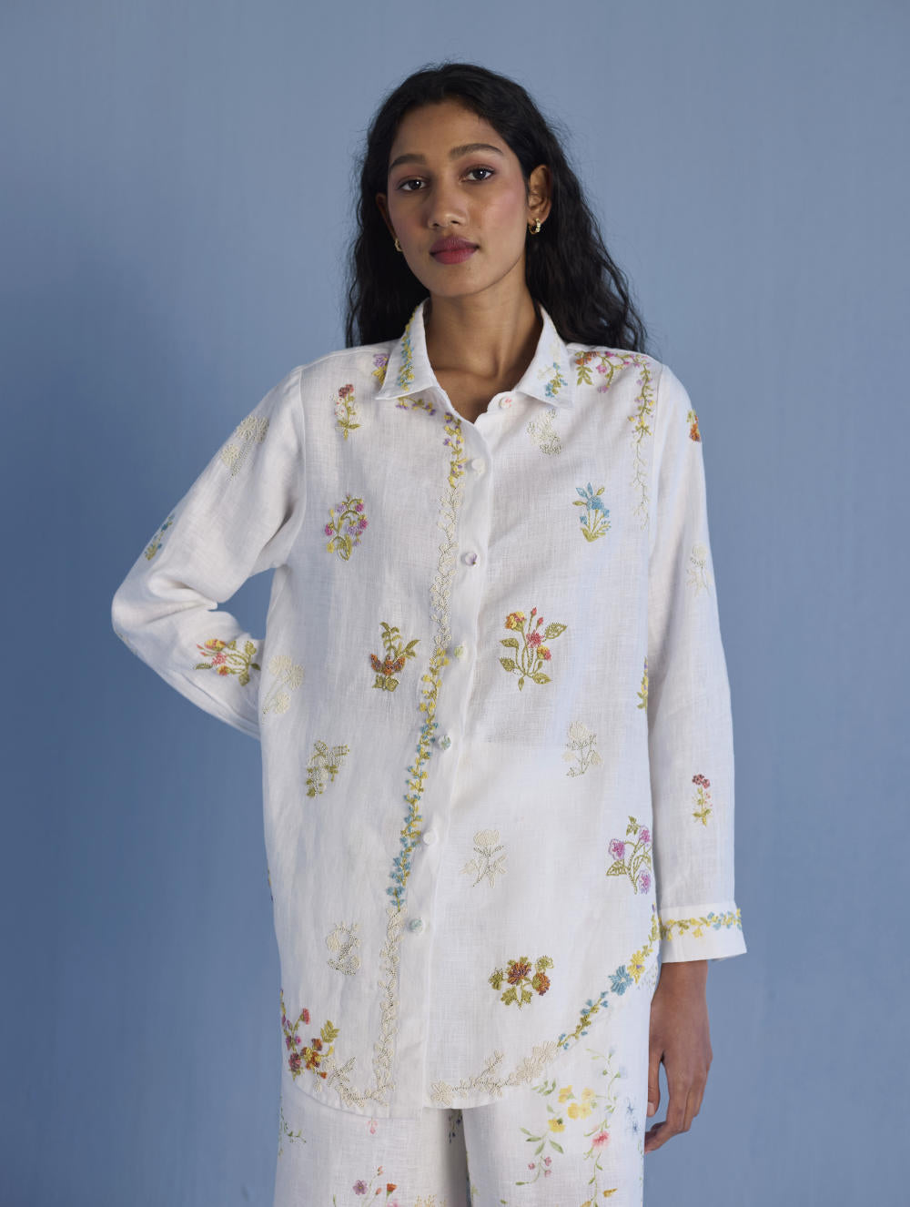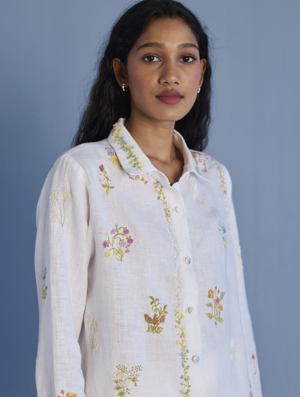 Top - Our favourite statement shirt crafted in our soft signature yarn-dyed linen is meticulously hand-embroidered with delicate, yet textural, floral motifs in mixed materials using multi-colour threads and beads. The shirt is finished with a long side slit detail and floral printed linen buttons.