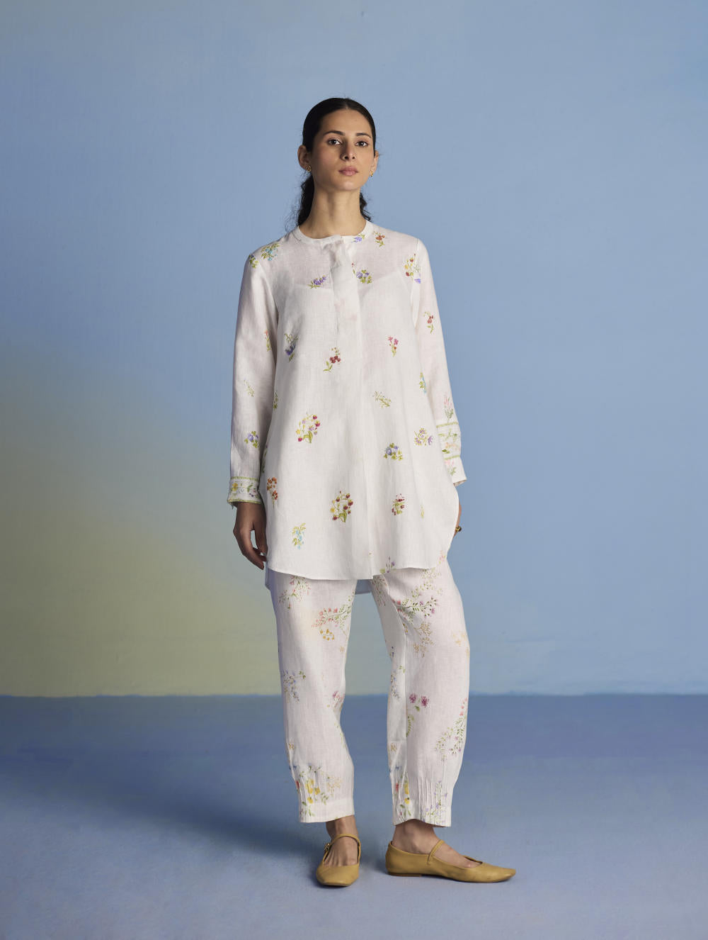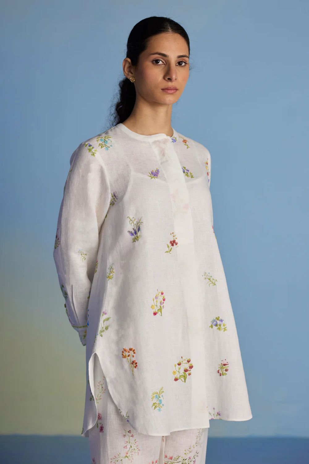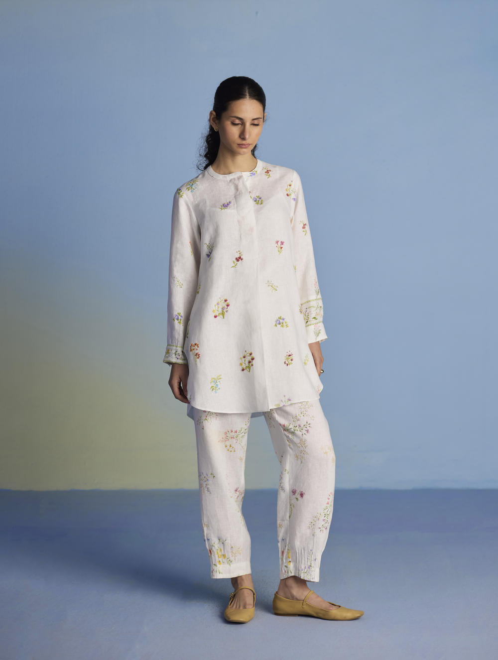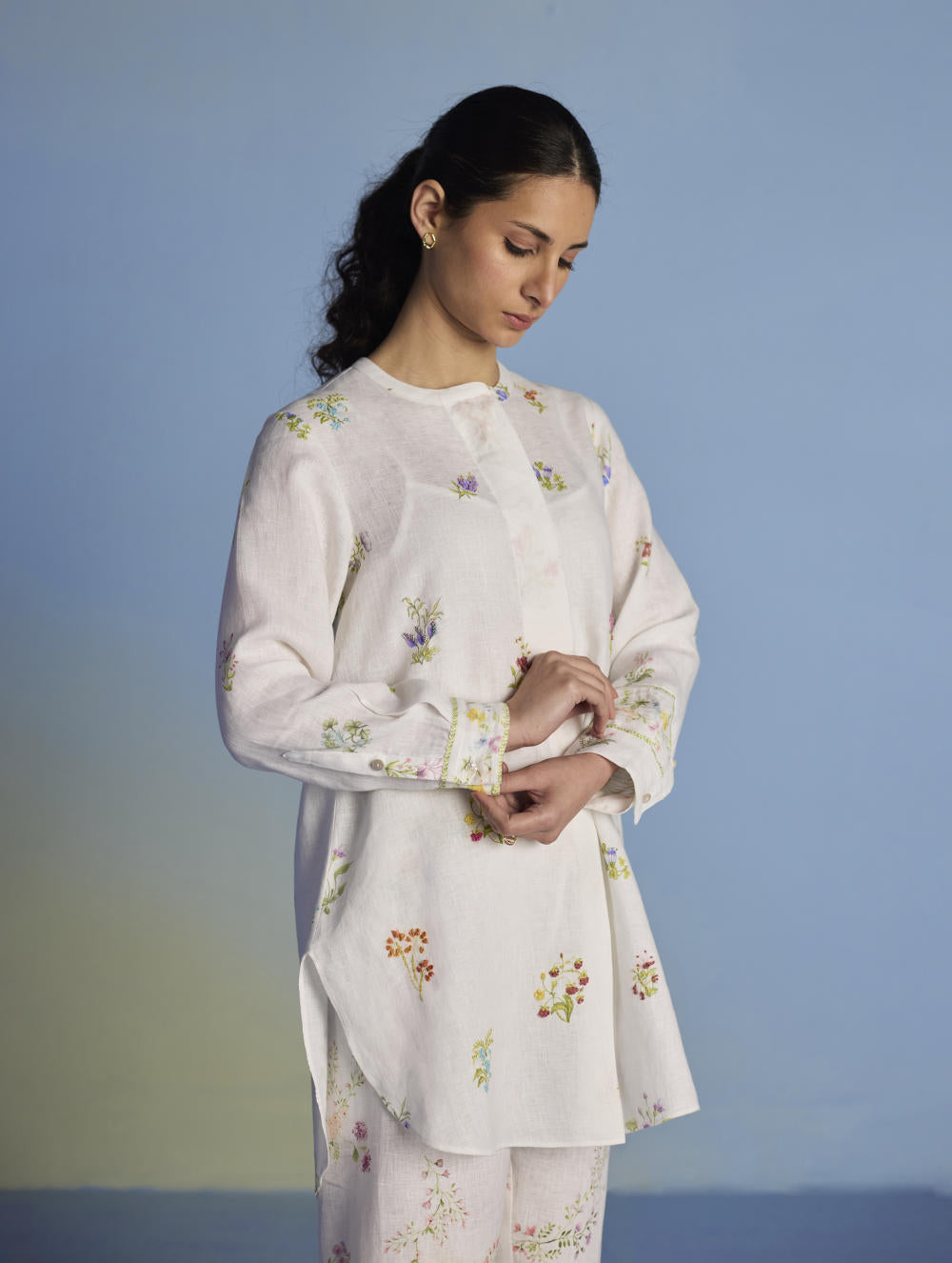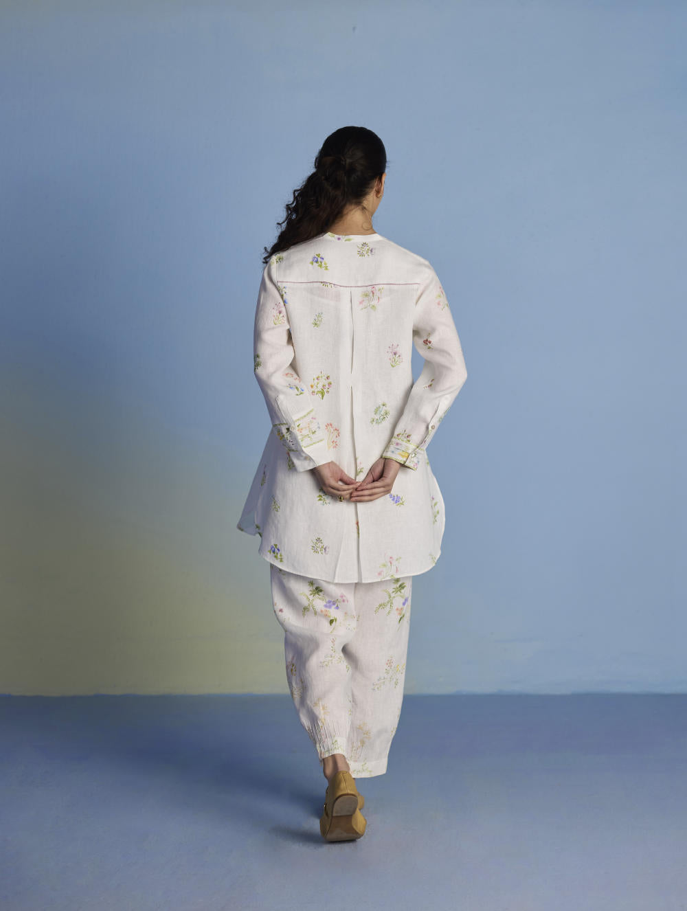 A statement short kurta crafted from our signature soft yarn-dyed linen featuring a detailed hand-painted floral print intricately hand-embroidered with beads, zardozi thread work and french knots. The kurta has a concealed placket, a stylized pleat at the back and printed border with pintucks detailing on the sleeves.