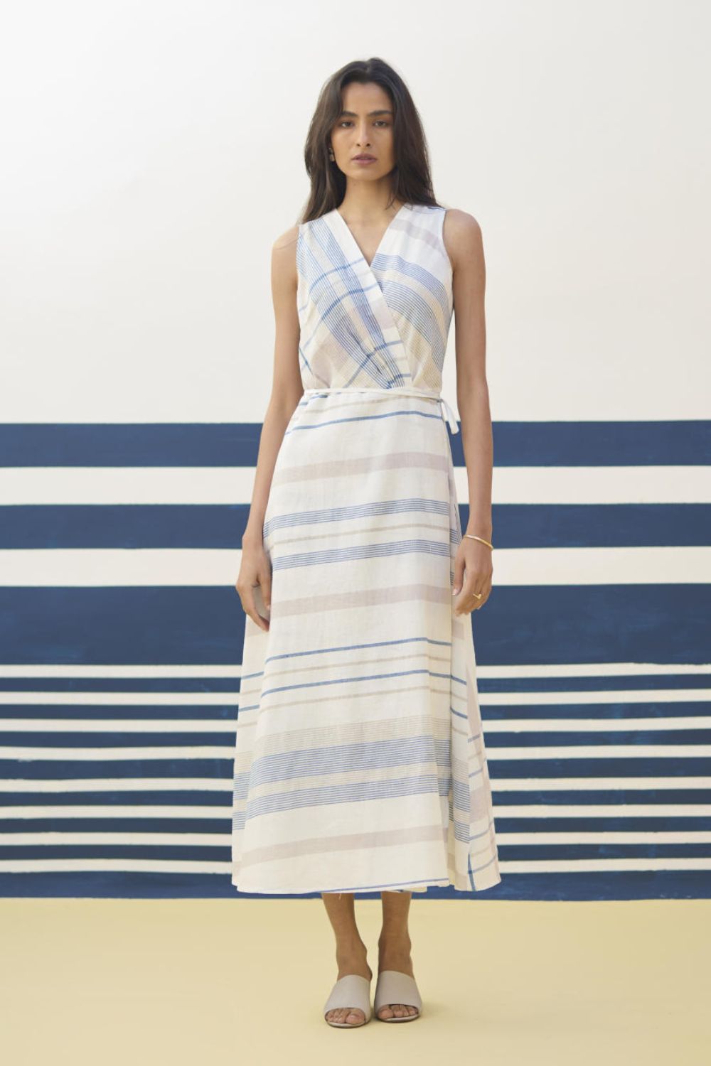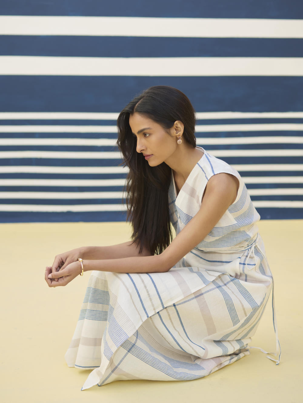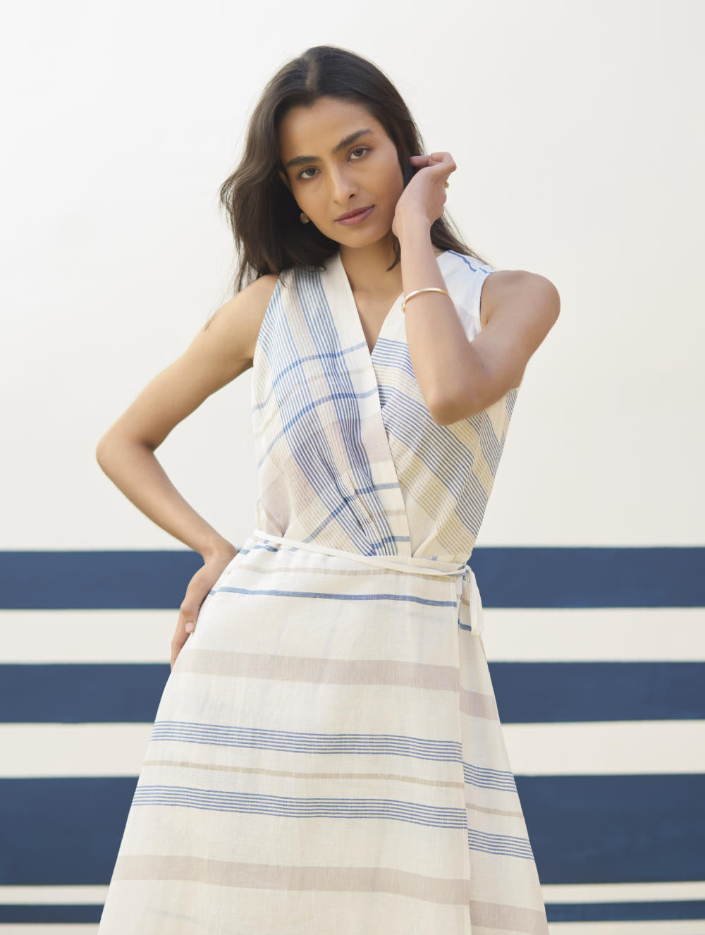 Our favourite, most versatile sleeveless wrap dress in soft handloom linen cotton check - layer it with a jacket or wear it with our statement bracelets for the perfect look.