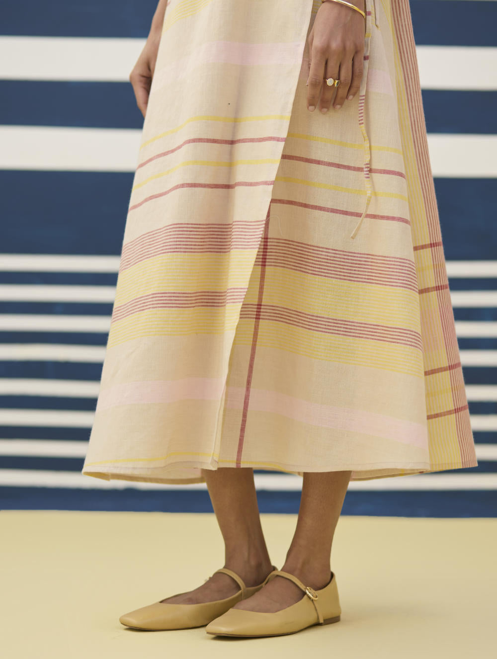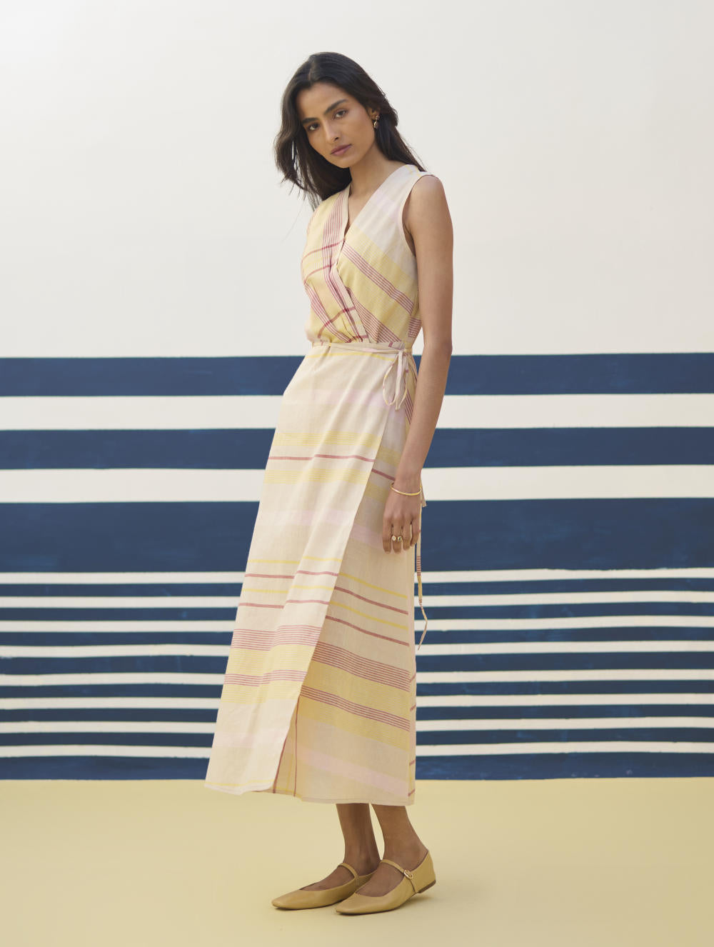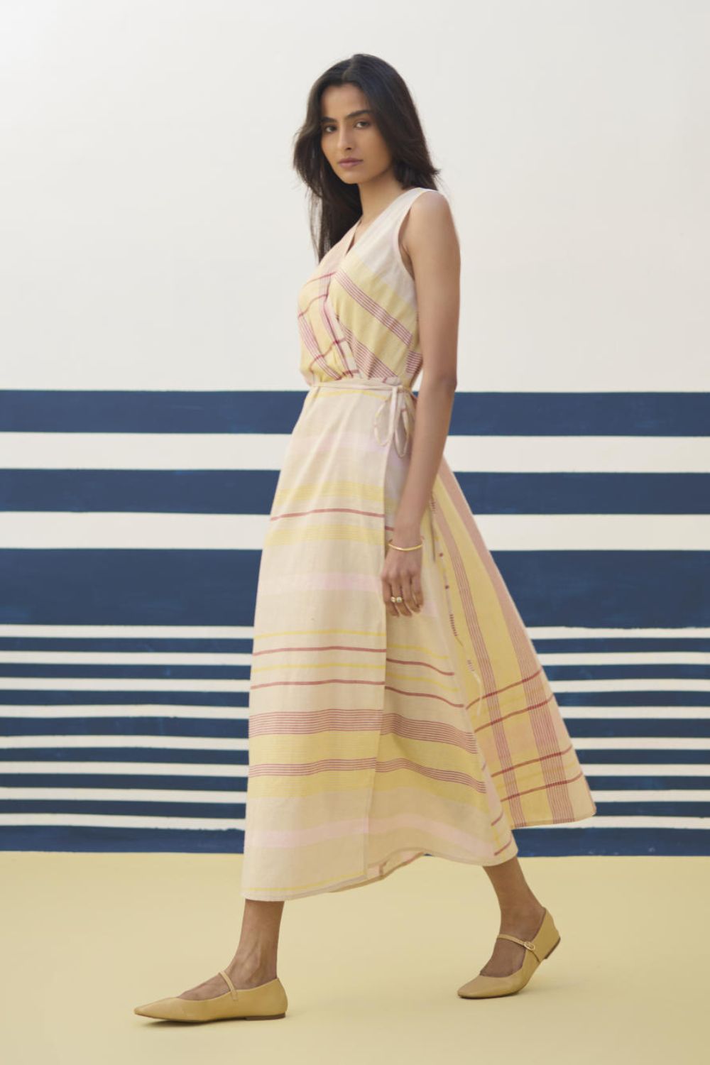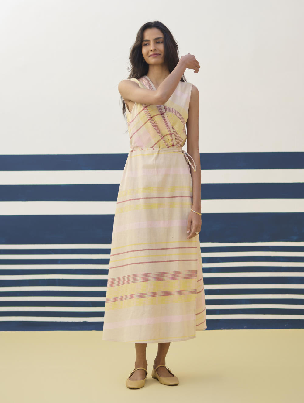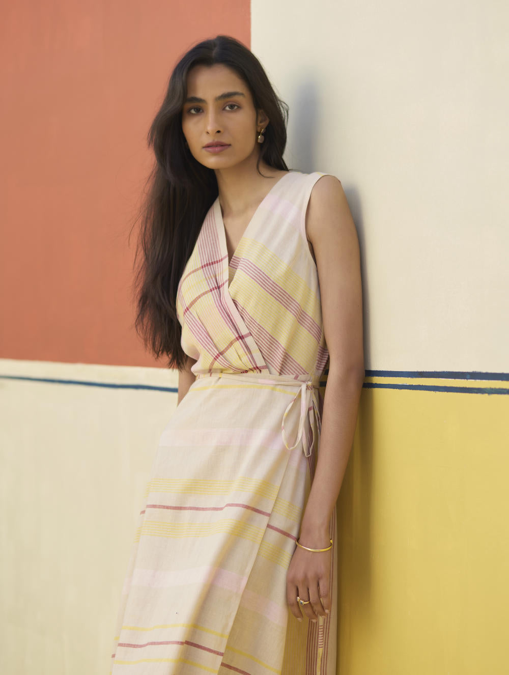 Our favourite, most versatile sleeveless wrap dress in soft handloom linen cotton check - layer it with a jacket or wear it with our statement bracelets for the perfect look.