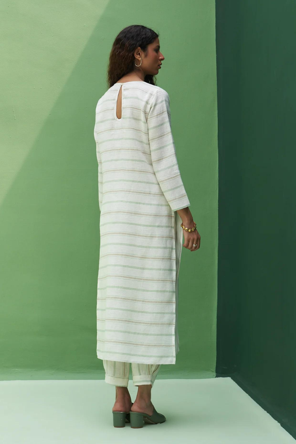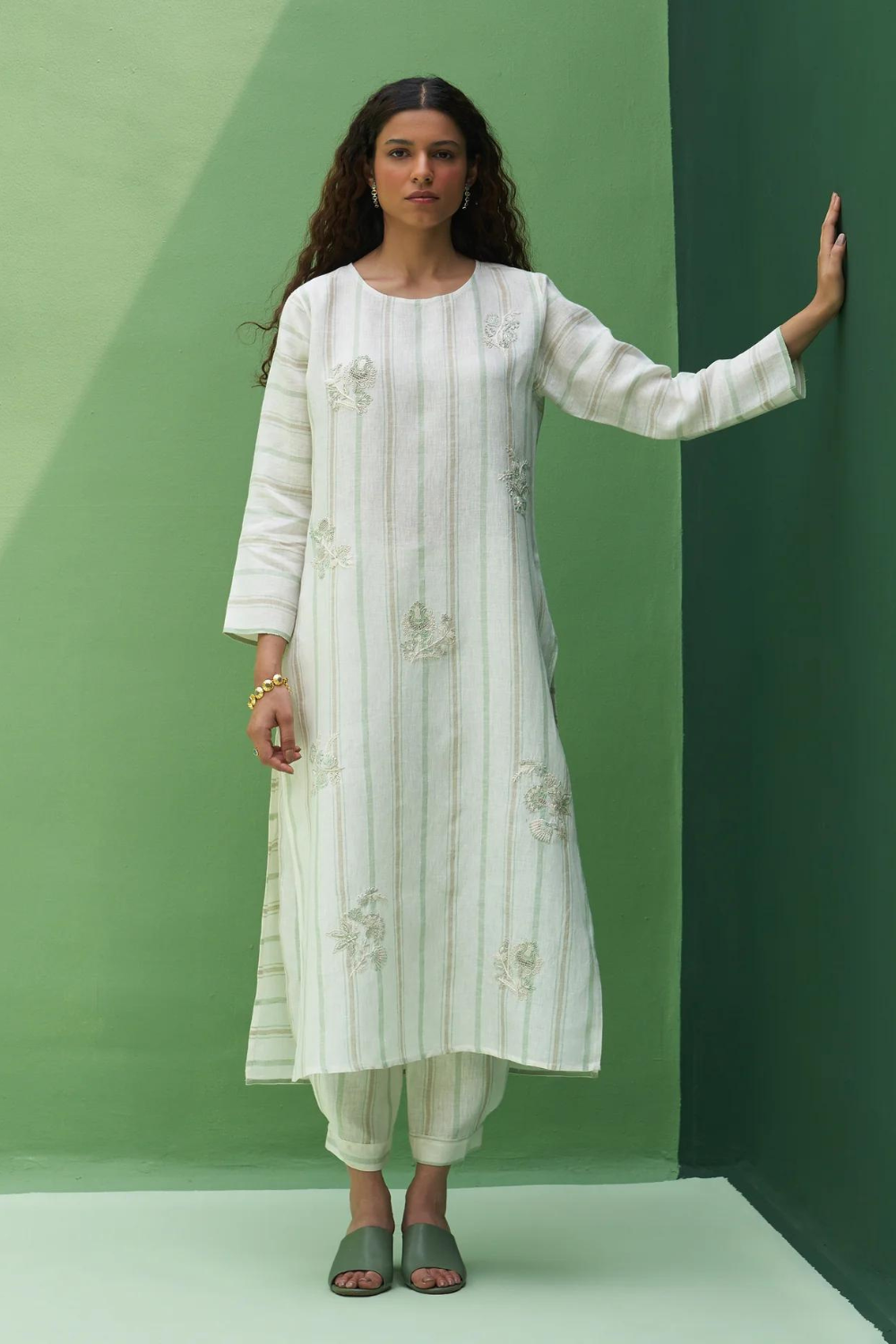 Our best-selling boat neck kurta re-imagined in our soft handloom striped linen, intricately hand-embroidered with floral motifs in mixed techniques of cord-work, french knots, threadwork and fine mesh/jaali like patches which are crocheted completely by hand. Definitely a forever favourite.