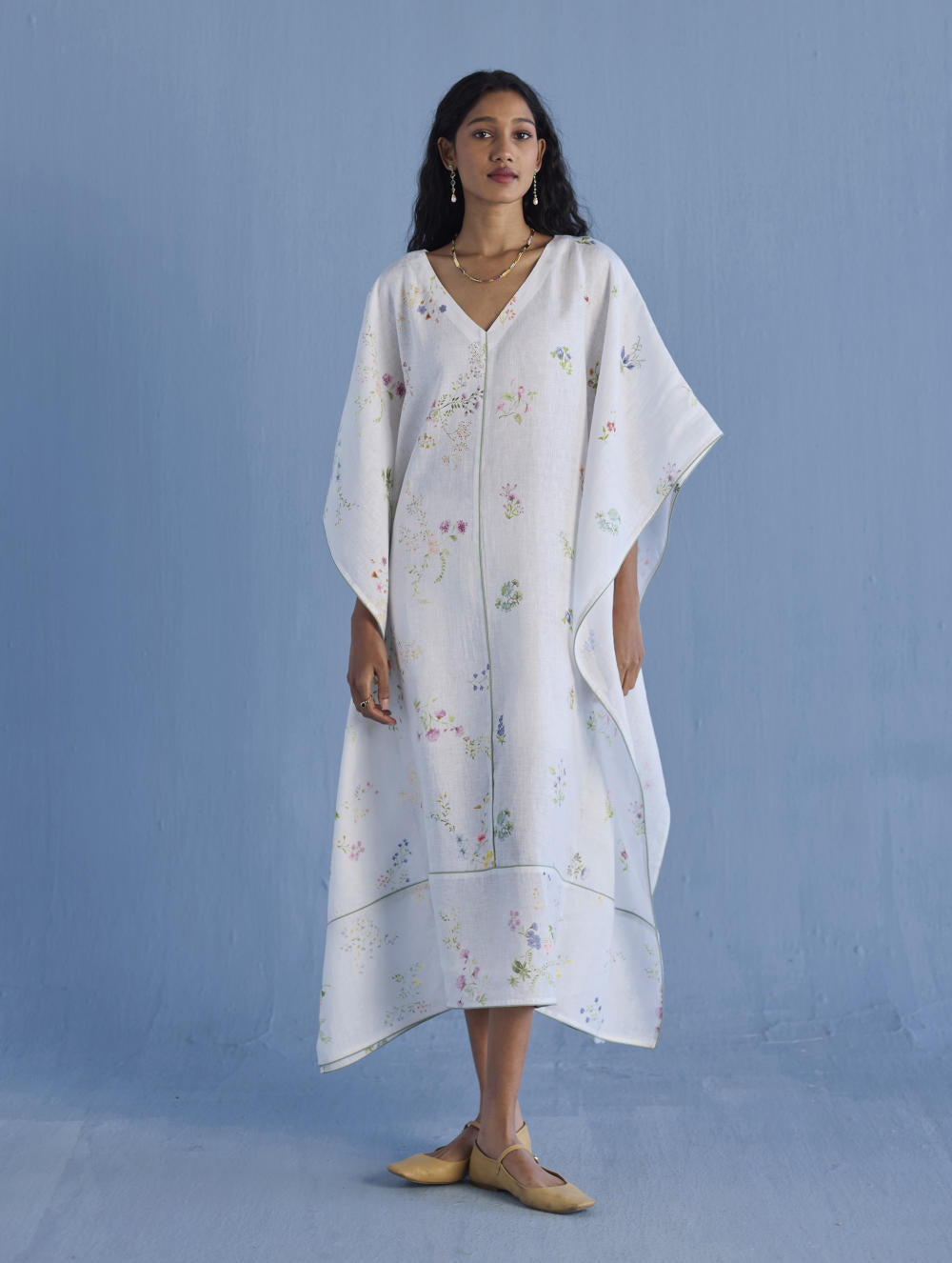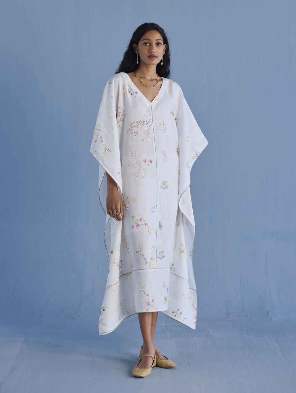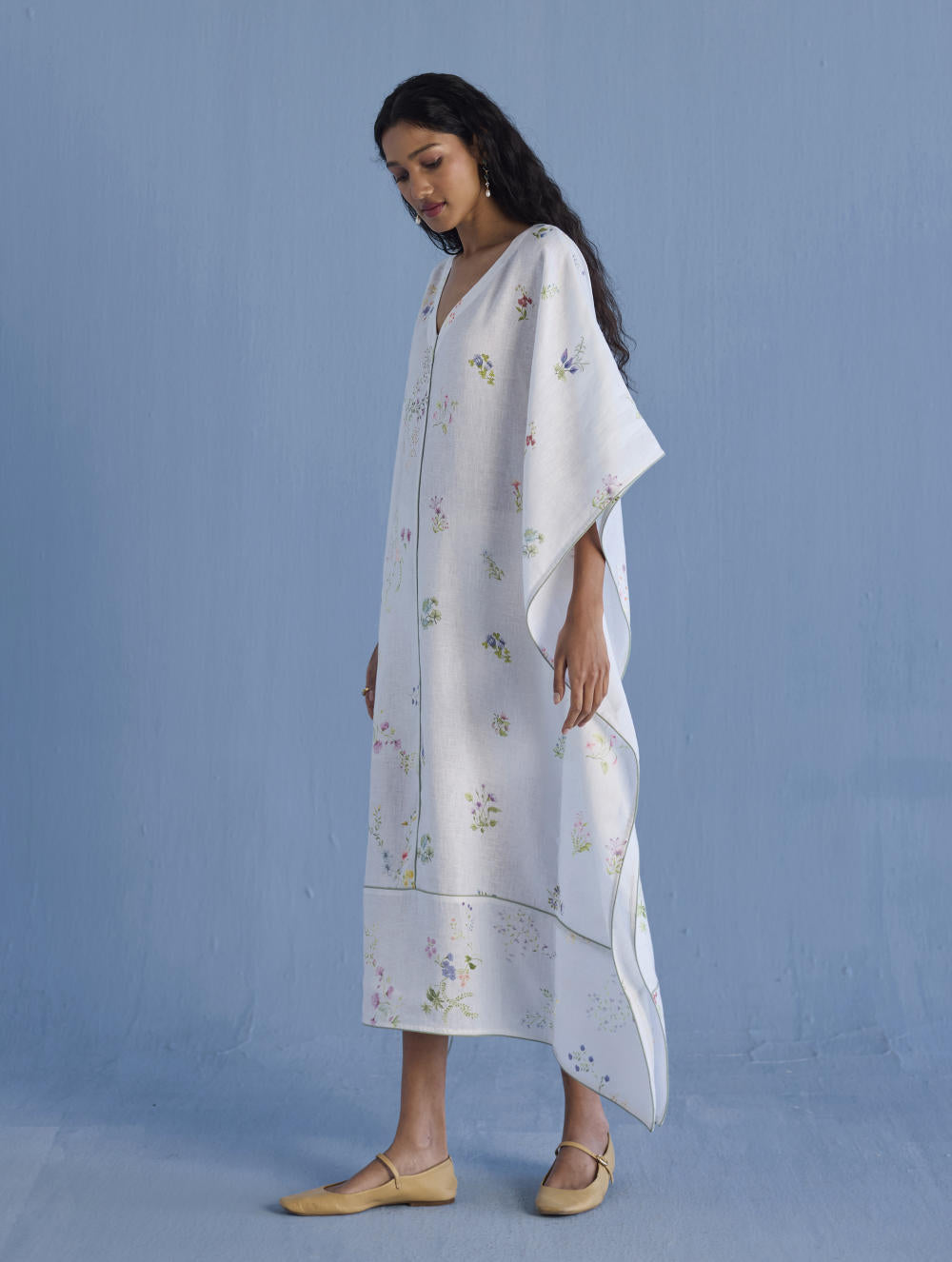 A statement kaftan designed in our signature soft yarn-dyed linen printed in two hand-painted floral prints - a jaal floral print and a buta (motif) floral print. The kaftan has comfortable pockets and is accented with an intricate contrast linen edging/piping on the front and back.