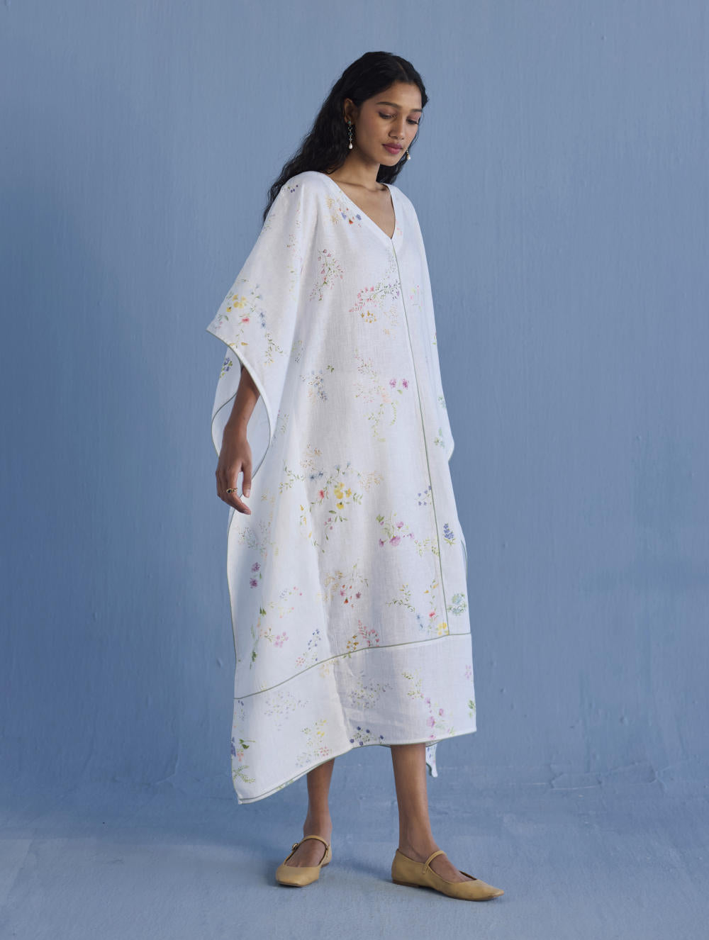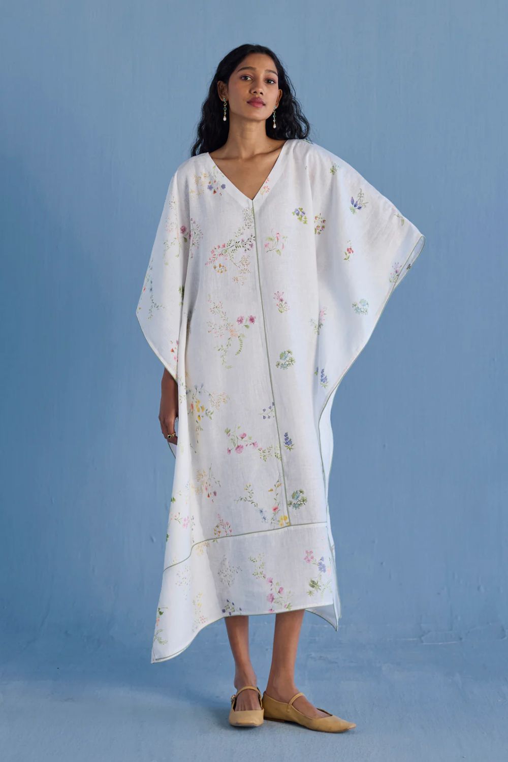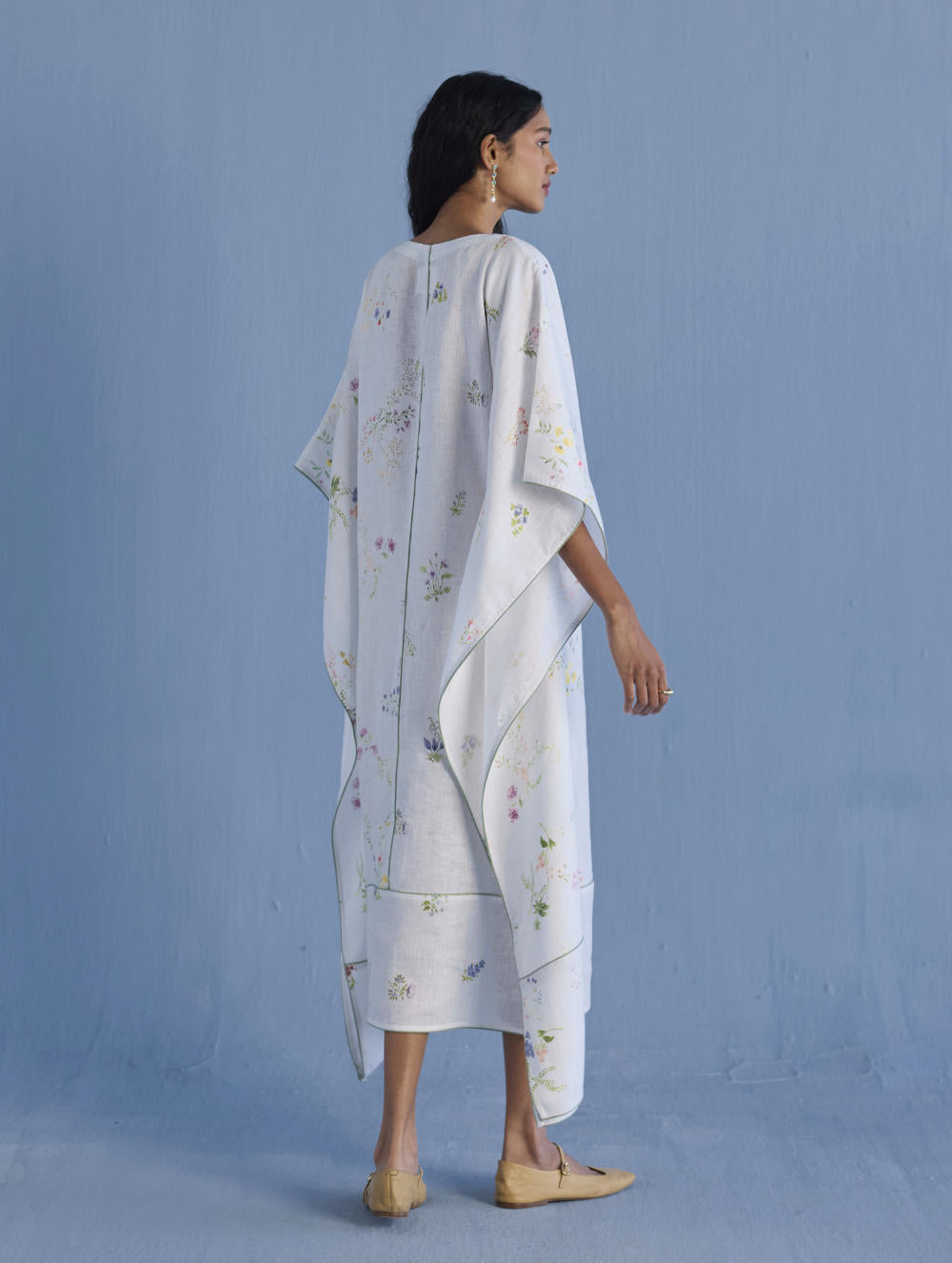 A statement kaftan designed in our signature soft yarn-dyed linen printed in two hand-painted floral prints - a jaal floral print and a buta (motif) floral print. The kaftan has comfortable pockets and is accented with an intricate contrast linen edging/piping on the front and back.