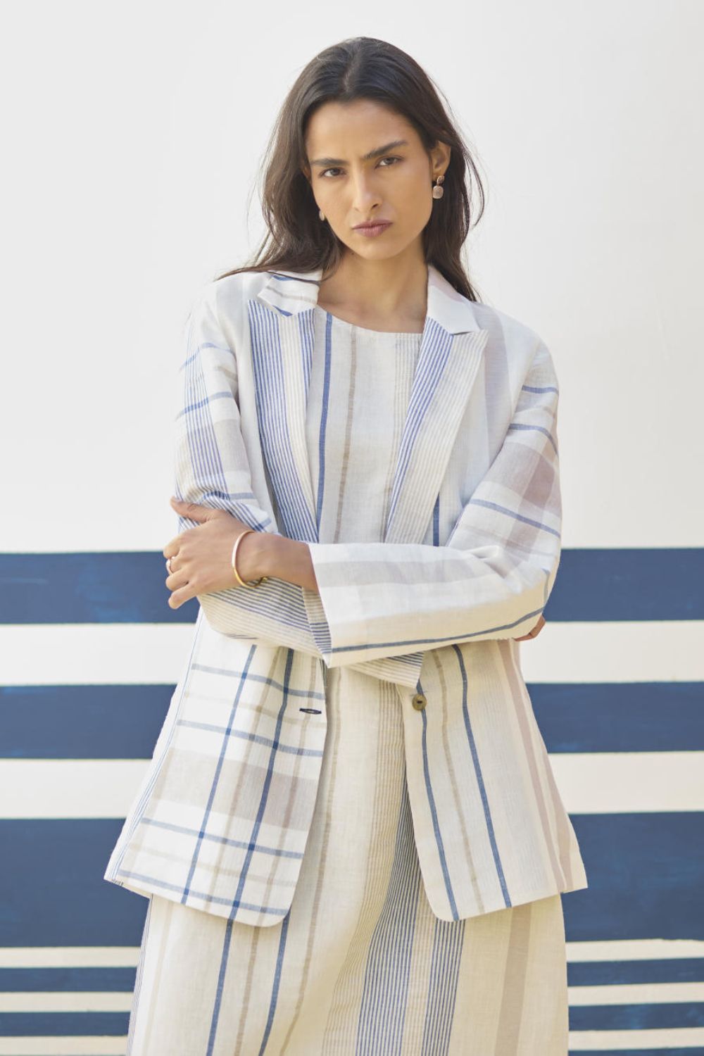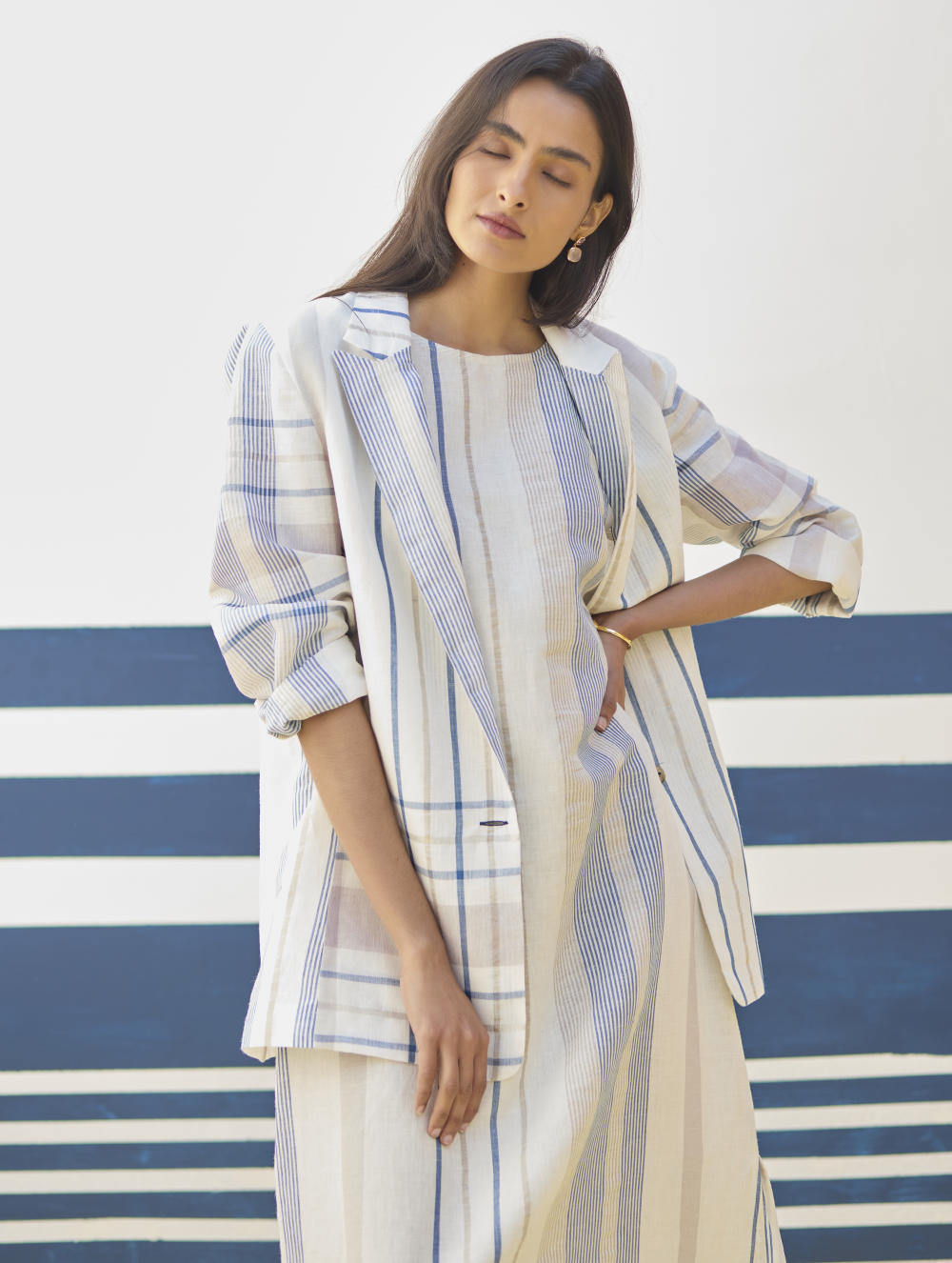 Dress- A sleeveless ankle length dress in our bespoke handloom soft linen cotton check. The Inara dress is designed has a key-hole at the back and a one side slit. The versatile dress is ideal for casual outings and special occasions, effortlessly combining comfort and style. Blazer- Tailored blazer designed in our soft handloom linen cotton woven with a modern check pattern. Finished with timeless mother-of-pearl buttons, Talia exudes sophistication and timeless style.