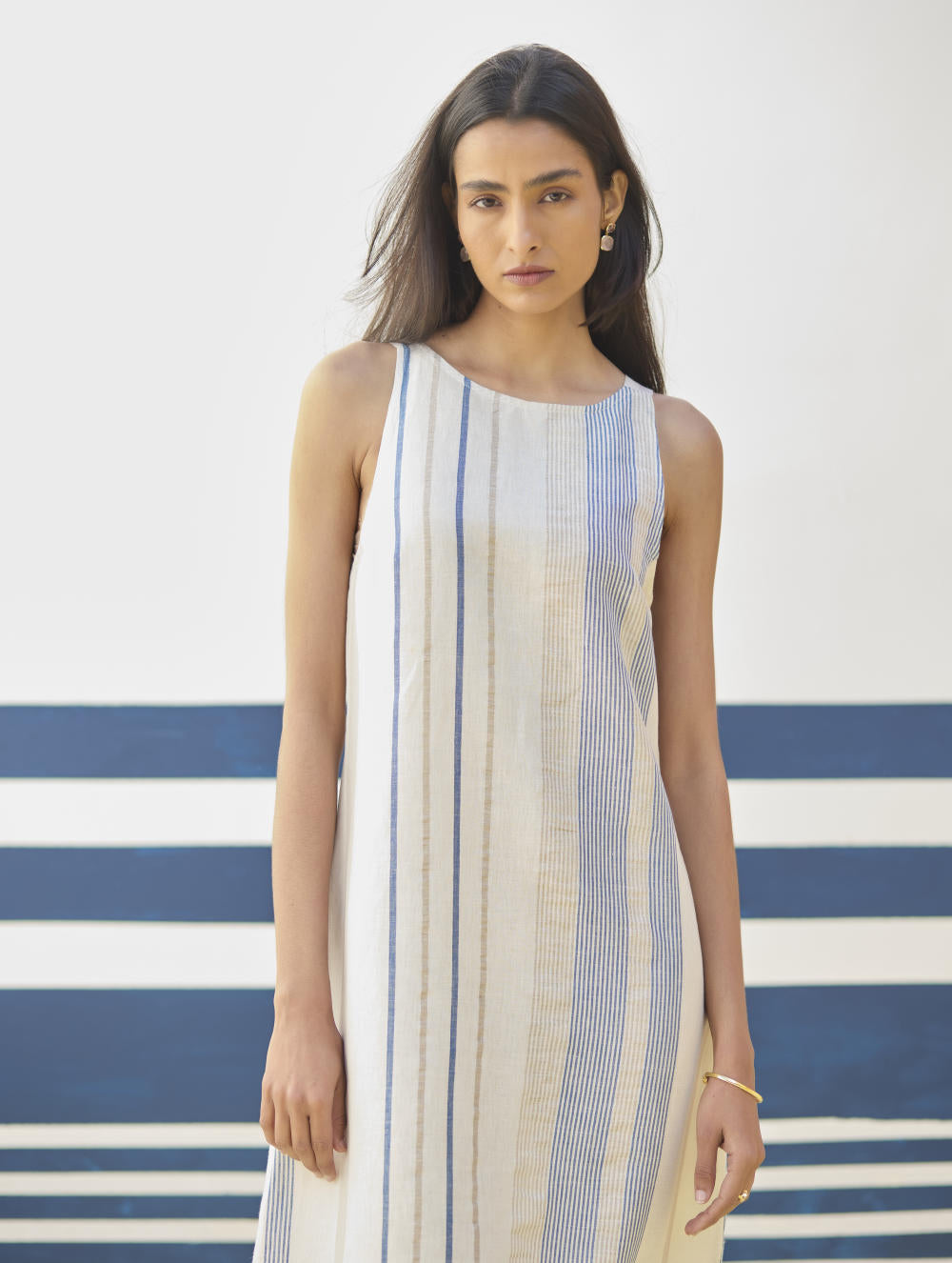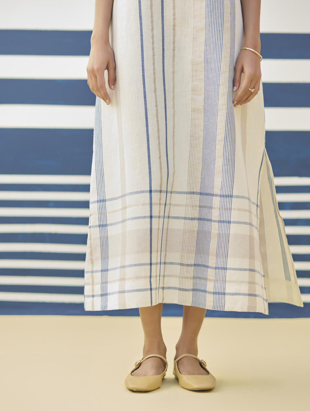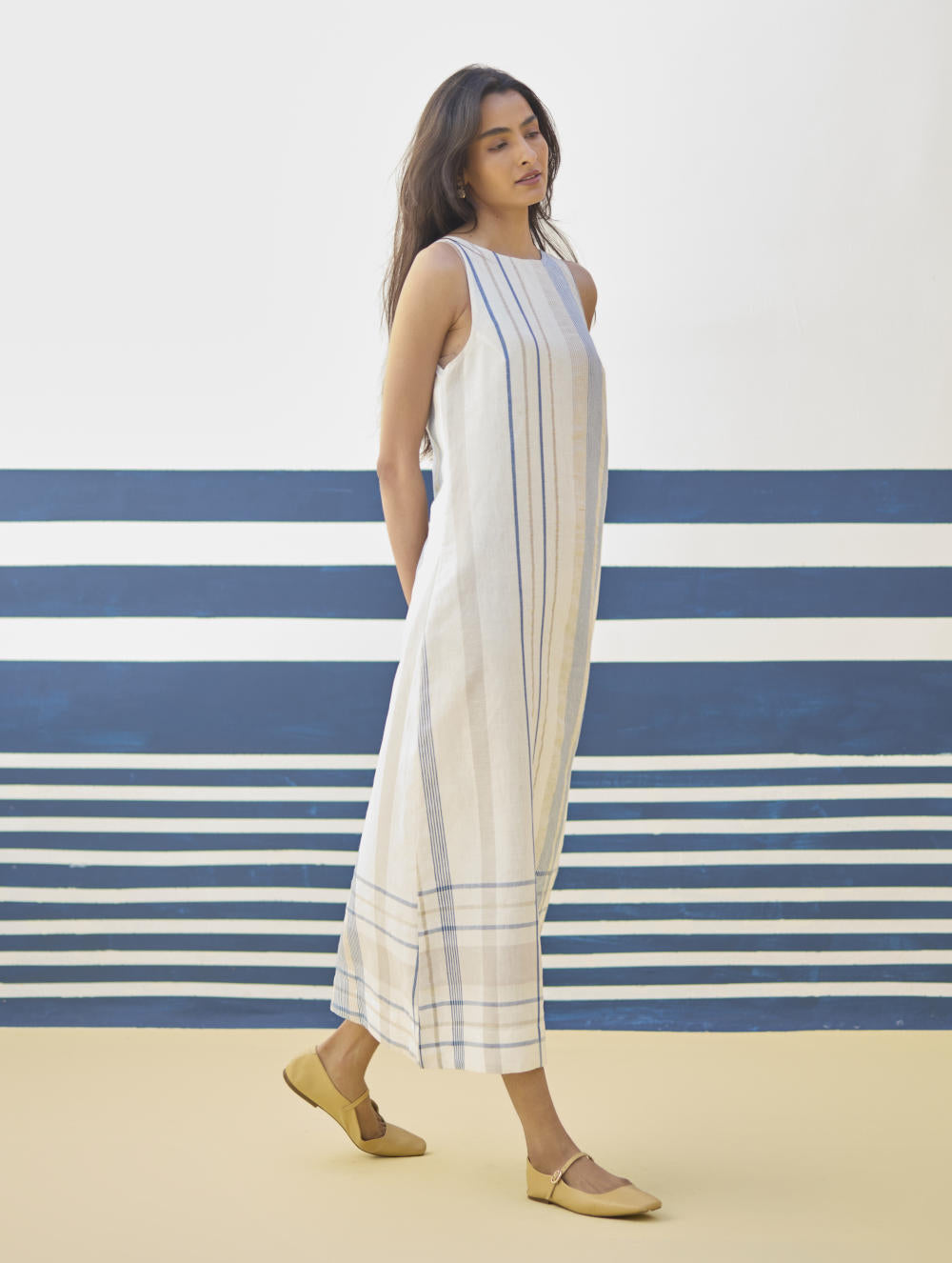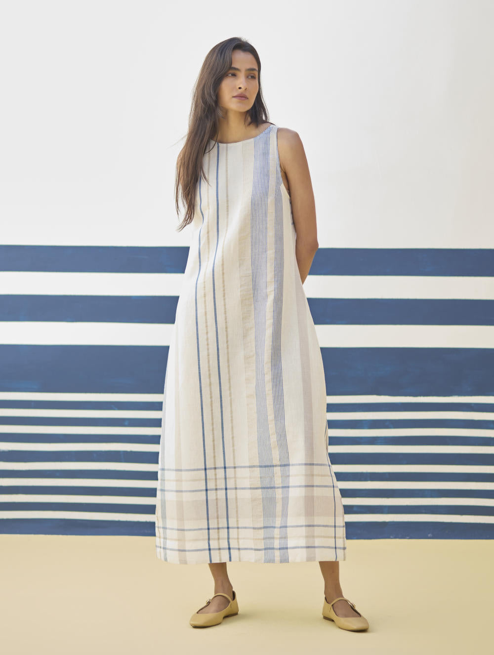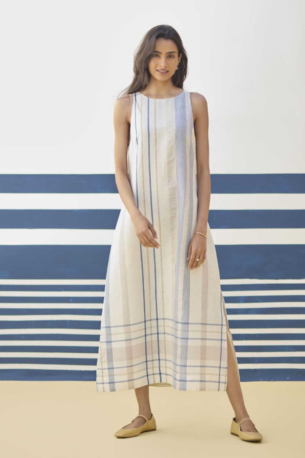 A sleeveless ankle length dress in our bespoke handloom soft linen cotton check. The Inara dress is designed has a key-hole at the back and a one side slit. The versatile dress is ideal for casual outings and special occasions, effortlessly combining comfort and style.