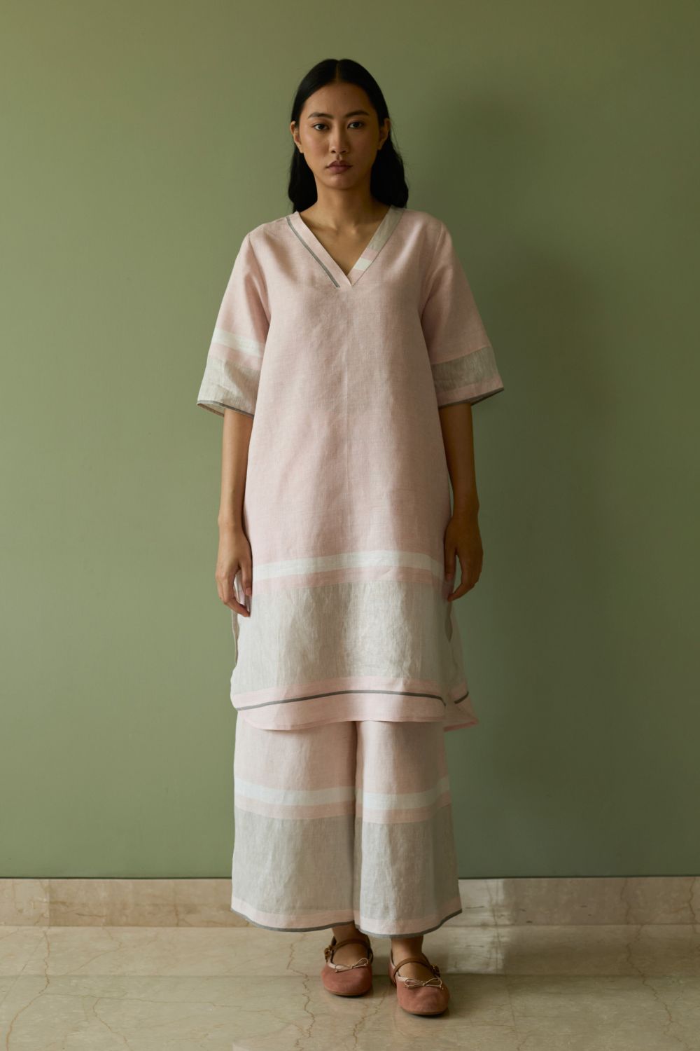 Kurta - This timeless versatile kurta is designed in our bespoke handwoven soft metallic border linen with a grey selvedge. The Iva Kurta has pockets and is accented with a metallic border at the hemline with a woven grey edging placed at the hemline, neckline and sleeves. The Iva works for all occasions and is one of our year-round favourites.