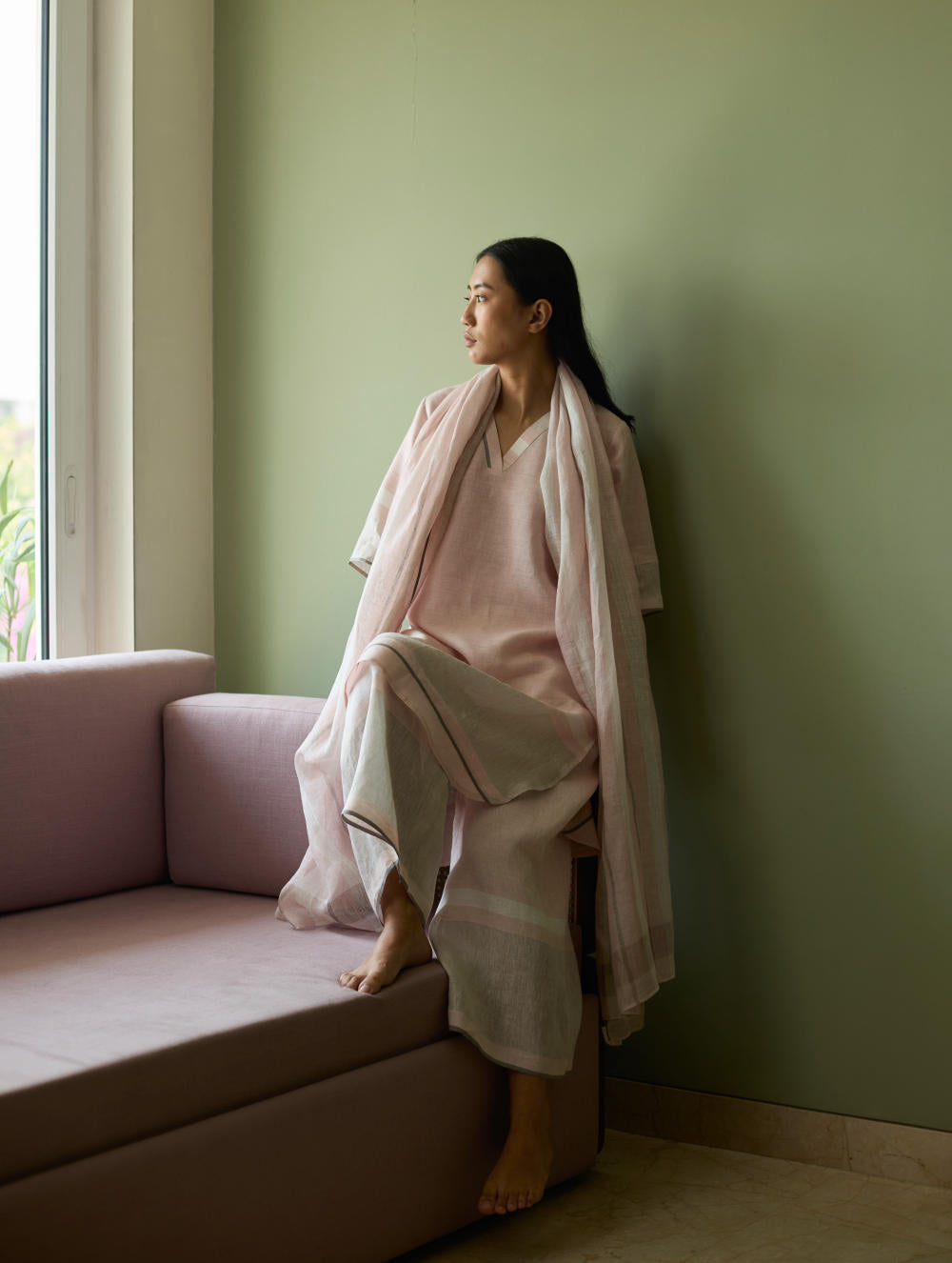 Their signature linens soften beautifully with time, eventually returning to the earth. They work with eri (ahimsa) silk, celebrated for its strength and gentle texture, and craft thoughtful blends of viscose, cotton, silk, and linen for pieces designed to last. Yarn-dyed techniques minimise chemical use and create the subtle, heathered tones that have become a quiet Manan signature.