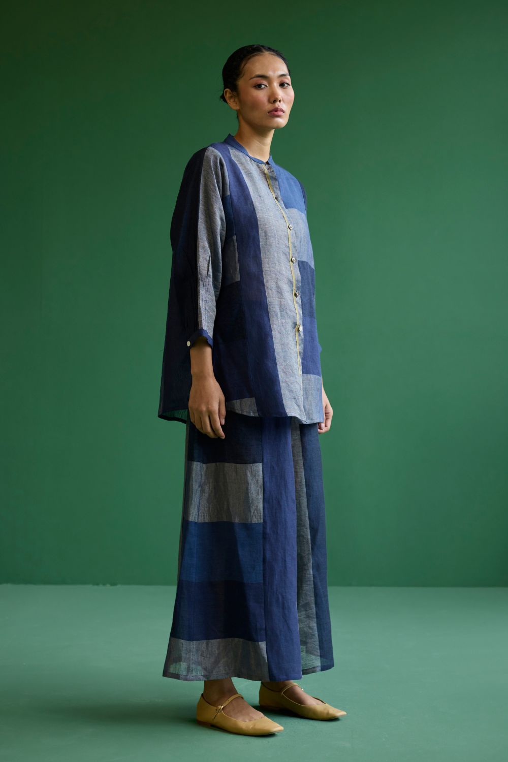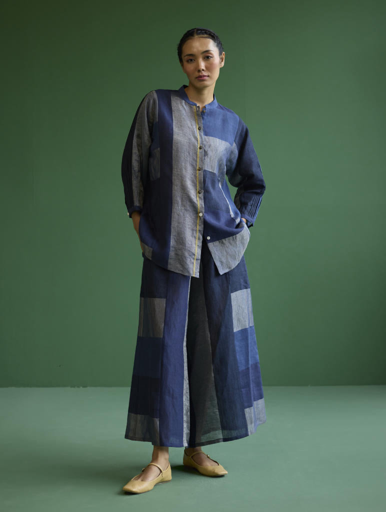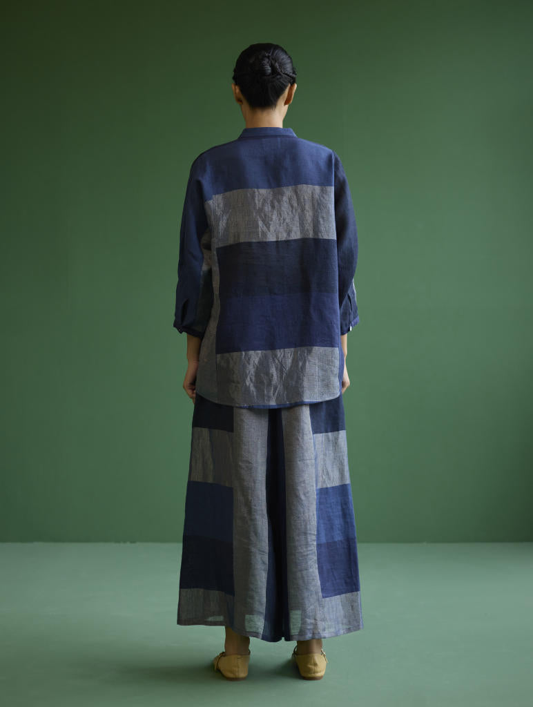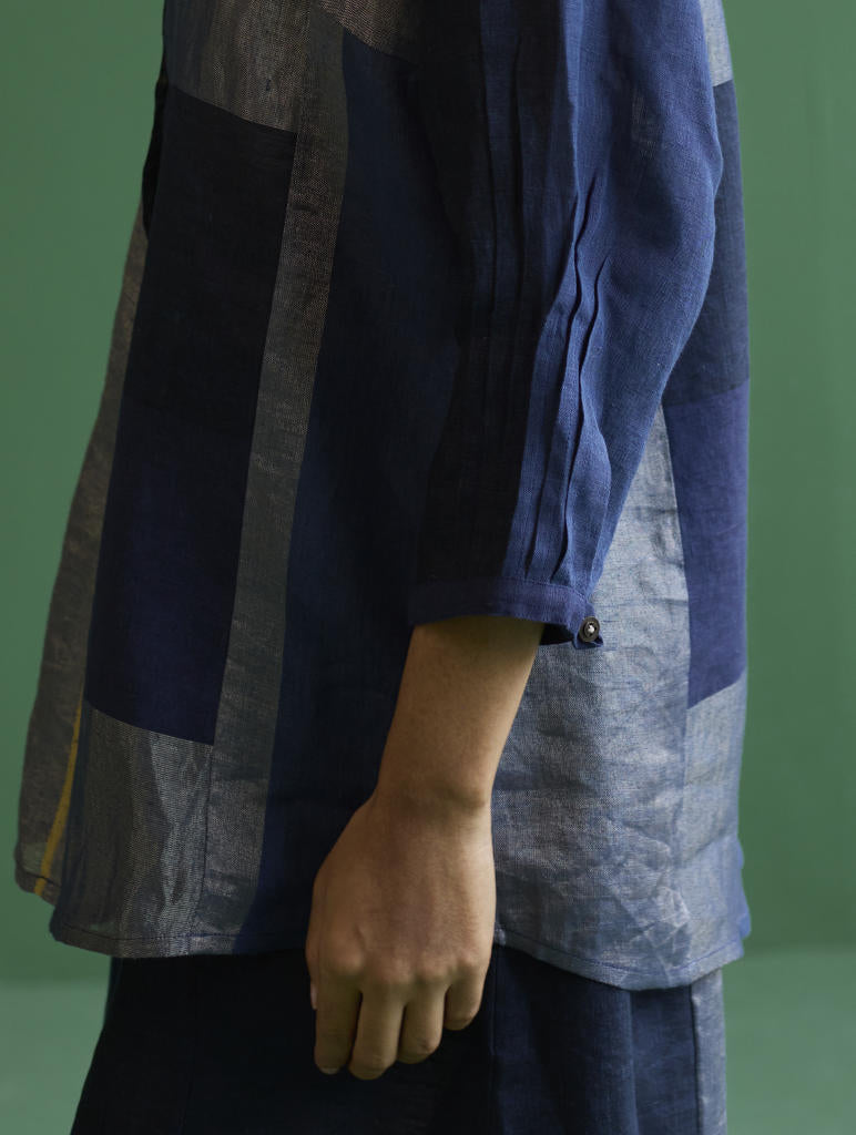 A statement patchwork shirt crafted from our soft handwoven broad striped linen with 3/4th sleeves, a mandarin collar, pleated sleeve cuff detail, brass and linen covered buttons. This Izara shirt will pair beautifully with our classic linen pants and your favorite denims.
