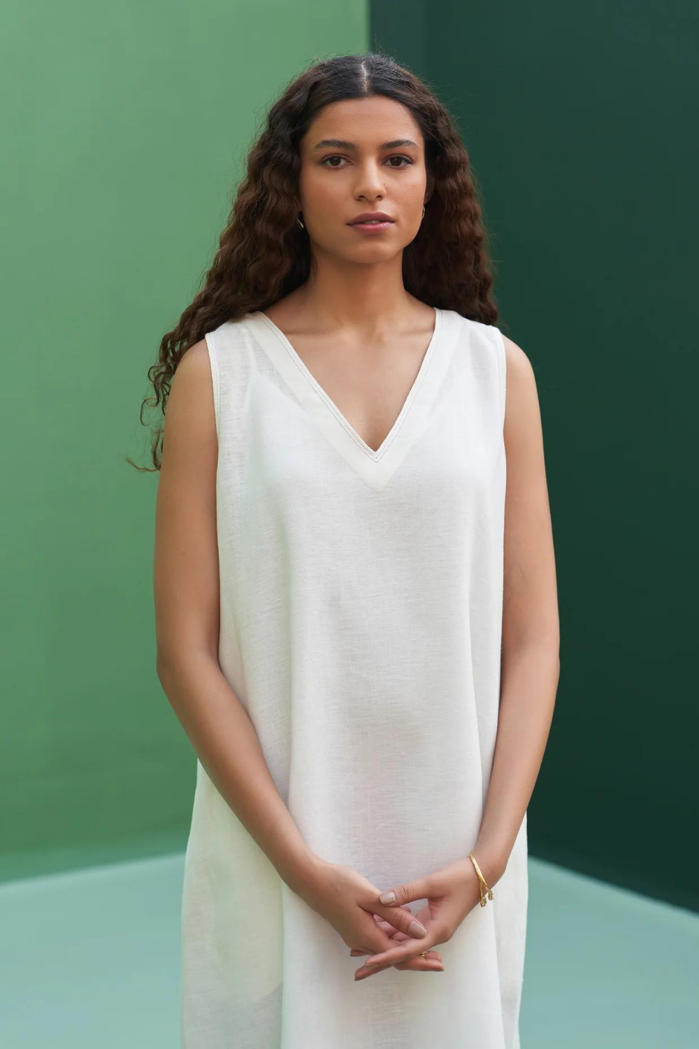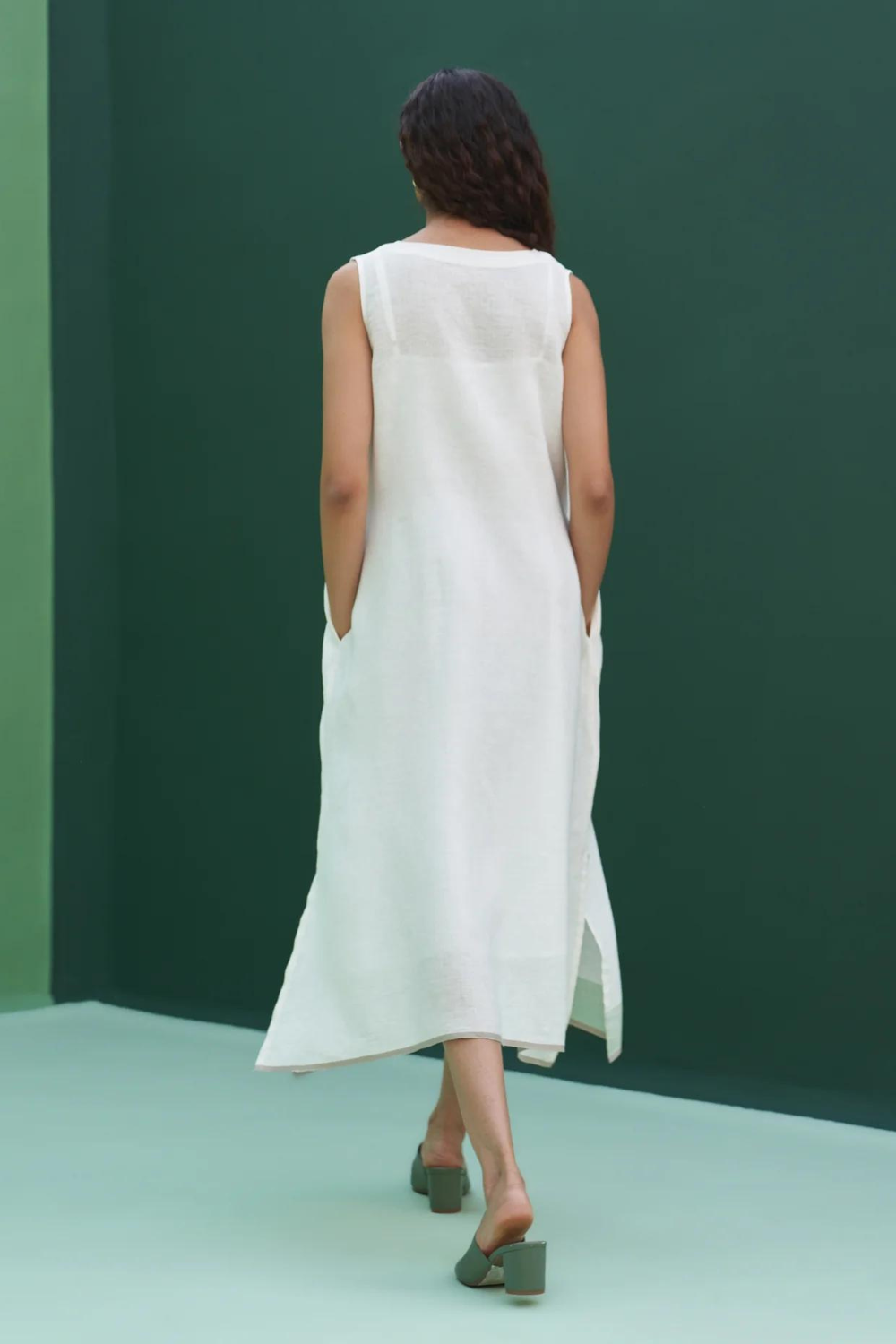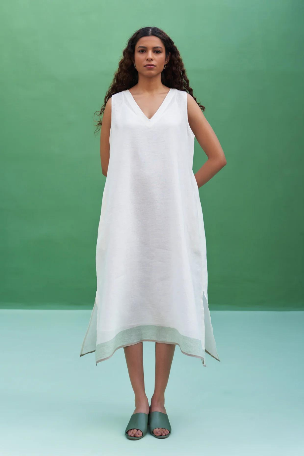 Our most versatile v-neck sleeveless dress handcrafted in our soft handloom linen with a handwoven soft mint border. The Jin dress has pockets, top-stitch detailing and can be worn with an overlay, with pants or as a comfortable summer dress.