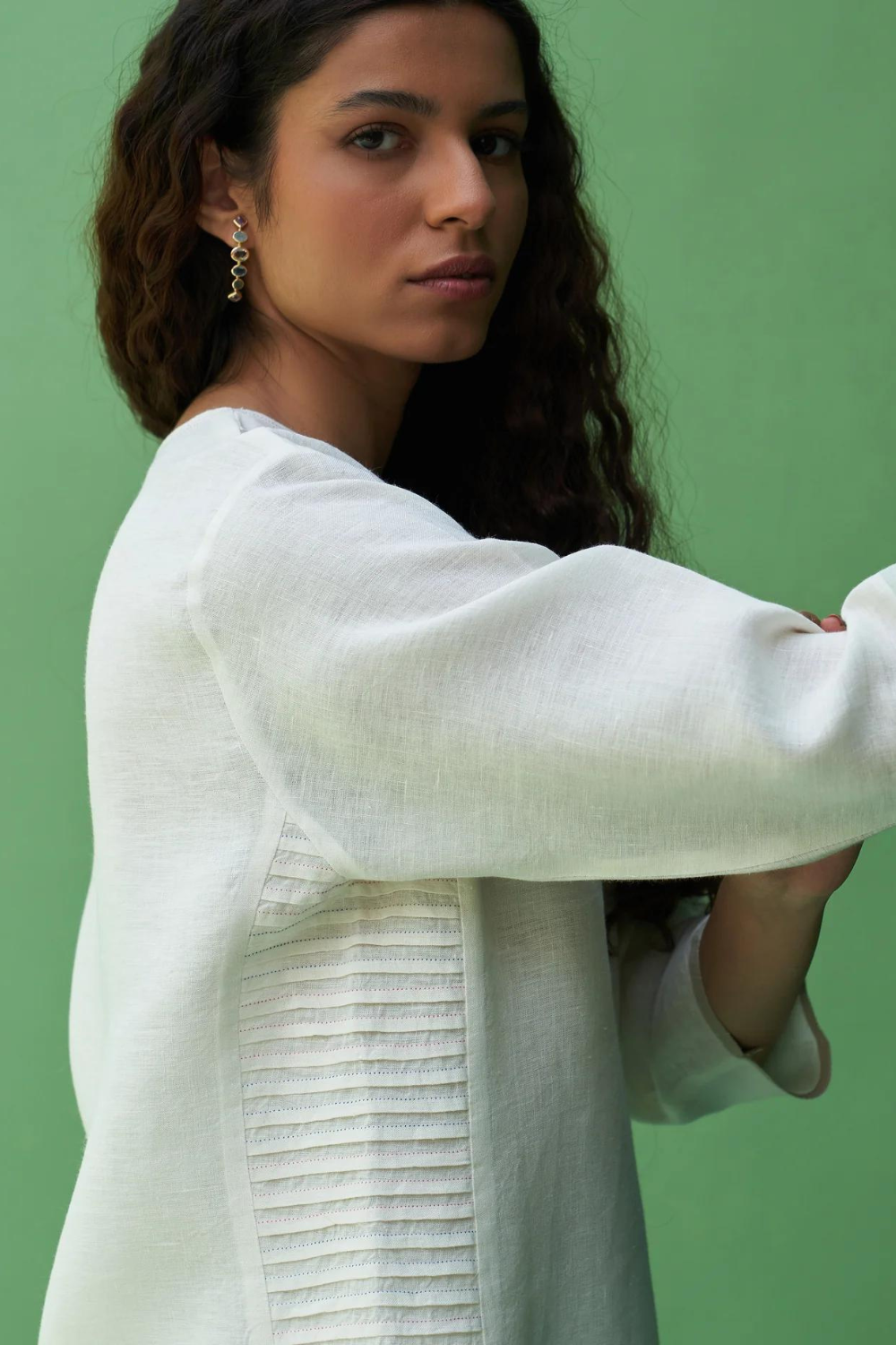 A timeless V-neck classic kurta with pleats hand-stitched on the sides with two coloured topstitch detailing and 3/4th sleeves; the kurta is handcrafted in our soft handloom linen with a handwoven mint border.