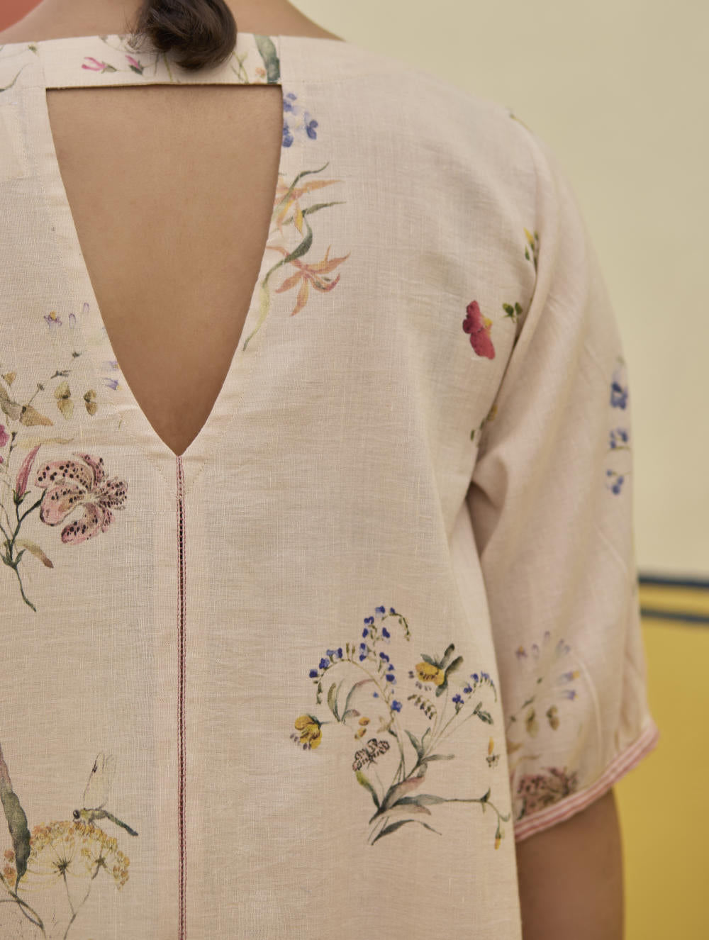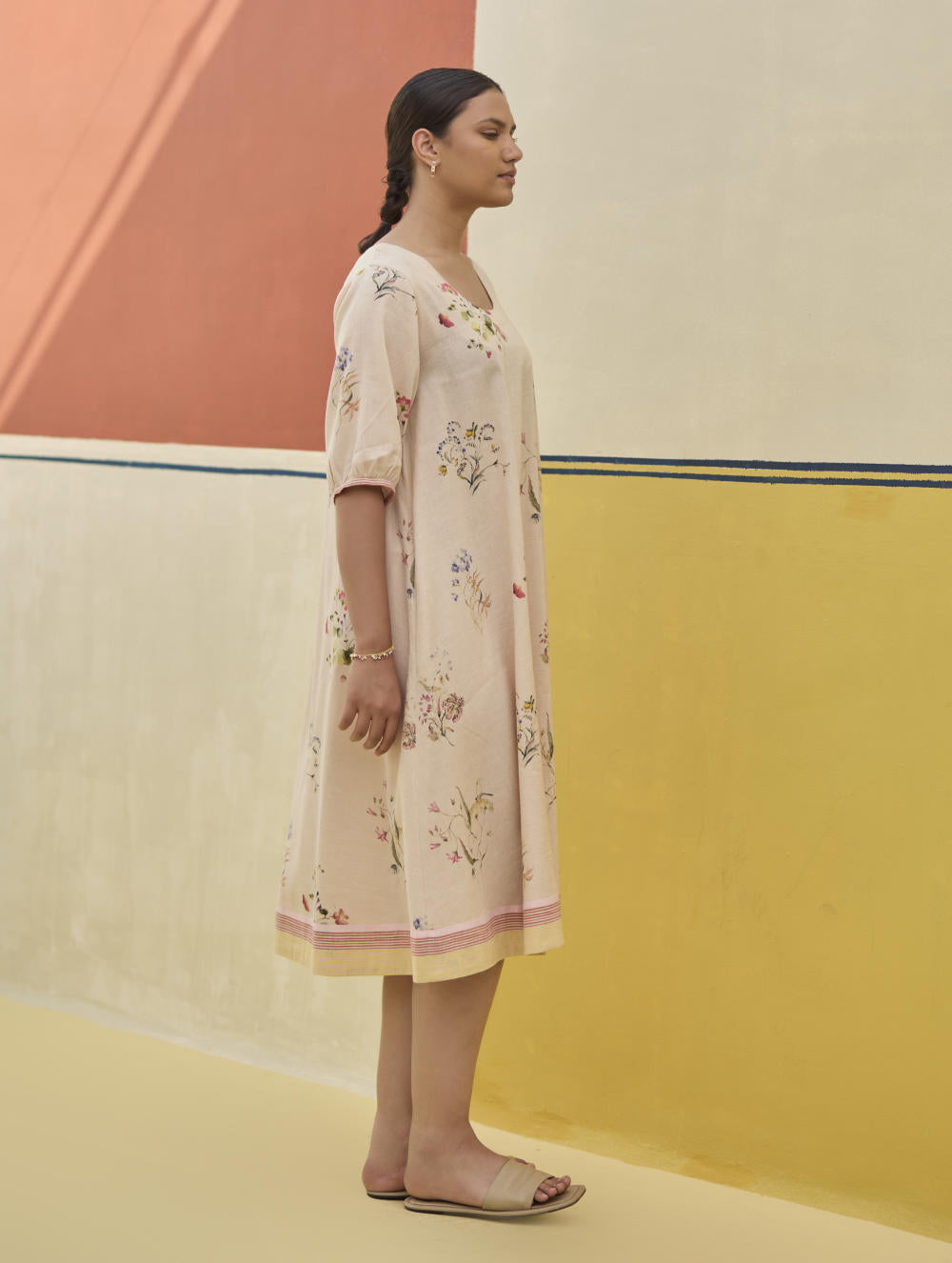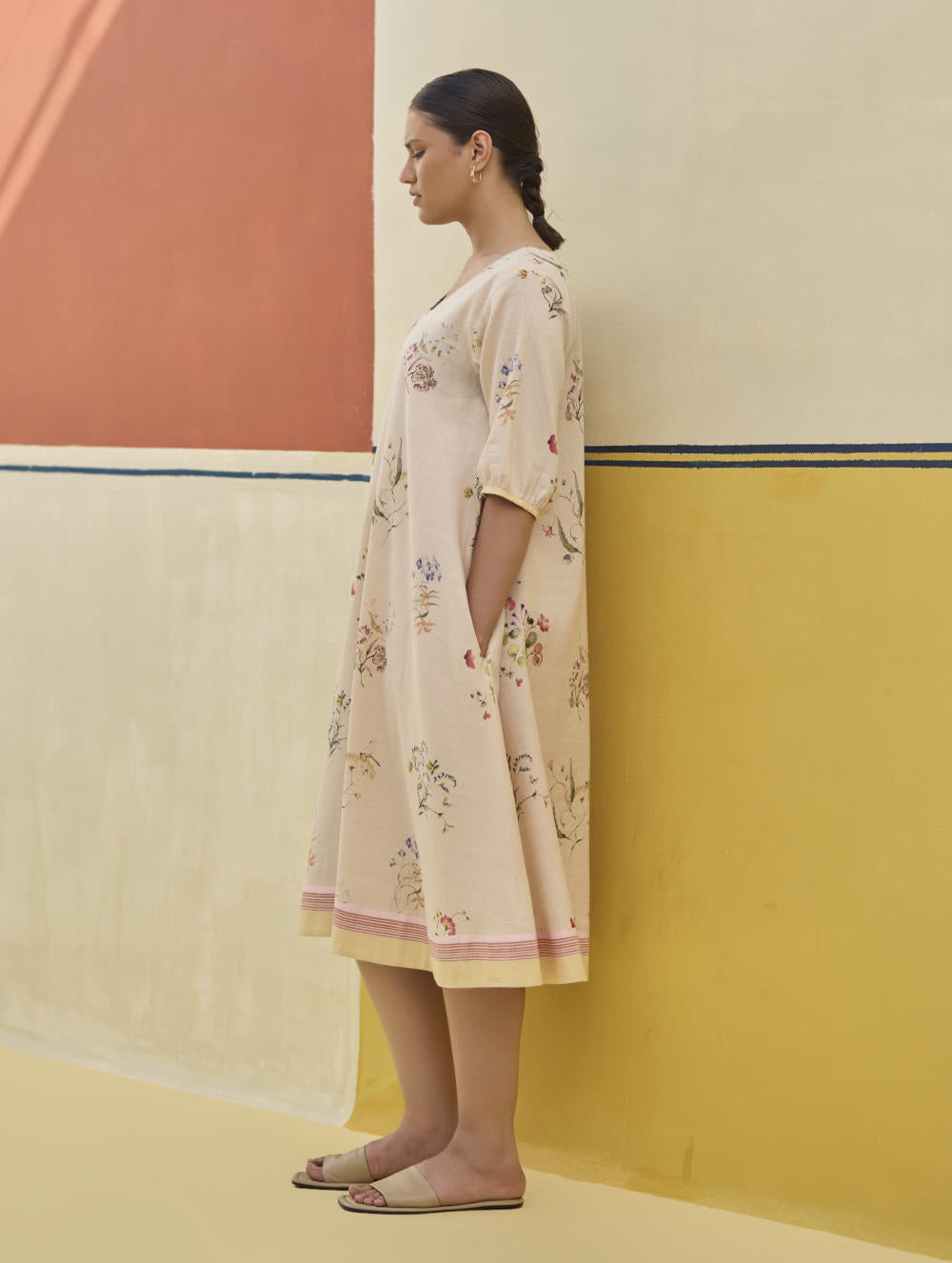 An A-line watercolour floral printed dress with pockets handcrafted in our handloom linen cotton with a self-woven stripe border and coloured selvedge. The dress is printed with hand-illustrated and hand-painted floral watercolor motifs and has a cut-out detail at the back with a hand-stitched jaali detail running down the centre of the back.