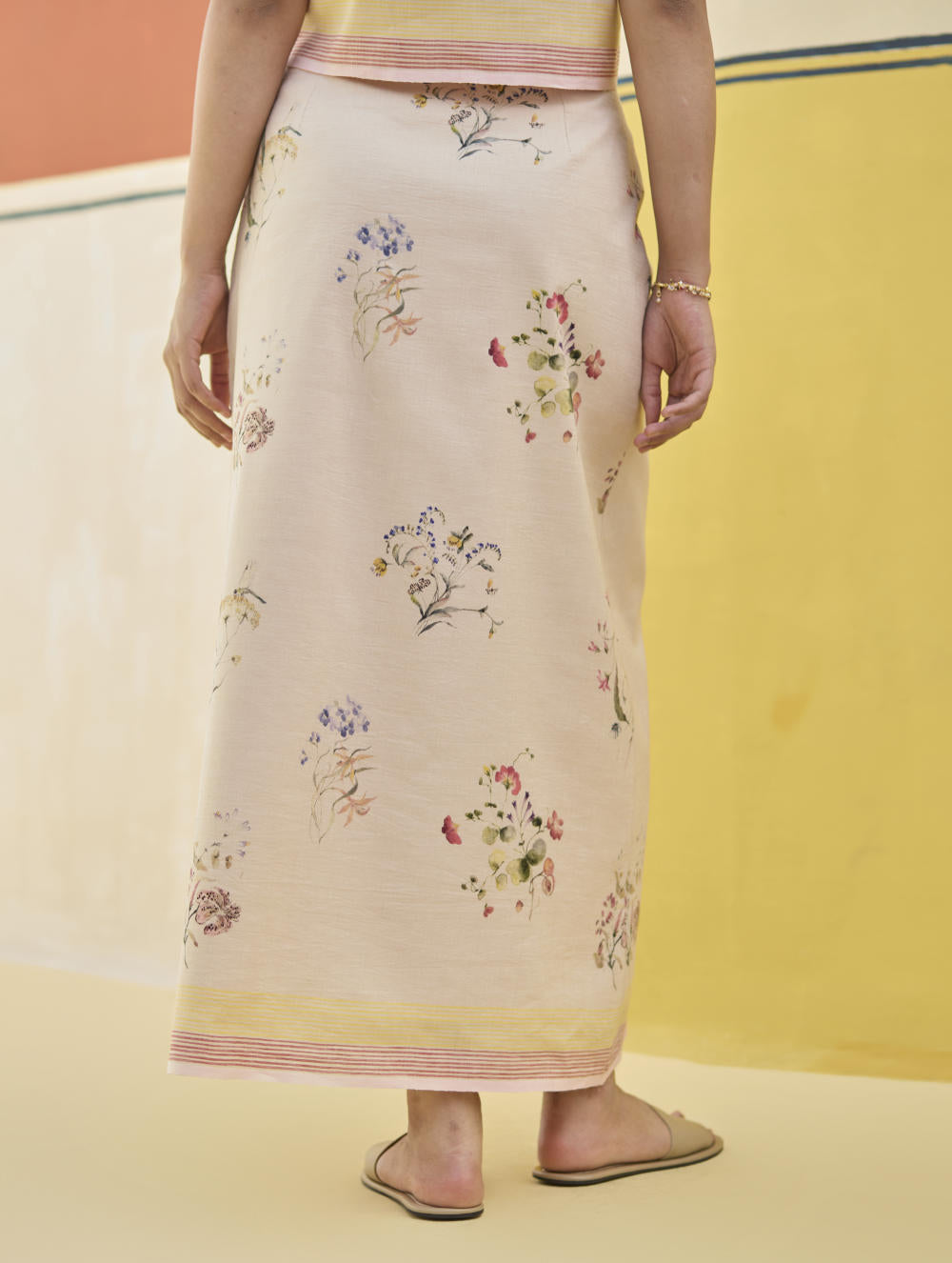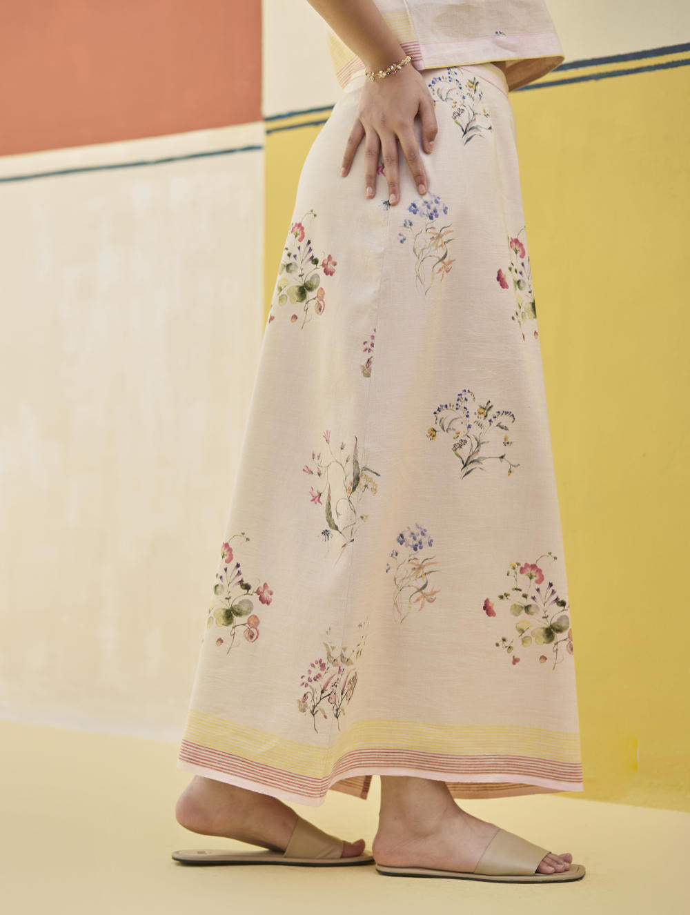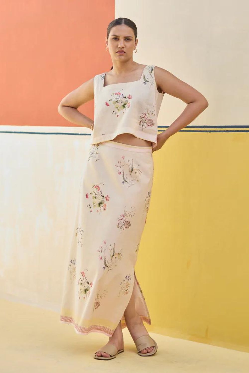 Skirt- An A-line skirt thoughtfully handcrafted from handloom linen cotton printed with hand-illustrated watercolour floral motifs. The Leena has a handwoven stripe border at the hemline and waistband and a side slit and zipper for ease-of-wear. Top-A sleeveless crop top in our bespoke soft handloom linen cotton with a handwoven stripe border. The top is printed with a hand-illustrated soft watercolour print. Pairs beautifully with our tapered pants or a classic skirt.