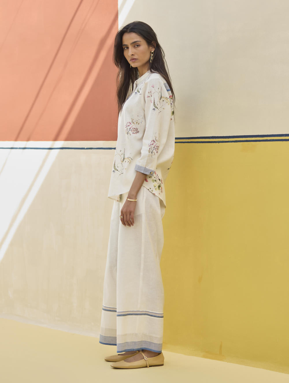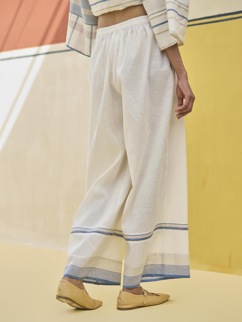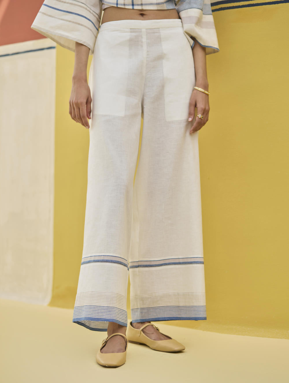 Classic palazzo pants handcrafted in our handloom linen cotton with a handwoven stripe border. Lyla has comfortable pockets, handmade jaali (mesh) detailing and an soft elasticated back waistband with a drawstring.