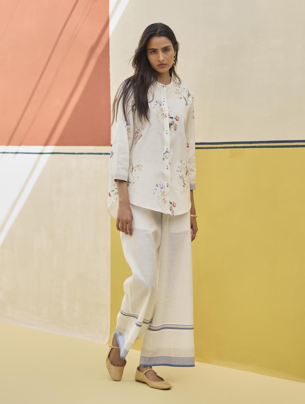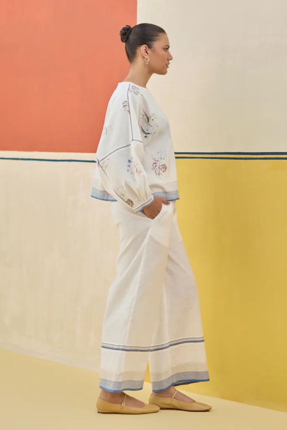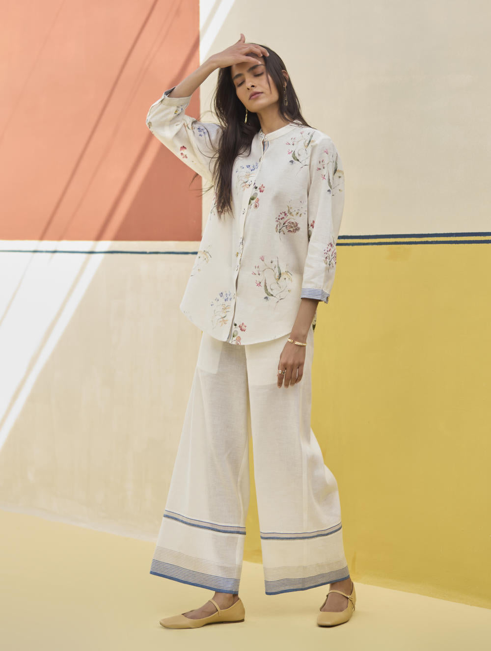Classic palazzo pants handcrafted in our handloom linen cotton with a handwoven stripe border. Lyla has comfortable pockets, handmade jaali (mesh) detailing and an soft elasticated back waistband with a drawstring.