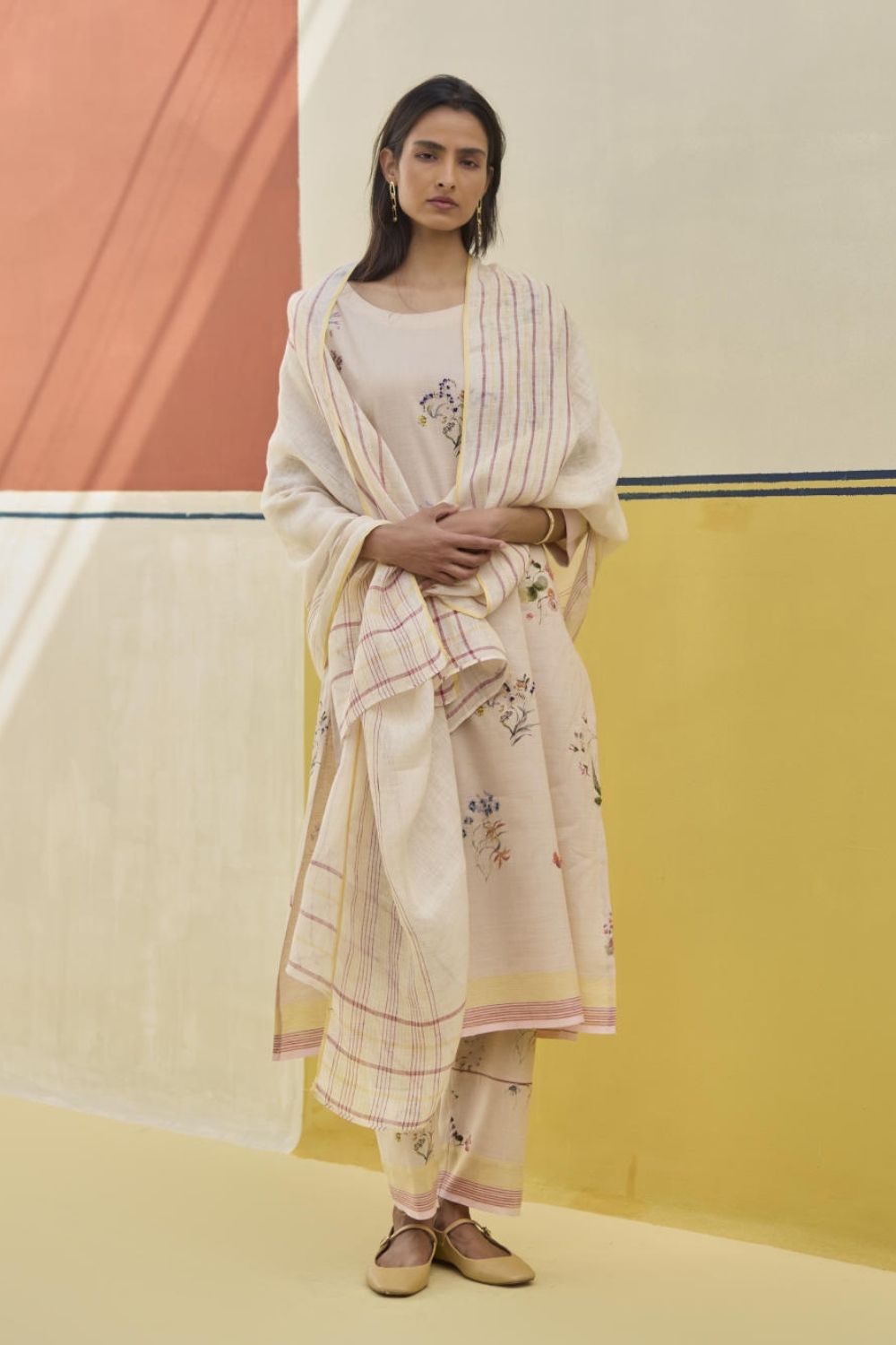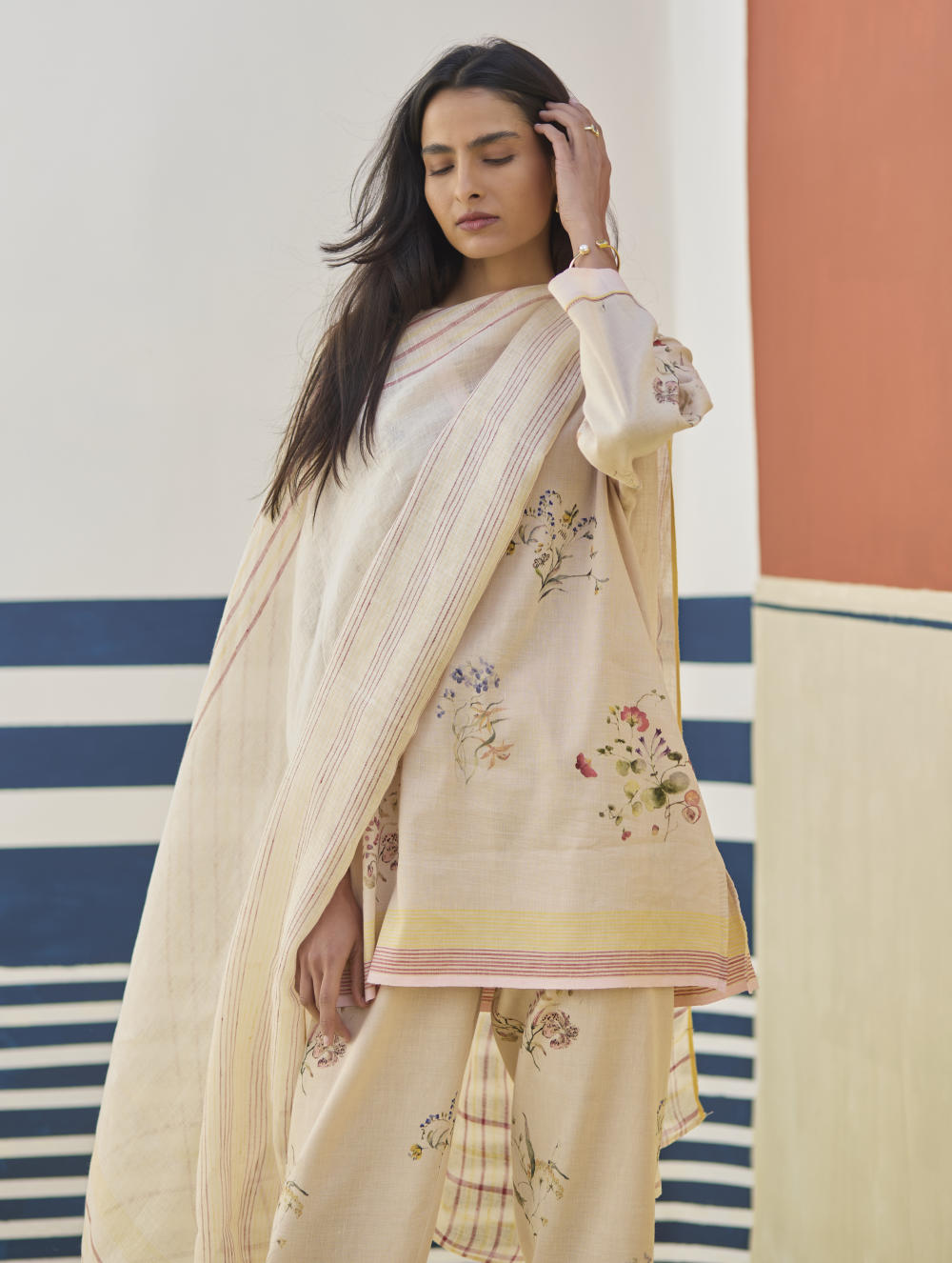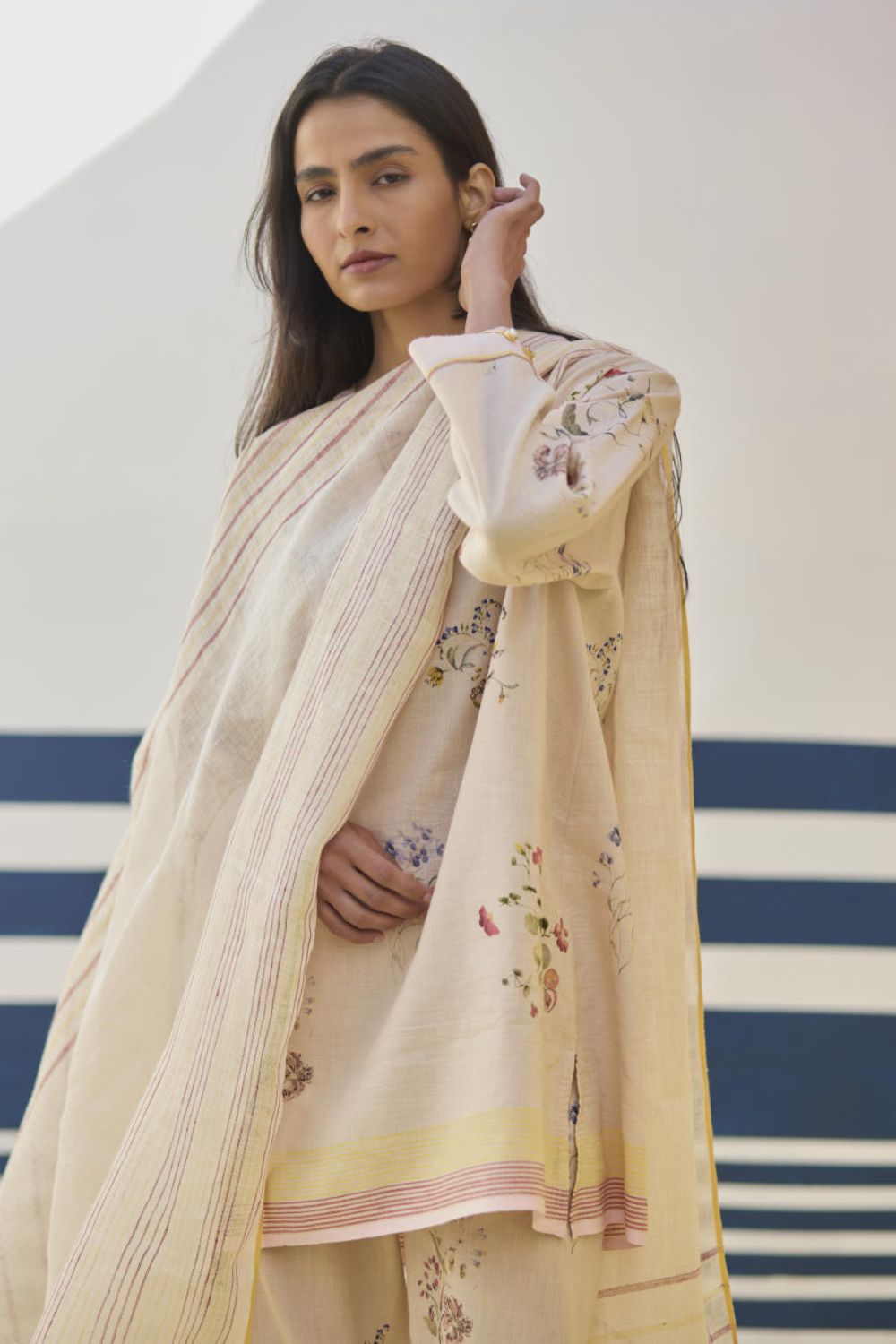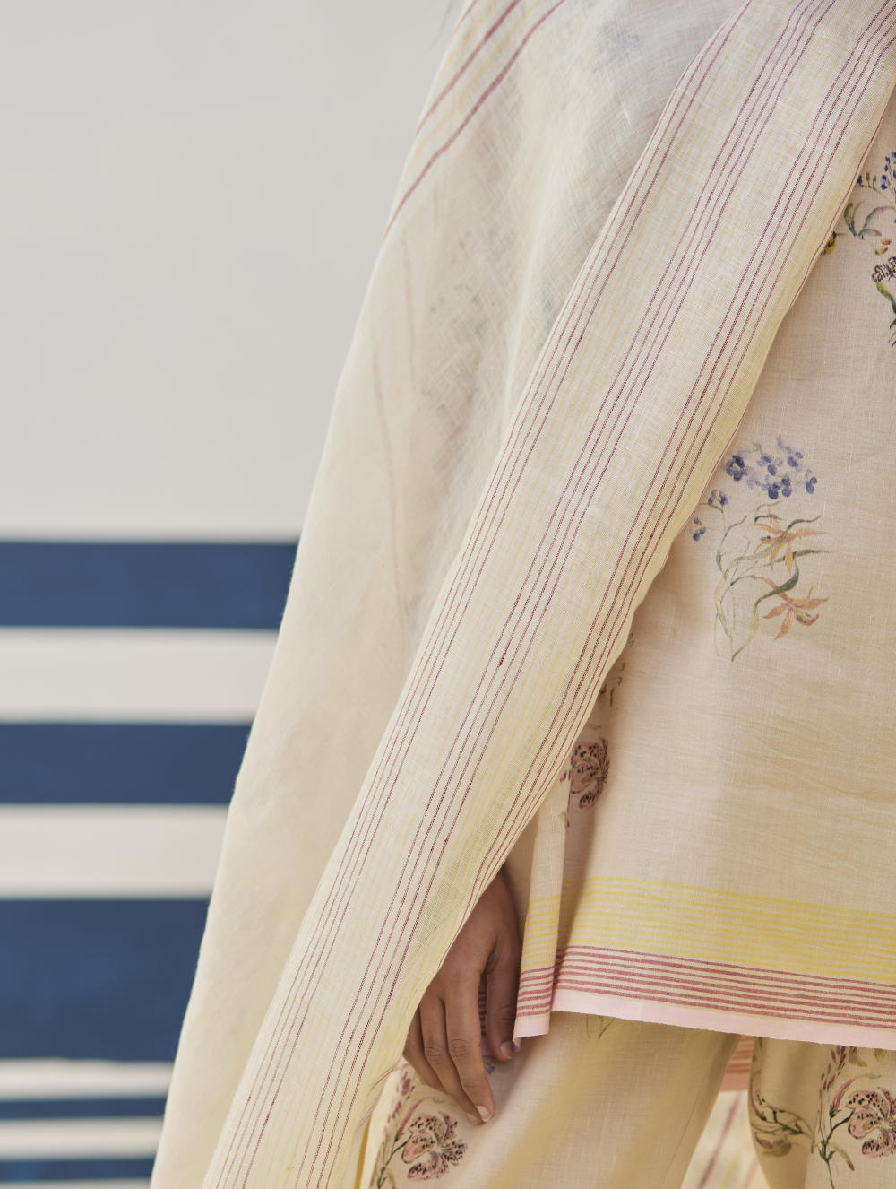 A soft hand-woven dupatta with a multi-coloured stripe border in contrast colours on beautiful flowing sheer linen.