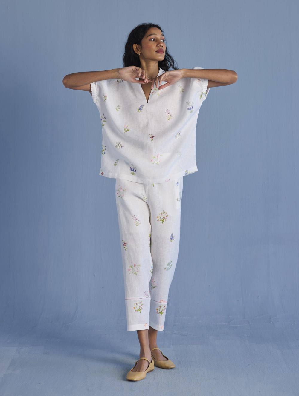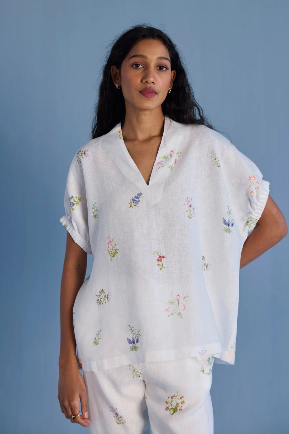 A chic v- neck elasticated sleeve top crafted from our soft yarn-dyed linen with a hand- illustrated and hand-painted multicoloured floral print enhanced with coloured fagotting stitch detailing the back. Perfect for balmy summer days and relaxed get-togethers.