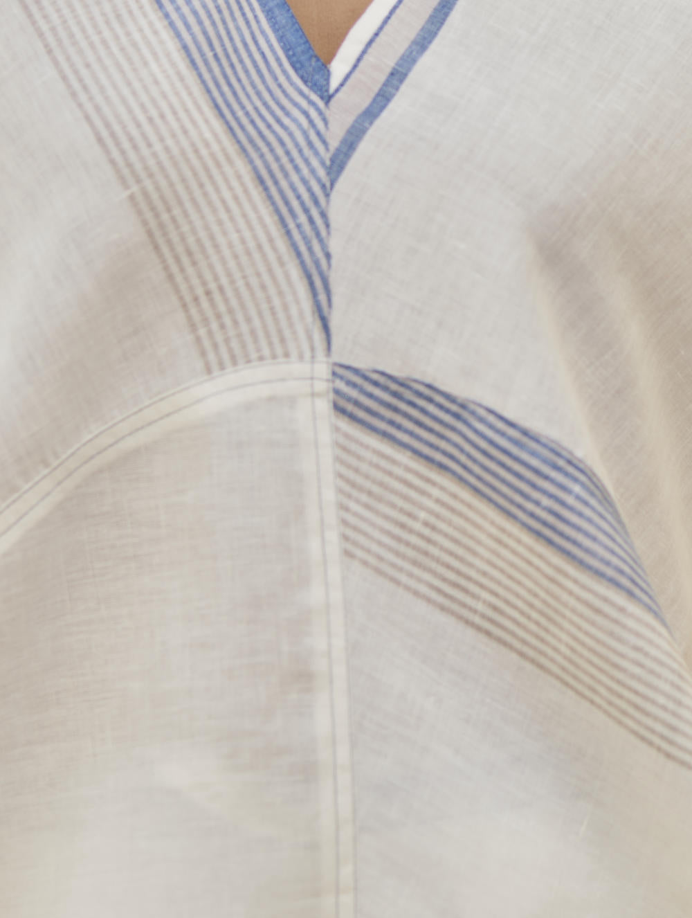 Top- A patchwork in our soft handloom linen cotton with a handwoven coloured border finished with double stitch lines in a pop coloured thread. The Moriko is one of our favourite tops to pair with your wardrobe favourites. Pant- Our forever tapered pants with pockets and elasticated back waistband with drawstring handcrafted in our soft handloom linen cotton woven with a striped border at the hem.