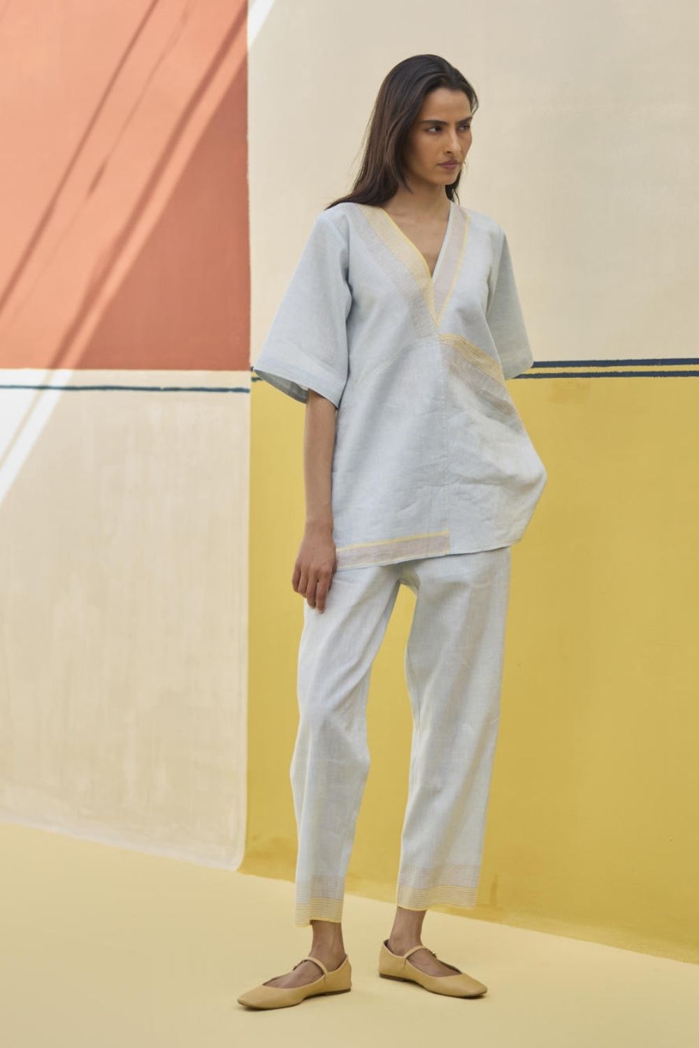 Top- A patchwork in our soft handloom linen cotton with a handwoven coloured border finished with double stitch lines in a pop coloured thread. The Moriko is one of our favourite tops to pair with your wardrobe favourites. Pant- Our forever tapered pants with pockets and elasticated back waistband with drawstring handcrafted in our soft handloom linen cotton woven with a striped border at the hem.