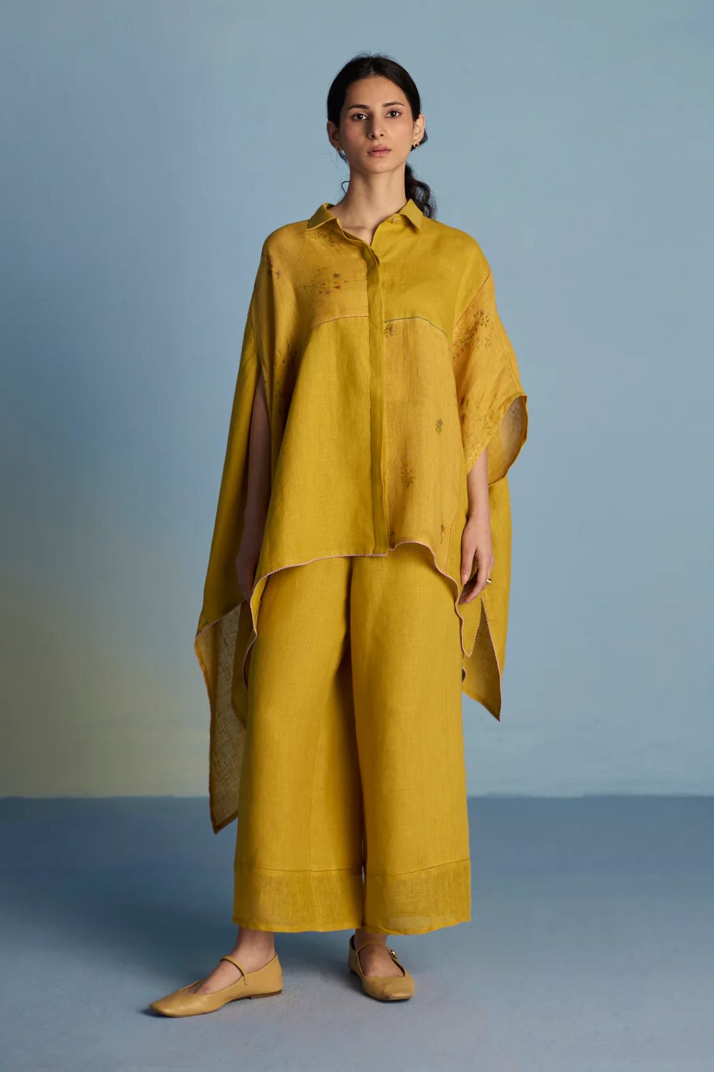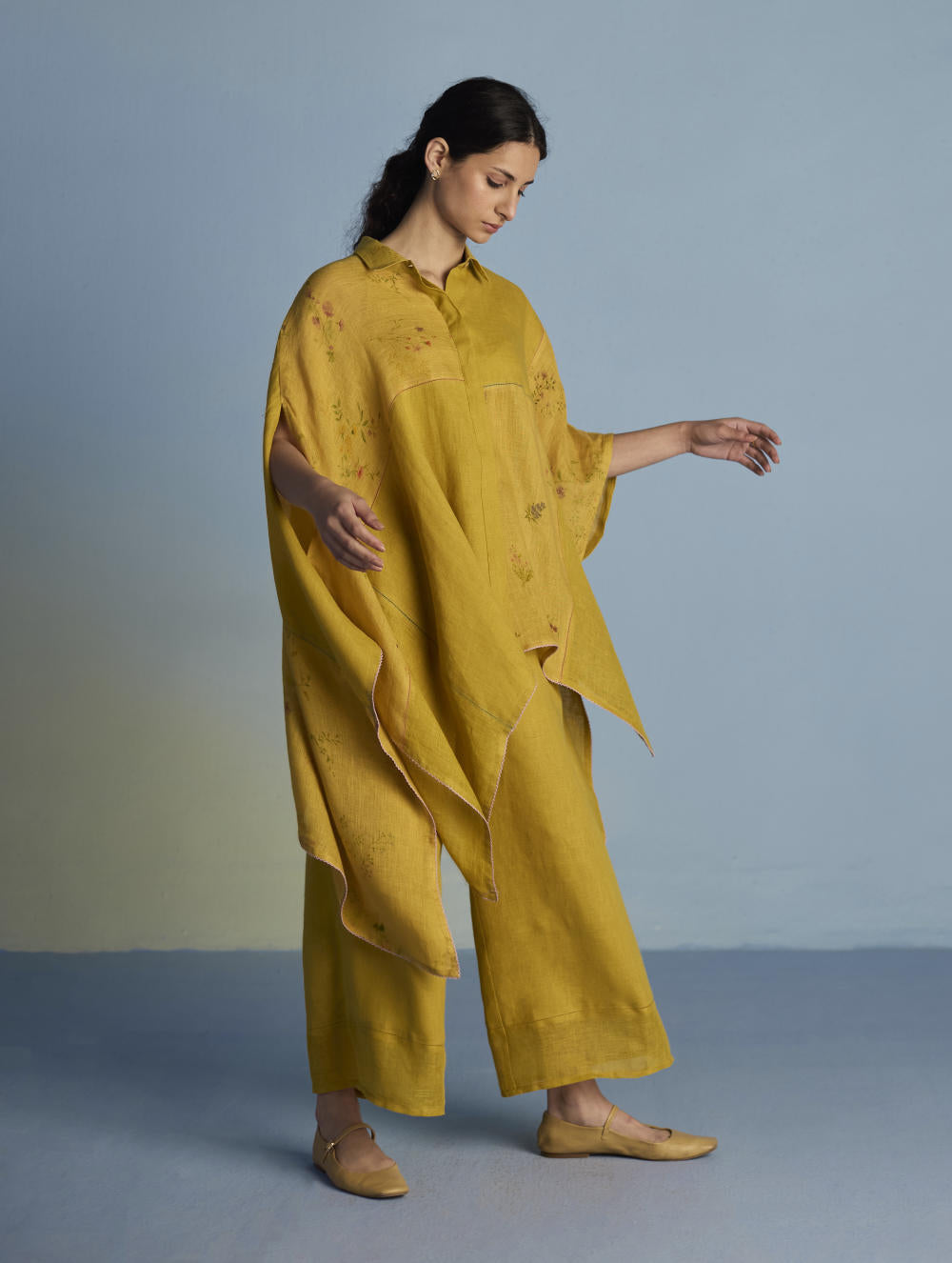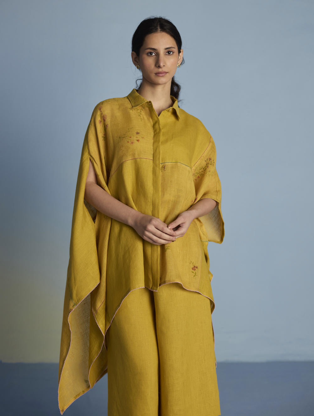 Top -A contemporary take on a kaftan shirt crafted by patching soft yarn-dyed linen and printed sheer linen; featuring hand-illustrated delicate floral prints on the sheer panels and joined with vibrant, multi-colored intricate fagotting thread details. The statement oversized shirt pairs beautifully and easily with our linen pants. It is finished with pop-coloured intricate picoting detail at the hem.