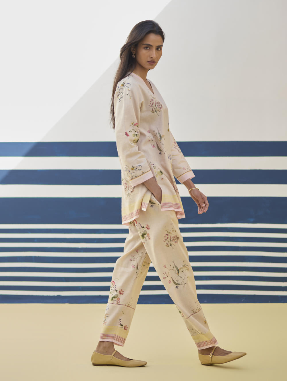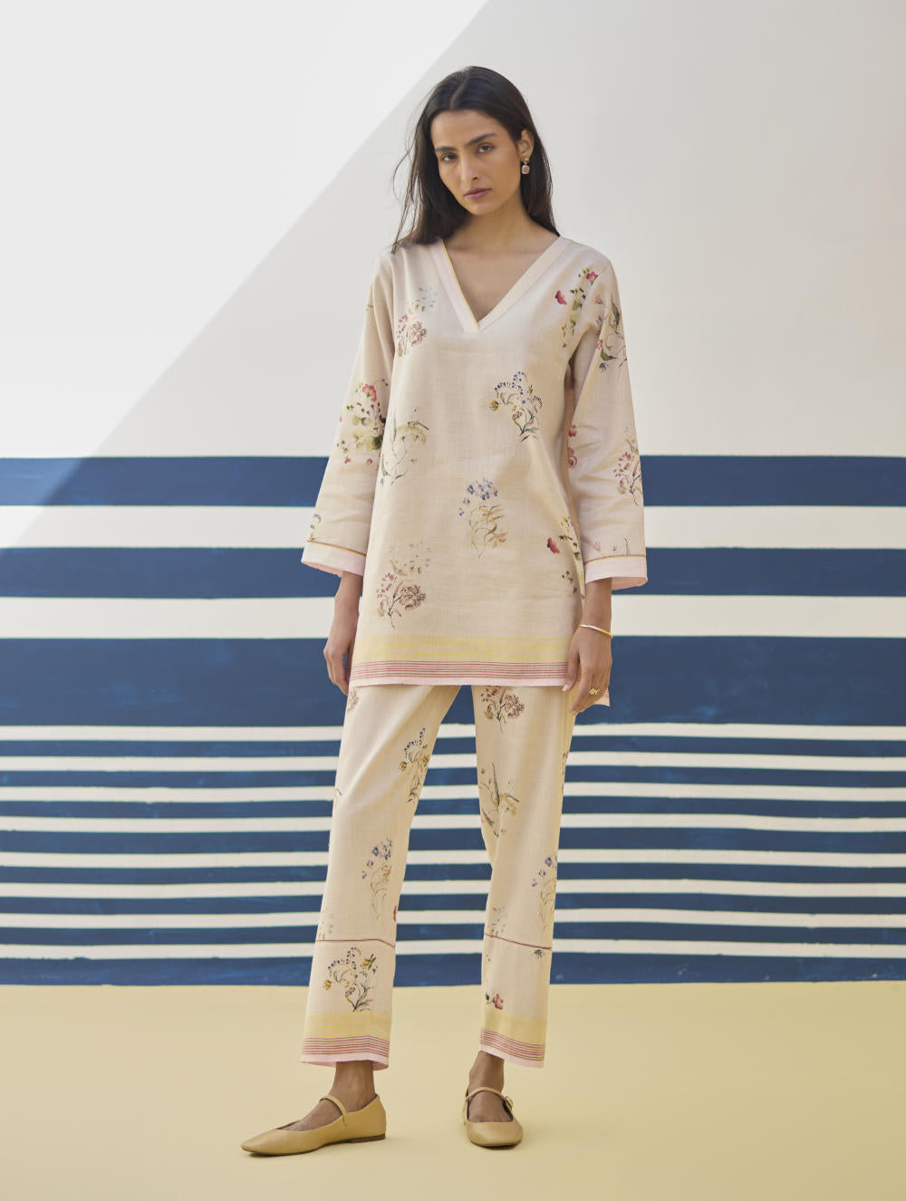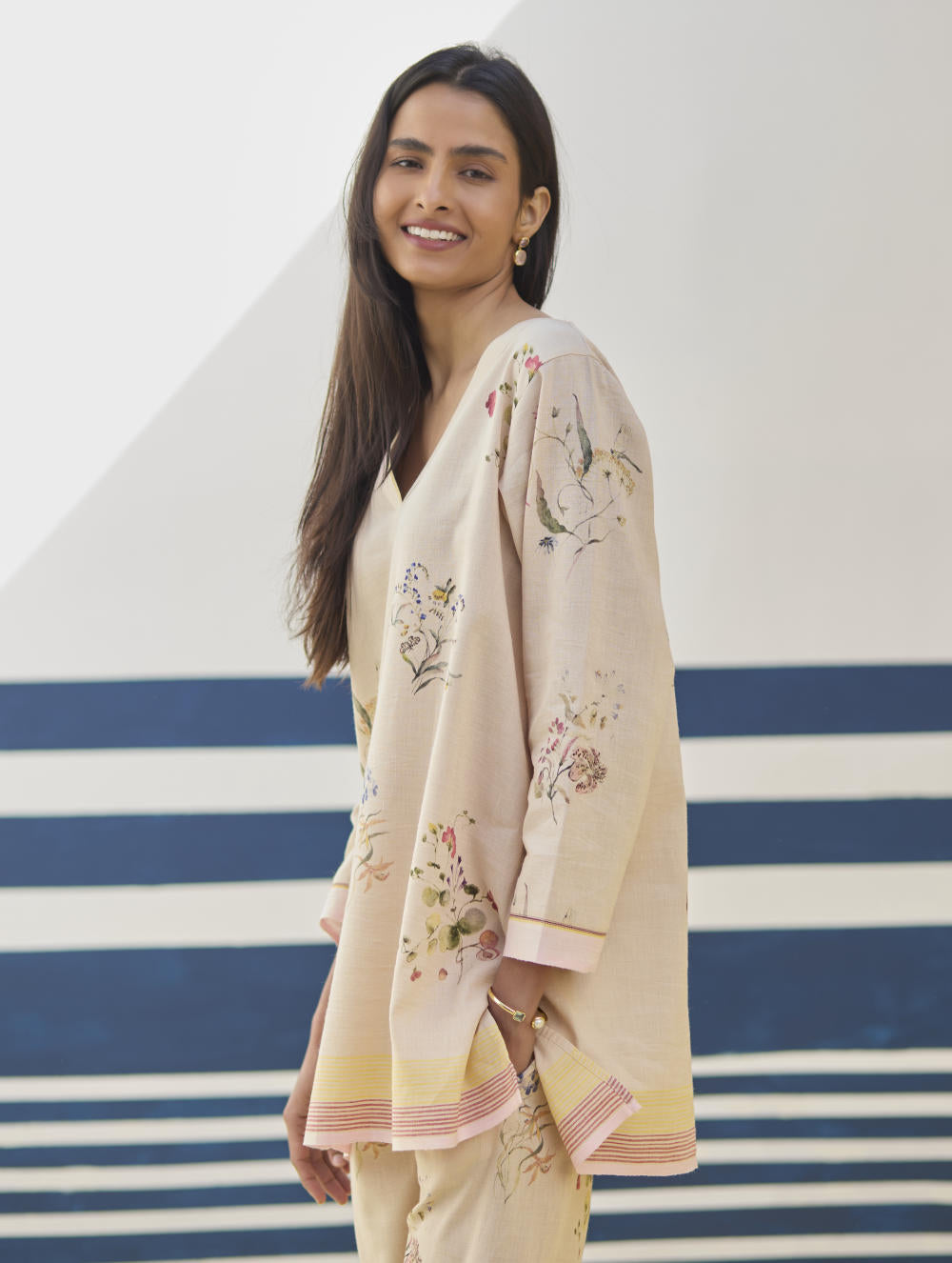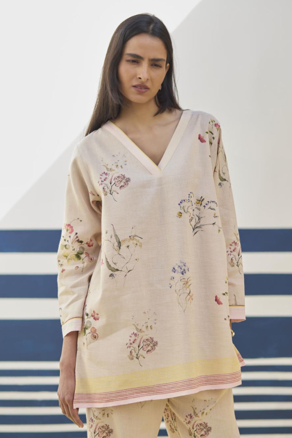 A v-neck short kurta in our handloom soft linen cotton with a handwoven border placed on the neckline, sleeve and hemline. The kurta is printed in a soft hand-illustrated watercolour floral print with five unique hand-sketched motifs.