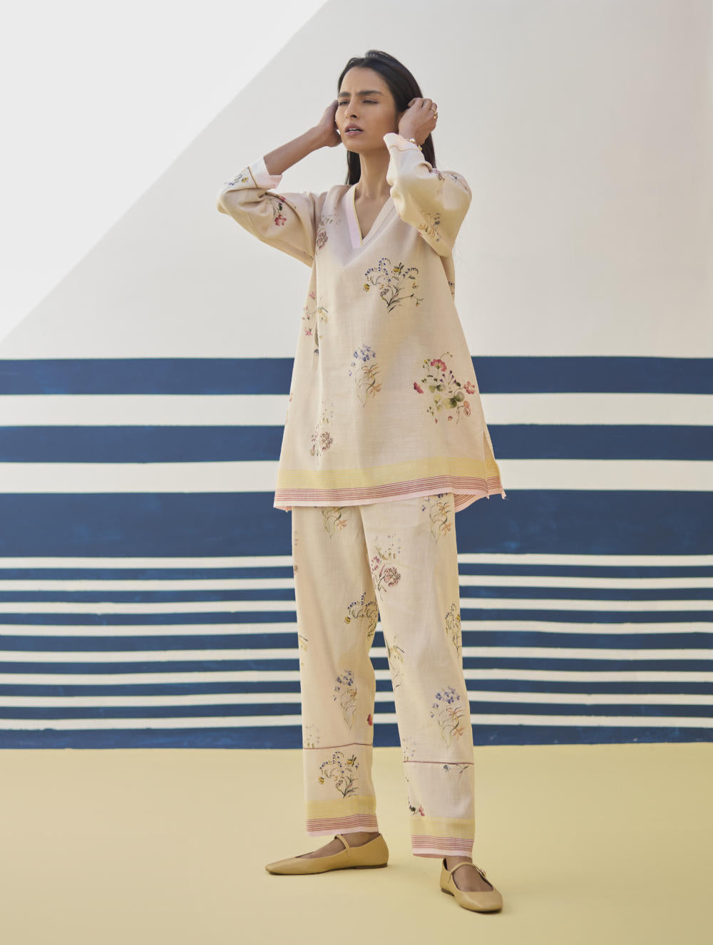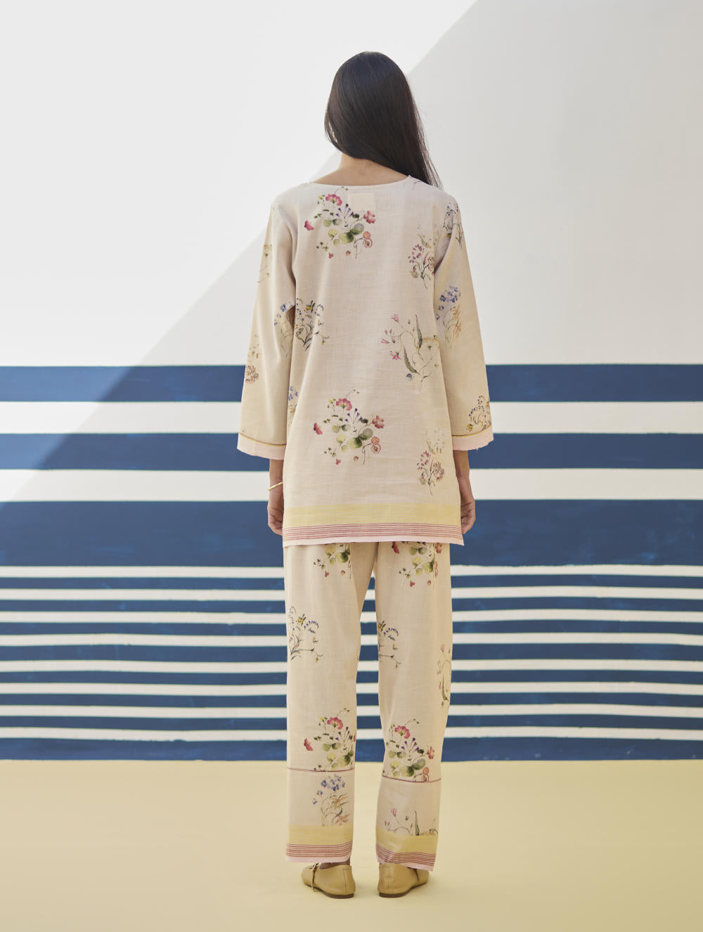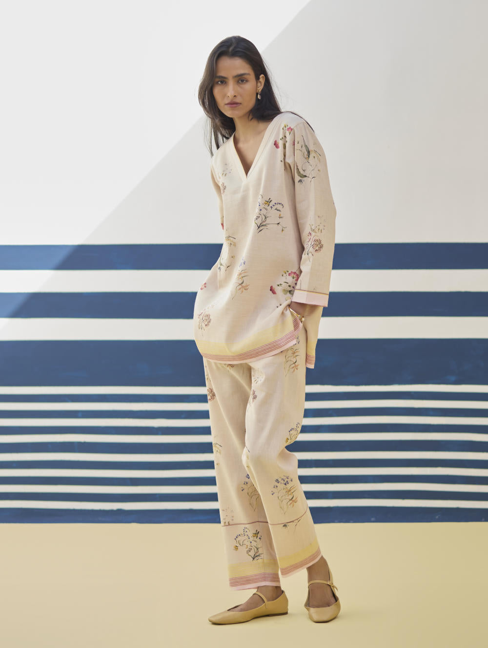 A v-neck short kurta in our handloom soft linen cotton with a handwoven border placed on the neckline, sleeve and hemline. The kurta is printed in a soft hand-illustrated watercolour floral print with five unique hand-sketched motifs.