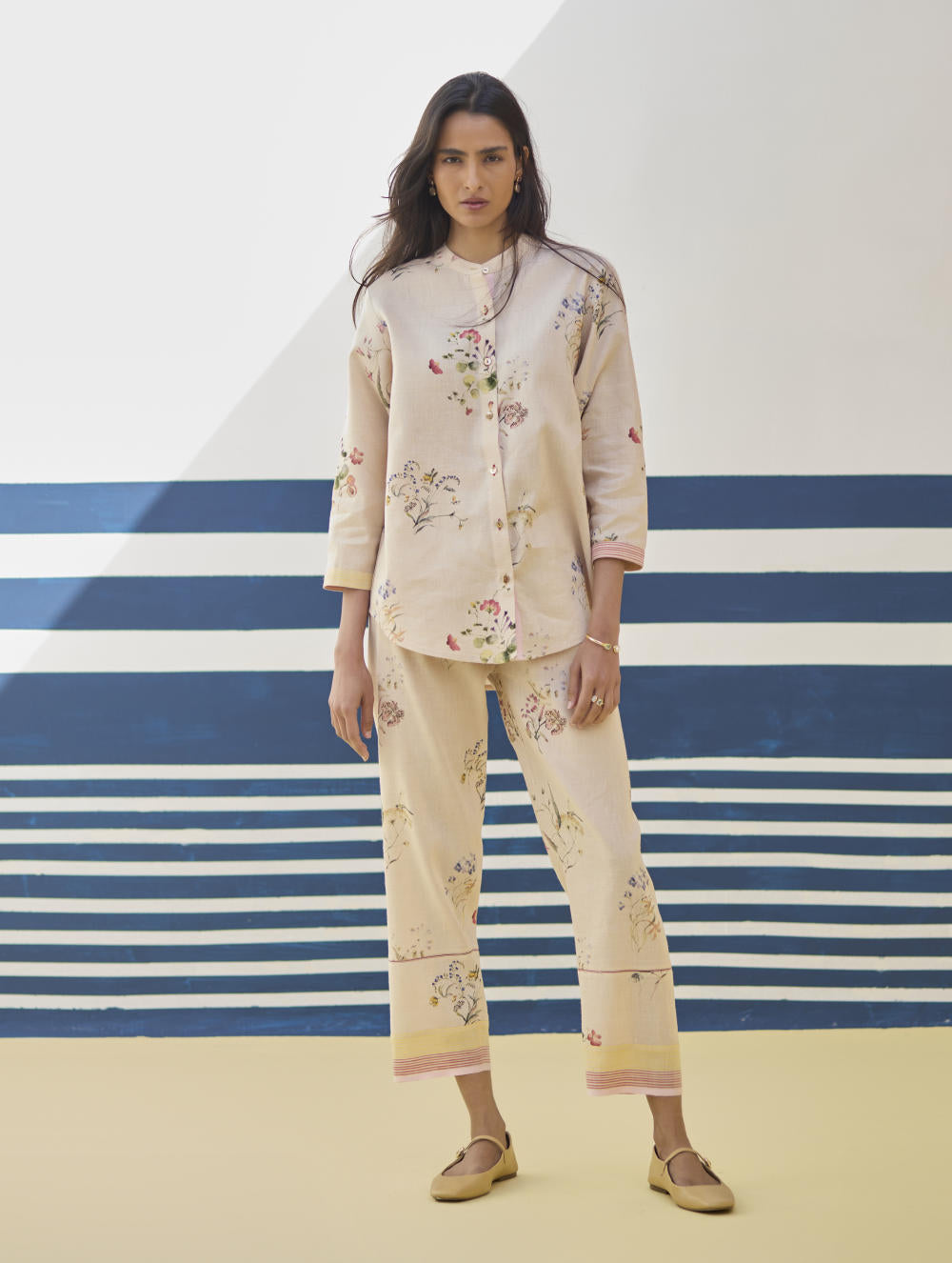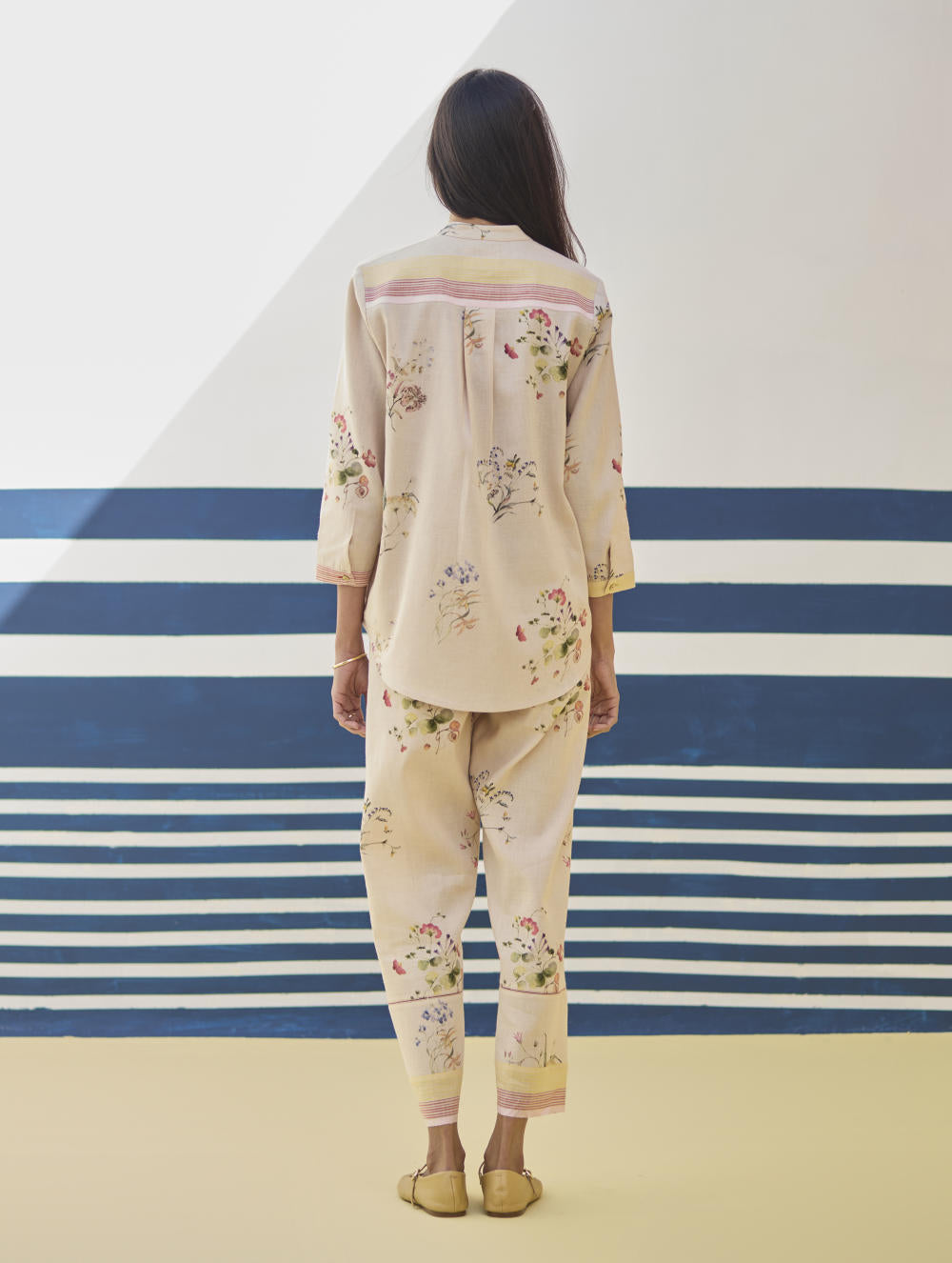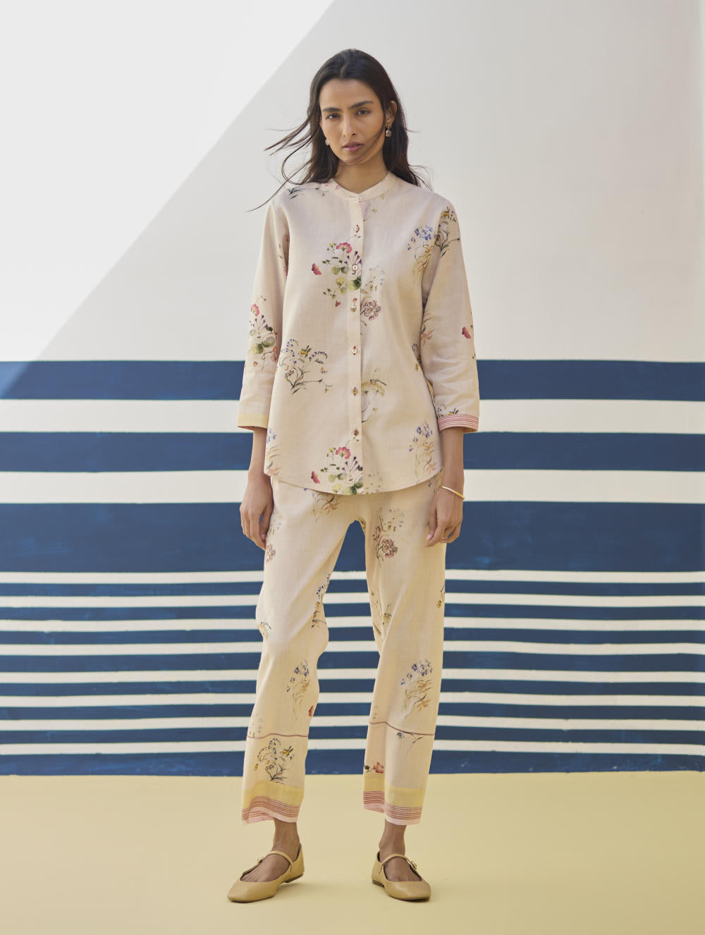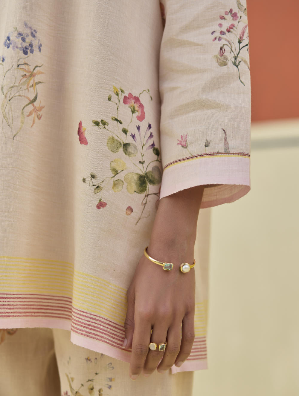A v-neck short kurta in our handloom soft linen cotton with a handwoven border placed on the neckline, sleeve and hemline. The kurta is printed in a soft hand-illustrated watercolour floral print with five unique hand-sketched motifs.