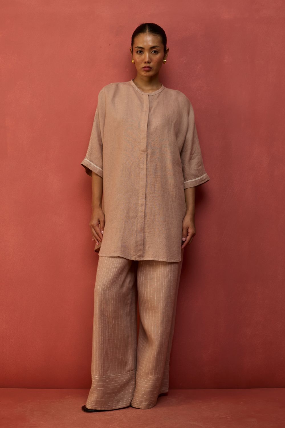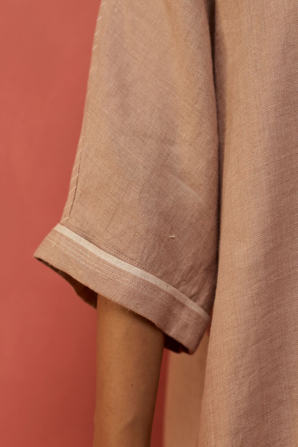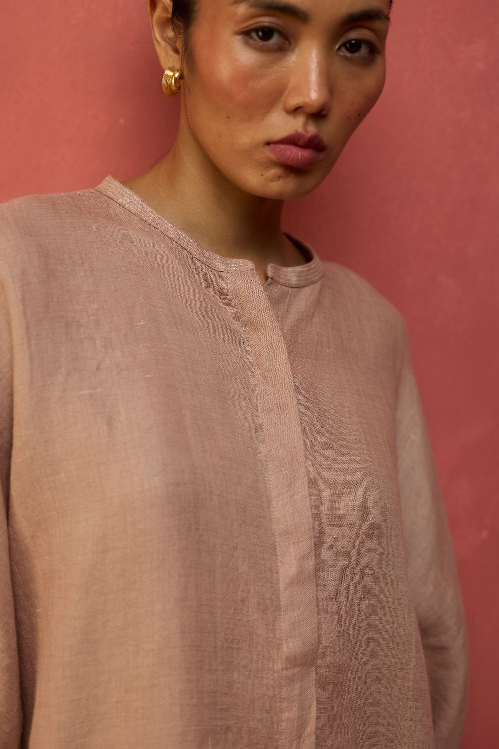 A beautifully relaxed top designed in our soft signature yarn-dyed linen with for a gentle, lived-in look. The piece features a round neckline, concealed placket with mother-of-pearl buttons, dolman sleeves, rounded hemline and folded cuffs finished with delicate woven selvedge edging and top-stitch detailing. The back has a stripe linen patchwork panel extending along the sleeves. Sumire is one of our go-to all season favourites and pairs beautifully with striped linen trousers.