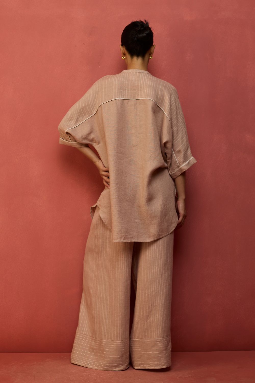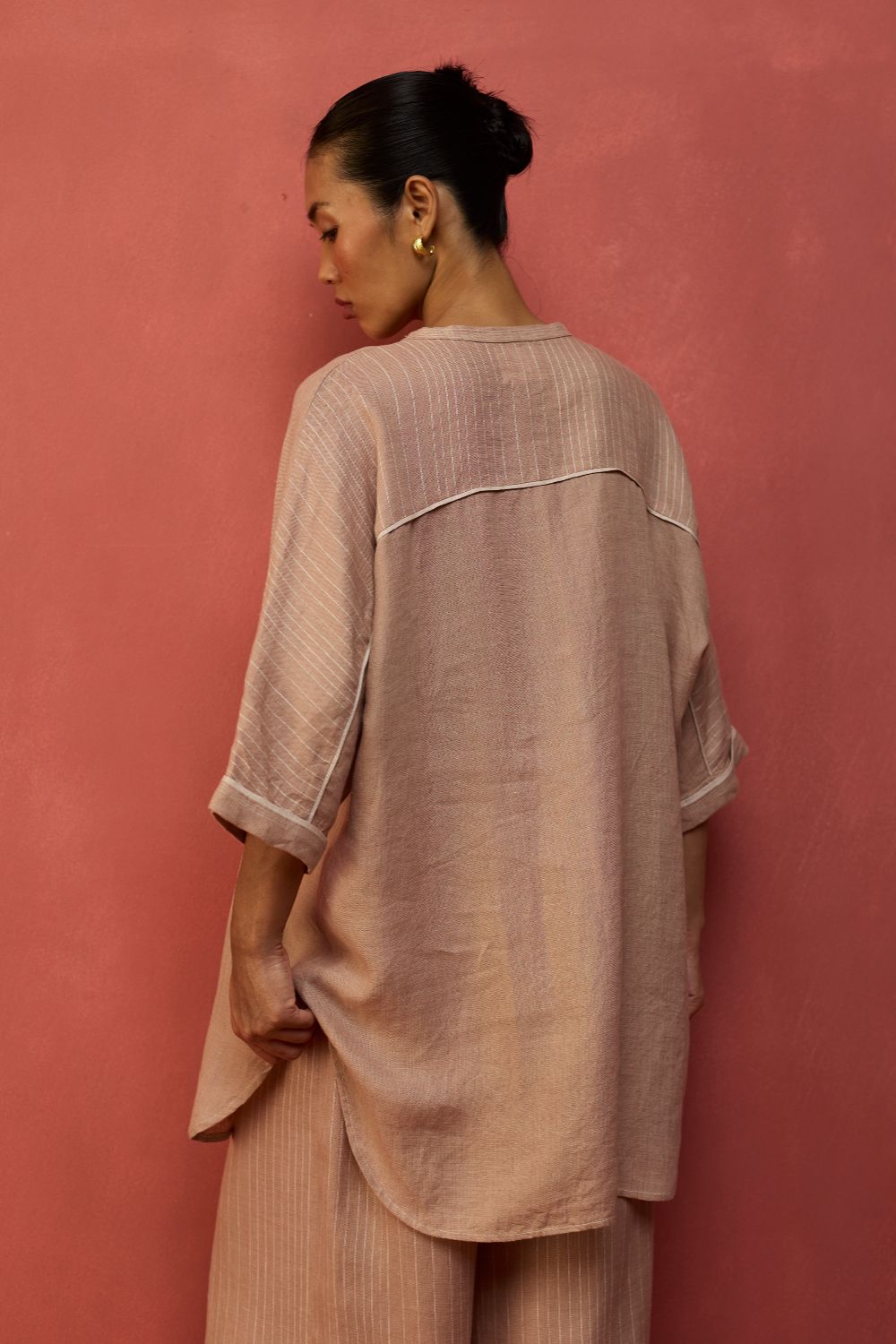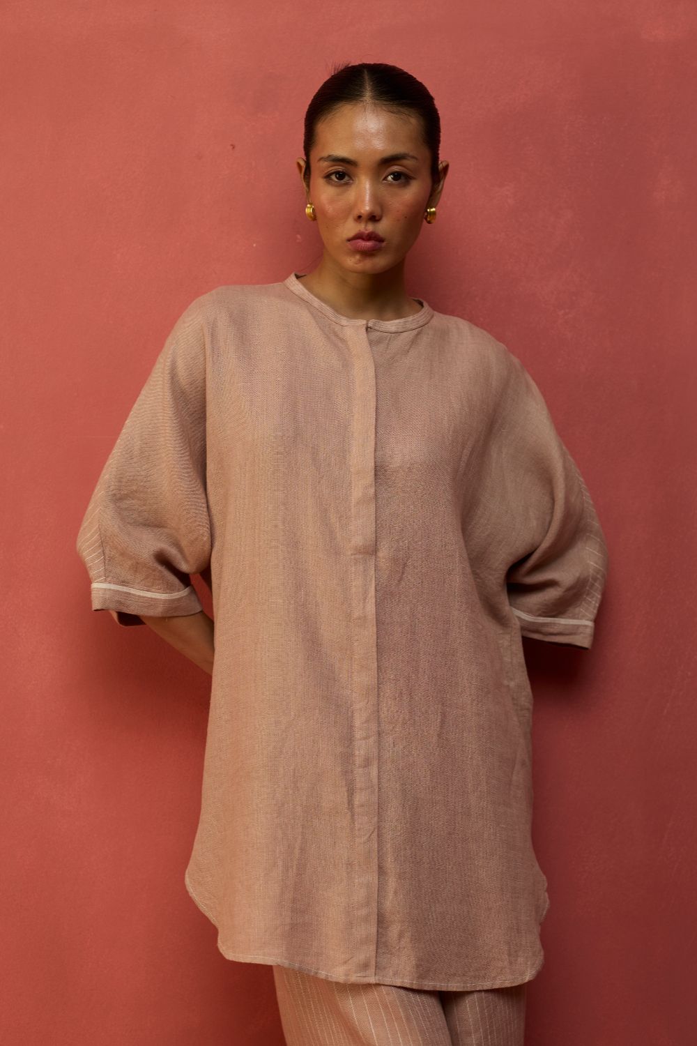 A beautifully relaxed top designed in our soft signature yarn-dyed linen with for a gentle, lived-in look. The piece features a round neckline, concealed placket with mother-of-pearl buttons, dolman sleeves, rounded hemline and folded cuffs finished with delicate woven selvedge edging and top-stitch detailing. The back has a stripe linen patchwork panel extending along the sleeves. Sumire is one of our go-to all season favourites and pairs beautifully with striped linen trousers.