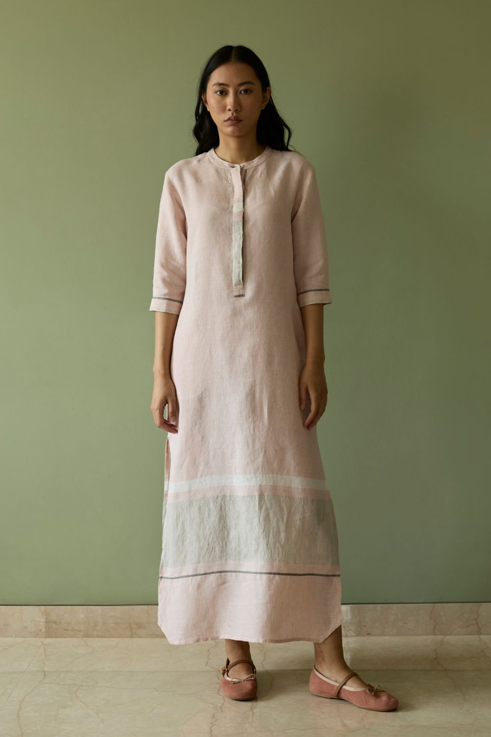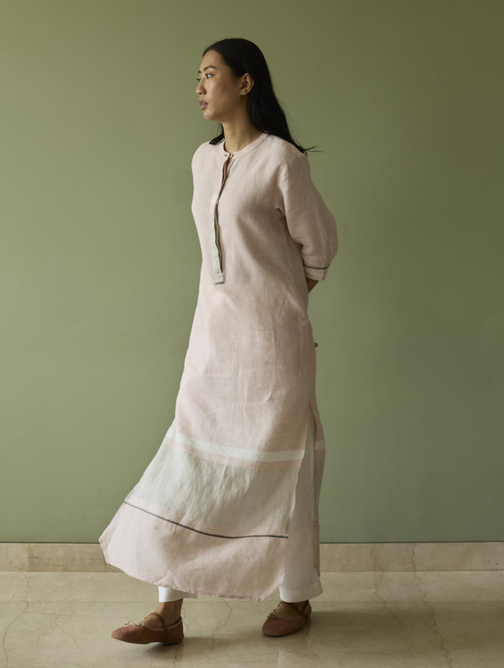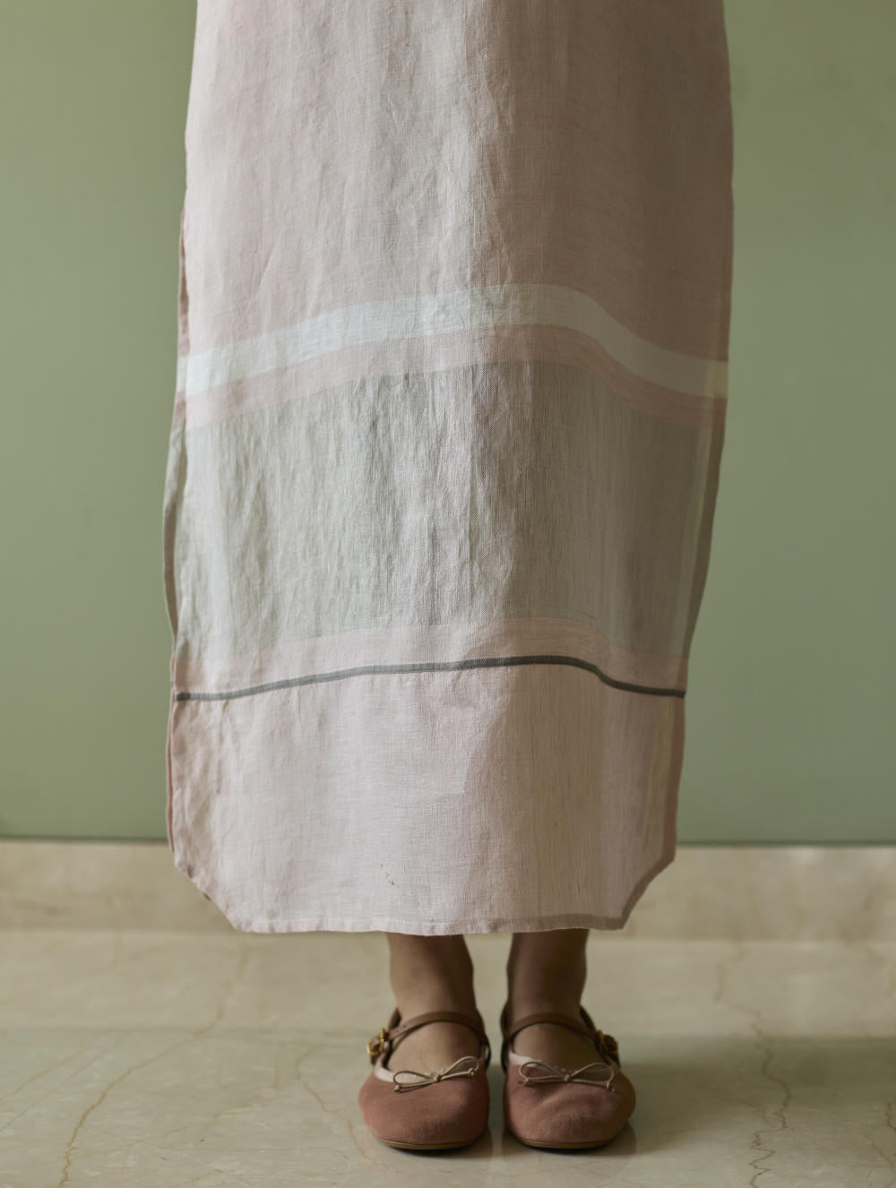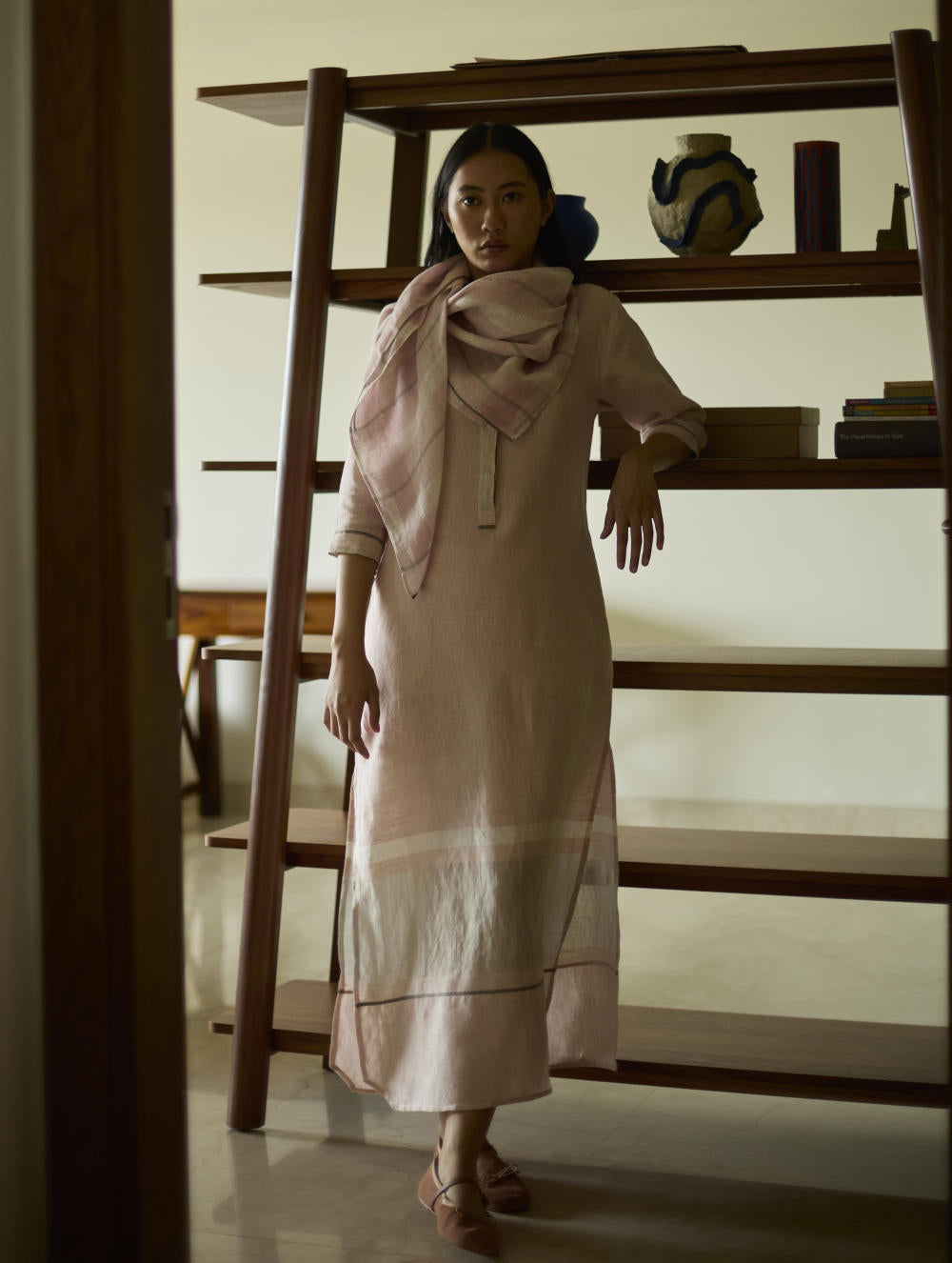 A full-length tunic dress with slits, mother of pearl buttons in a concealed placket, pockets, elbow-length sleeves with cuff in our signature soft handloom metallic linen with a yarn-dyed ivory band and a grey coloured woven selvedge. The placement of the grey selvedge adds balance and uniqueness to the silhouette. Classic and timeless, Terra is wearable for many occasions, both formal and informal