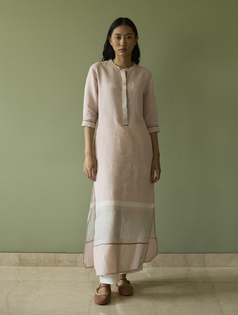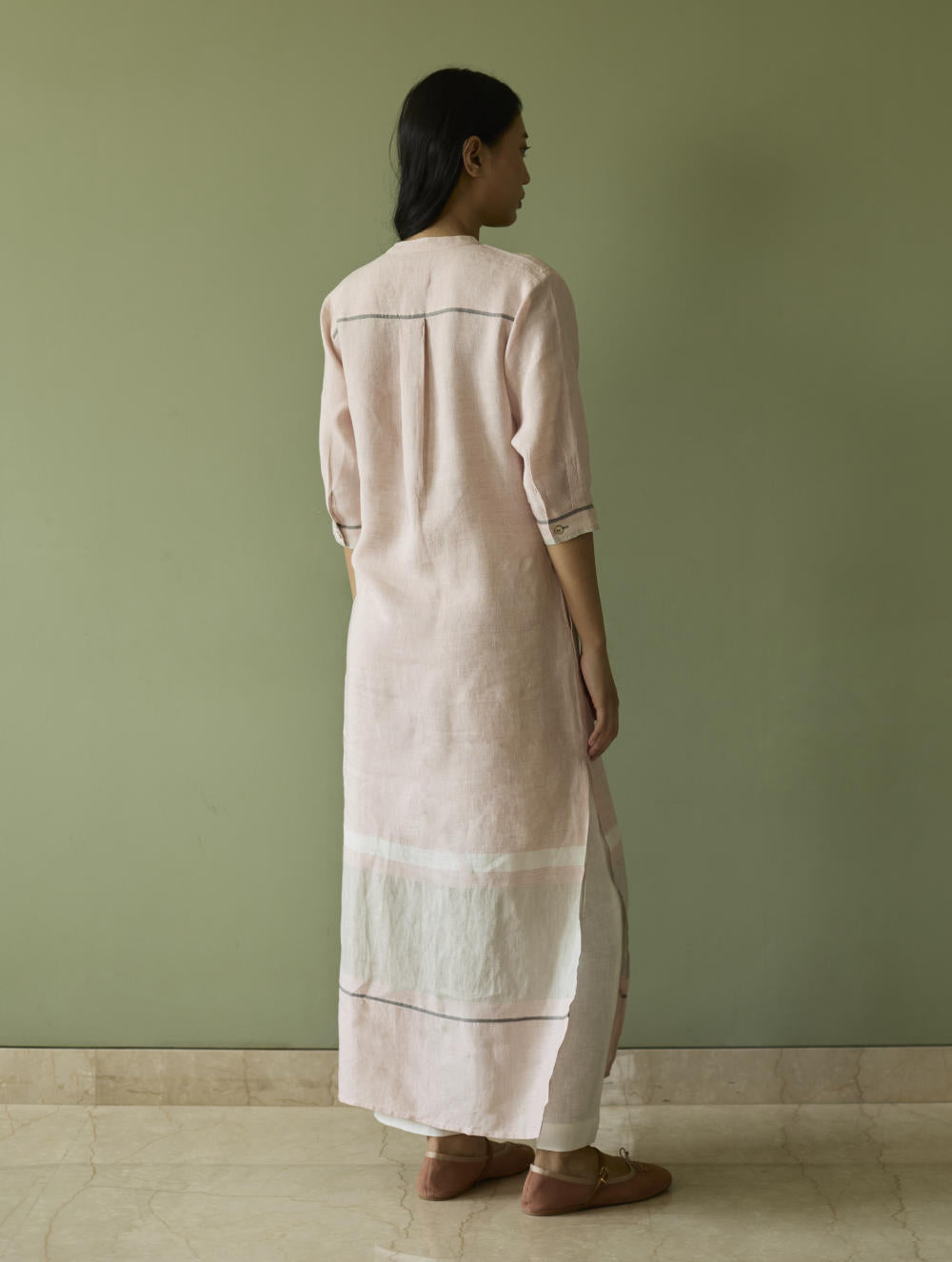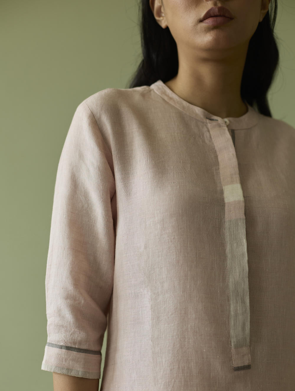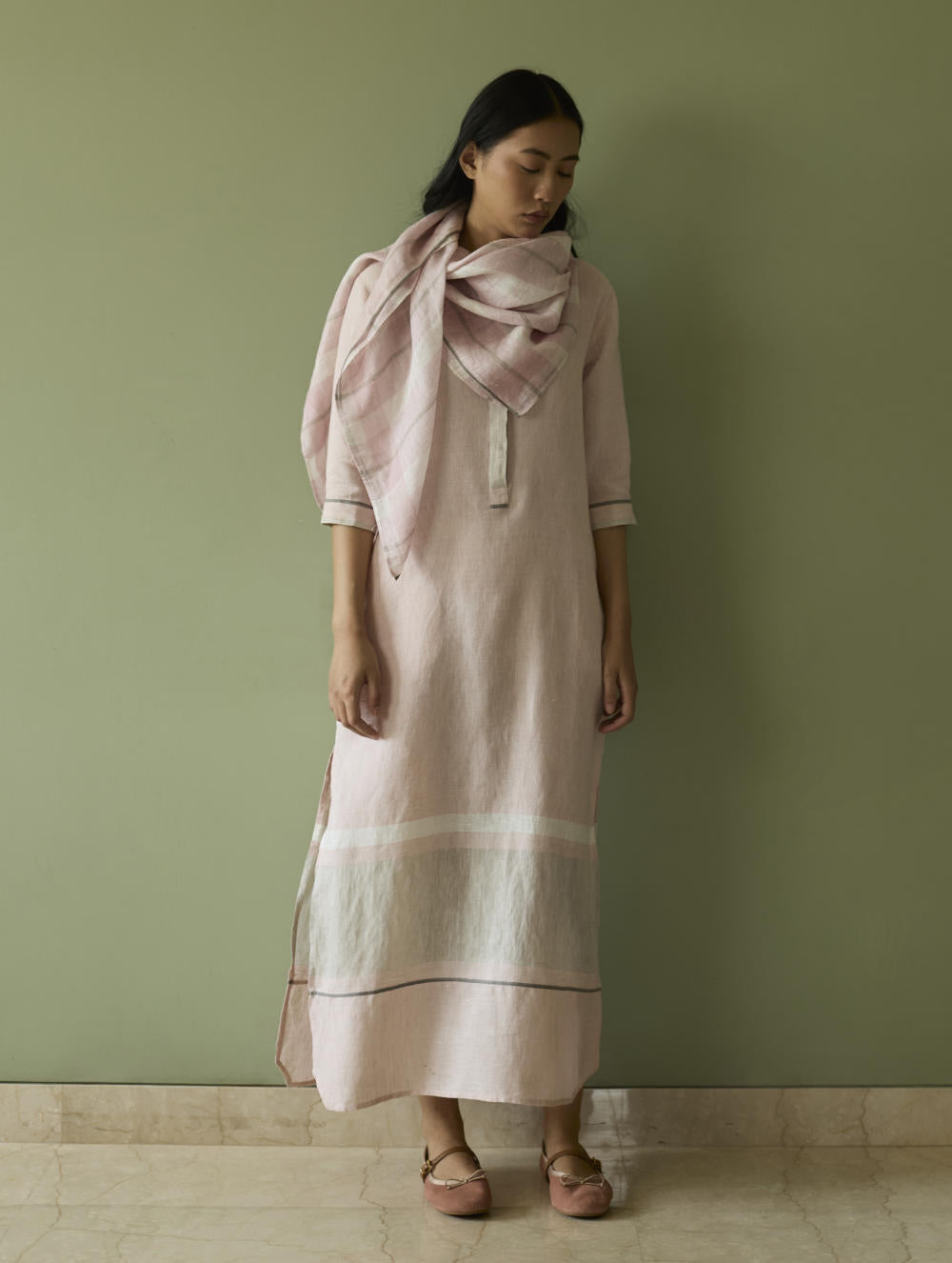 A full-length tunic dress with slits, mother of pearl buttons in a concealed placket, pockets, elbow-length sleeves with cuff in our signature soft handloom metallic linen with a yarn-dyed ivory band and a grey coloured woven selvedge. The placement of the grey selvedge adds balance and uniqueness to the silhouette. Classic and timeless, Terra is wearable for many occasions, both formal and informal