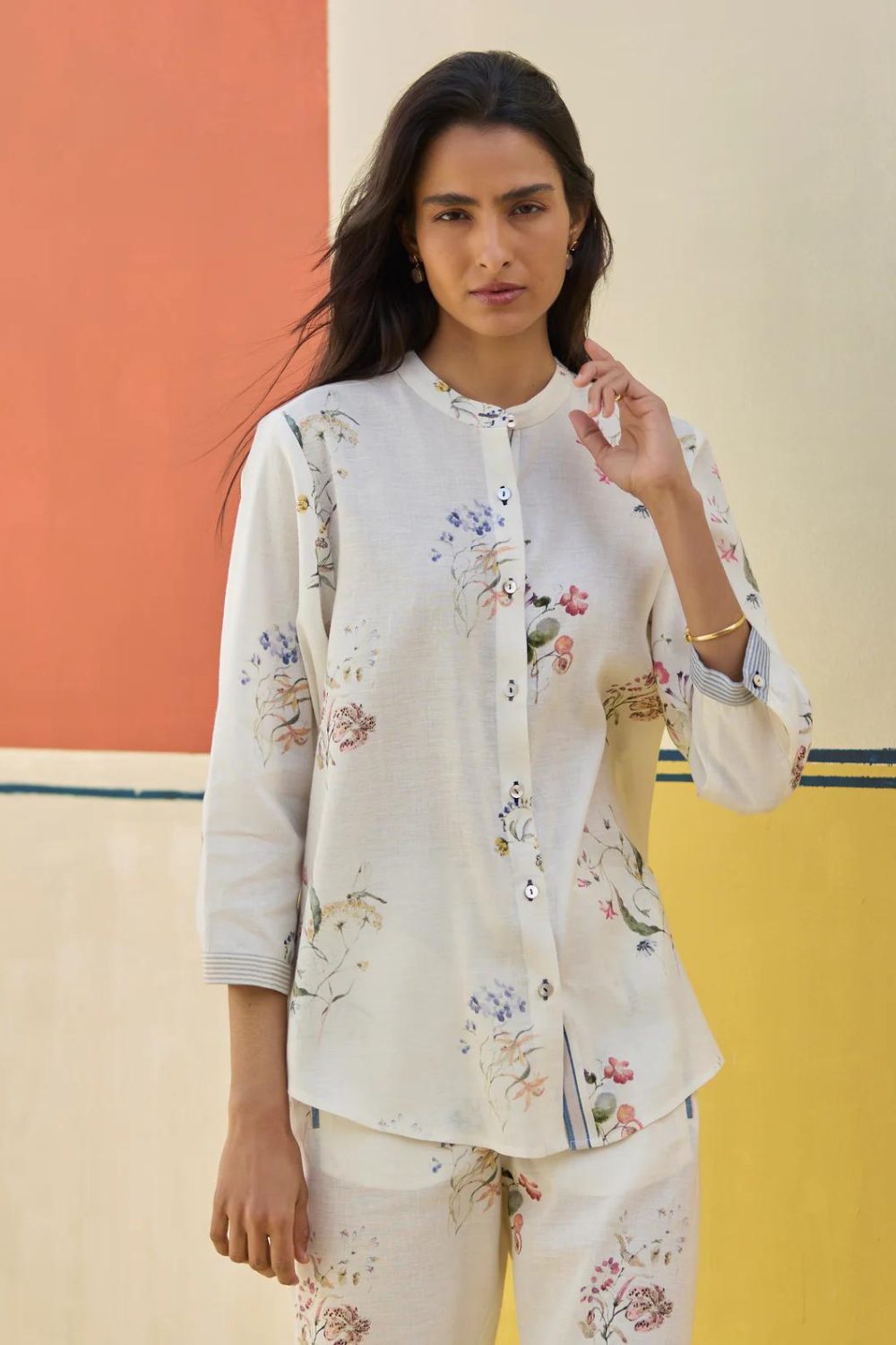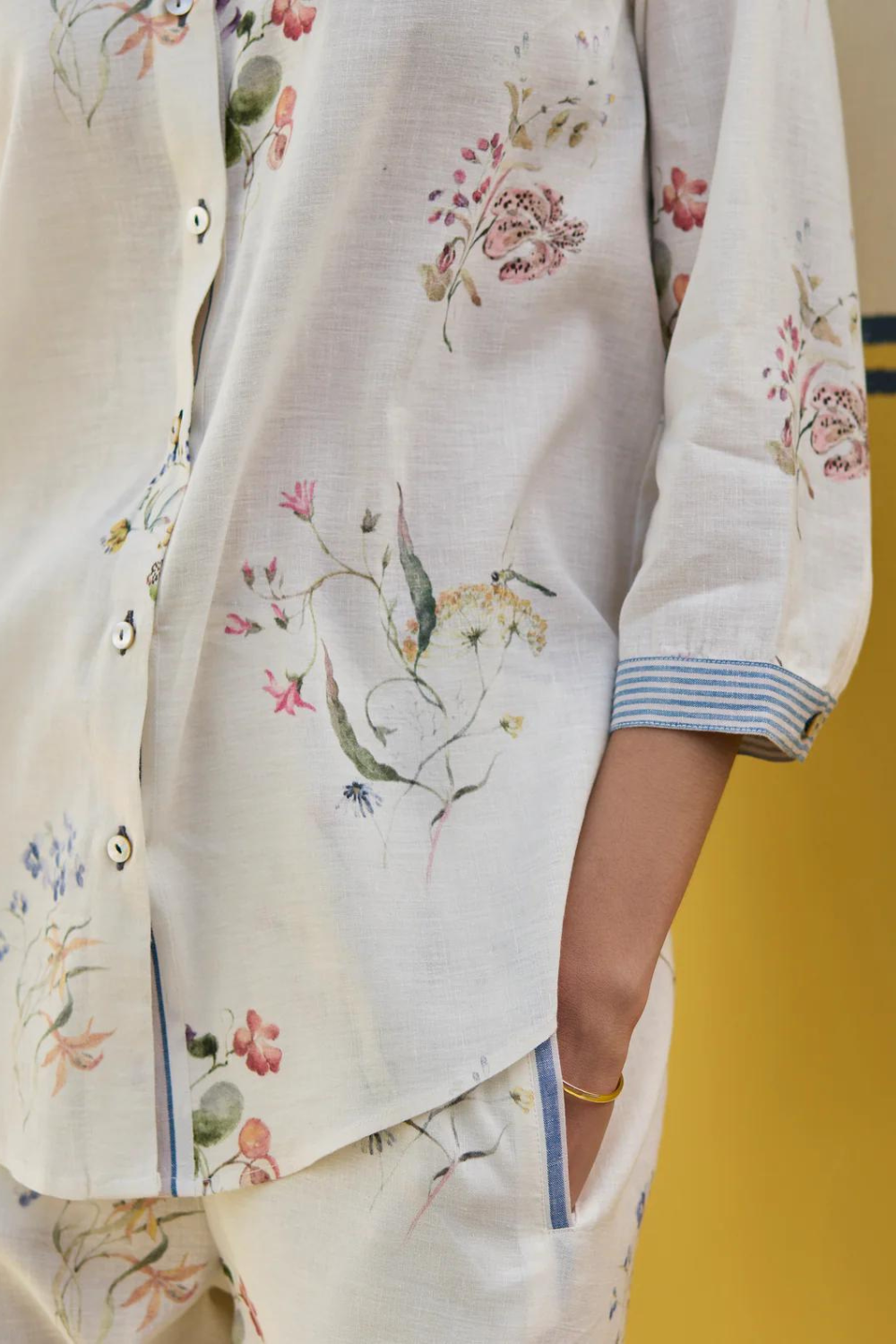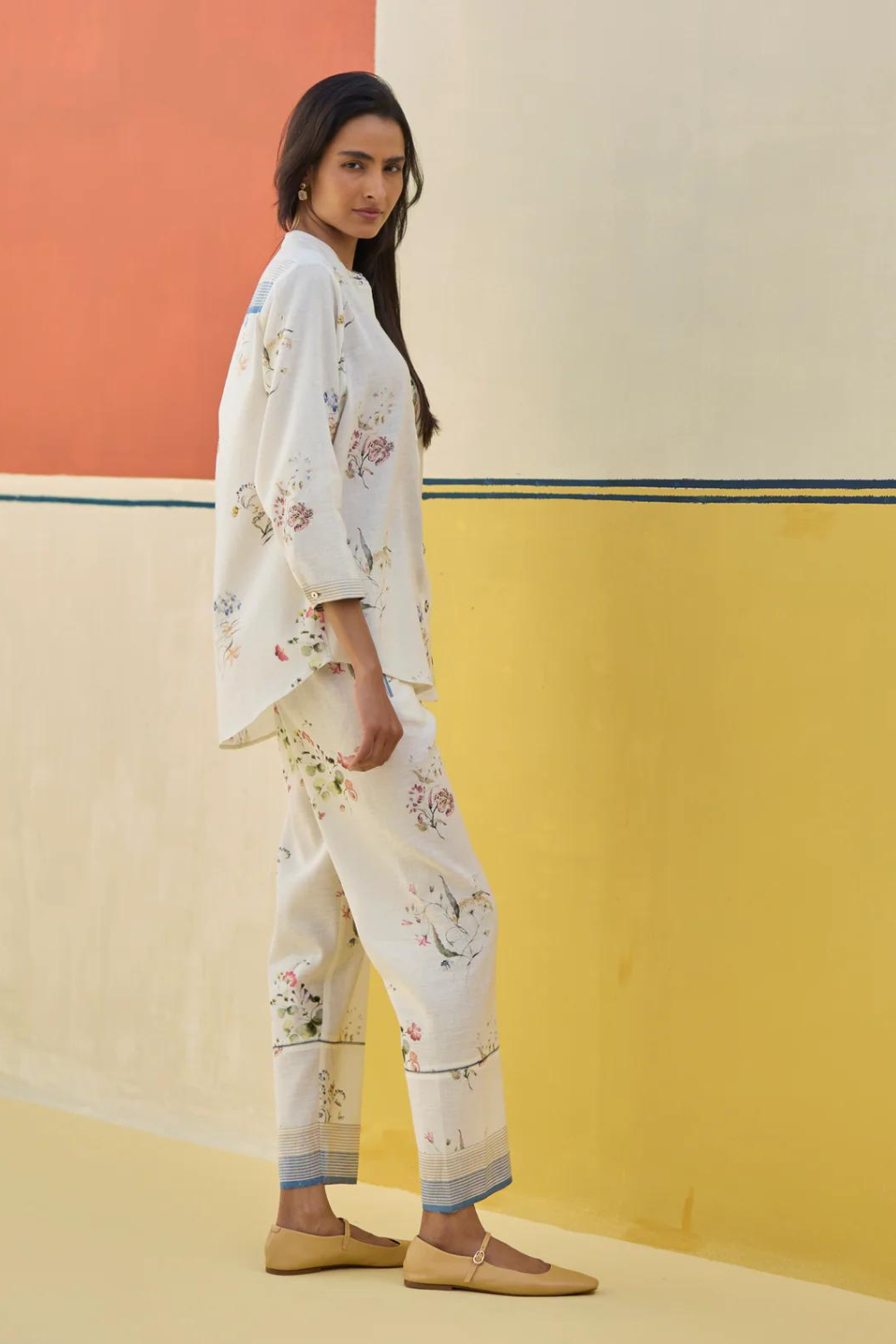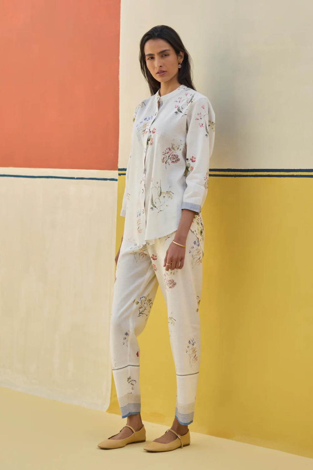 Shirt- A timeless mandarin collared shirt with 3/4th sleeves in our soft handloom linen cotton with handwoven stripe border on the placket. The shirt is printed with our hand-illustrated soft watercolour motifs finished with mother of pearl buttons . Pant- Classic palazzo pants handcrafted in our handloom linen cotton with a handwoven stripe border. Lyla has comfortable pockets, handmade jaali (mesh) detailing and an soft elasticated back waistband with a drawstring.