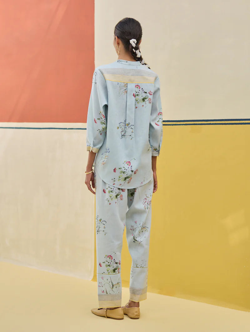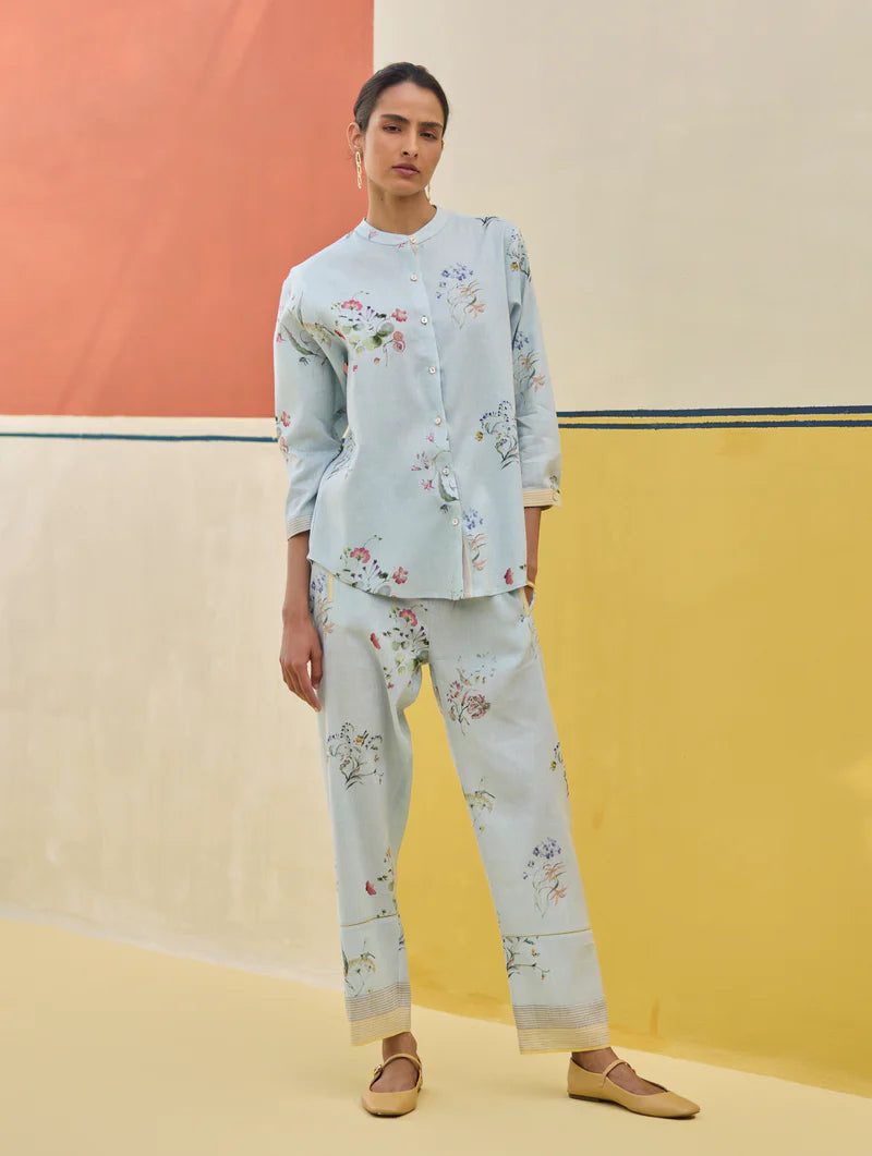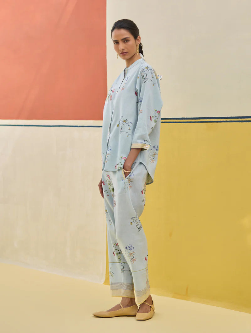 Shirt- A timeless mandarin collared shirt with 3/4th sleeves in our soft handloom linen cotton with handwoven stripe border on the placket. The shirt is printed with our hand-illustrated soft watercolour motifs finished with mother of pearl buttons. Pant- Classic palazzo pants handcrafted in our handloom linen cotton with a handwoven stripe border. Lyla has comfortable pockets, handmade jaali (mesh) detailing and an soft elasticated back waistband with a drawstring.