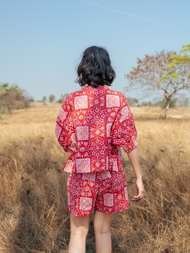 Wanderlust : A collection inspired by the free-spirited wanderlust in us and the adventures that we undertake. A collection of easy, ready-to-wear pieces hand block printed in fresh prints and colour palettes on summer-friendly cotton and mul. Kaftan sleeve top paired with high-rise shorts are what our summer uniform consists of. It loves all body types and we love it for all that it is. Cotton, handblock printed in brightest hues.